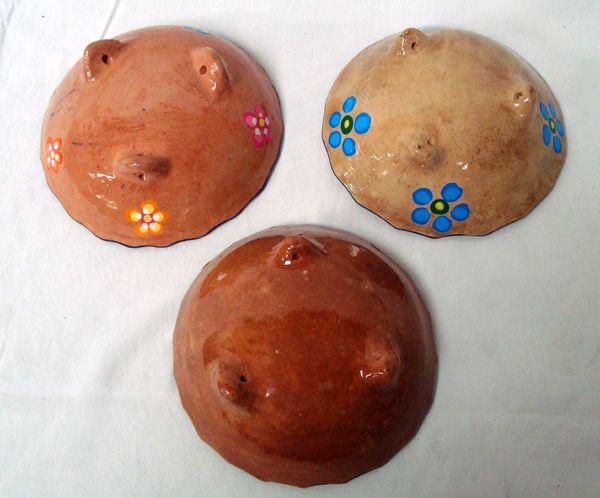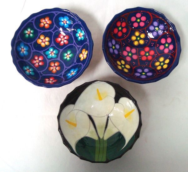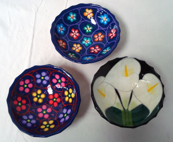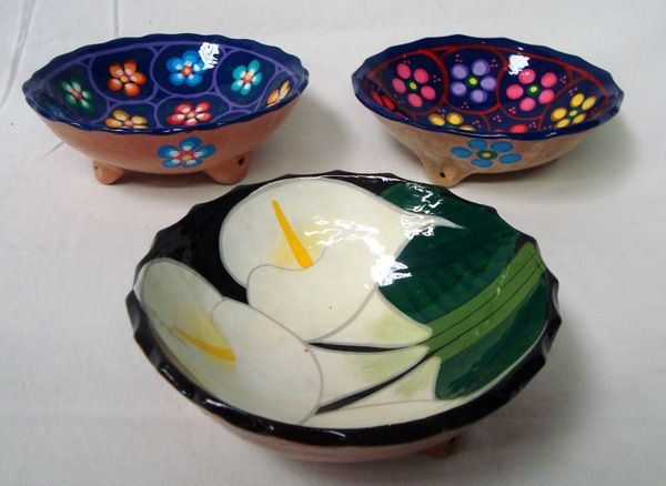 Set of 3 Oaxacan Footed Mexican Salsa Bowls. Oaxacan folk art is a tradition of Oaxaca, Mexico. These Vividly colored bowls show the intricate design used in on the clay pottery from this area. They measure approx. 5.5'' in diameter.