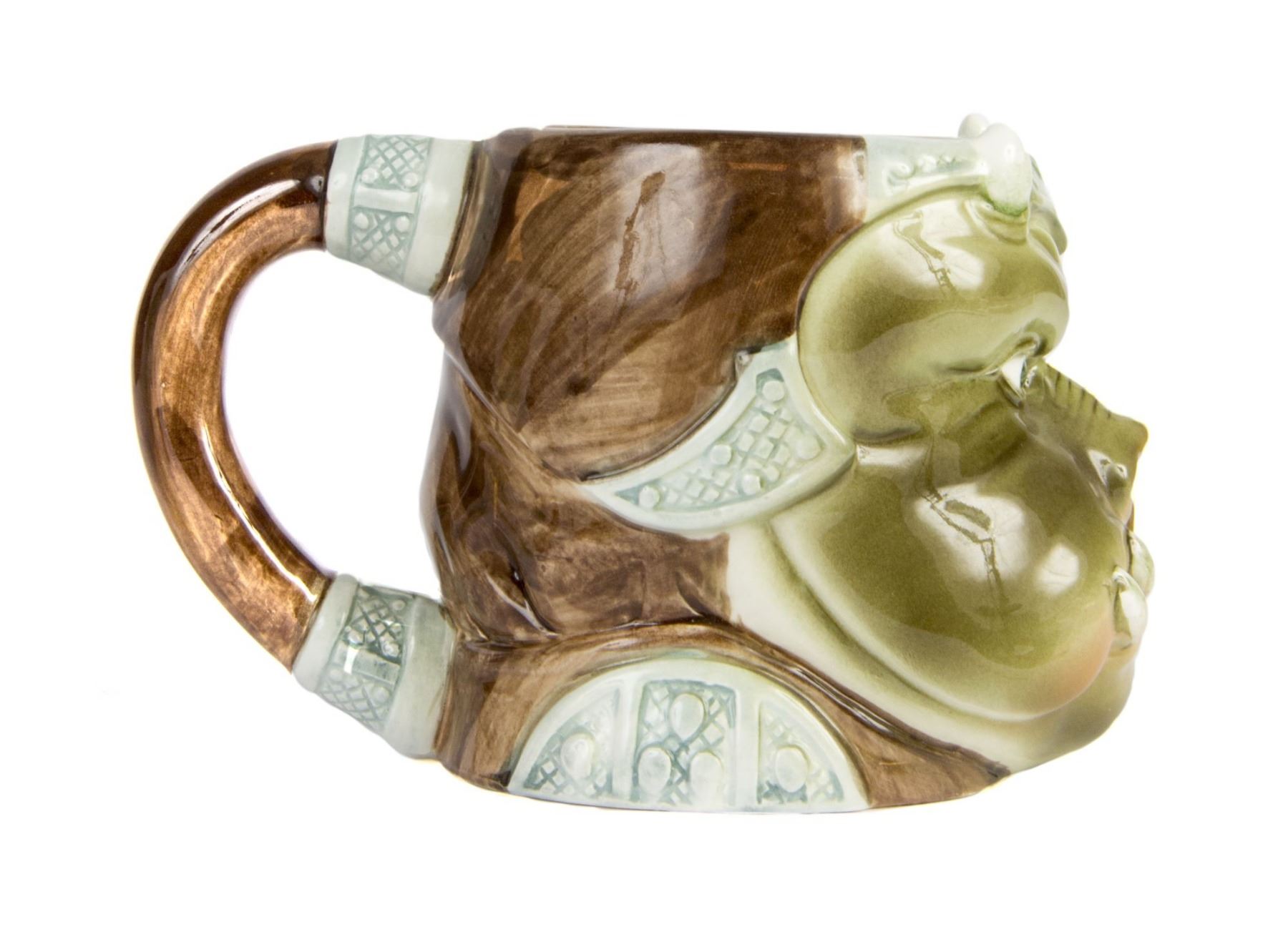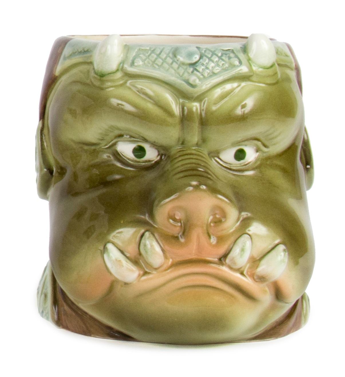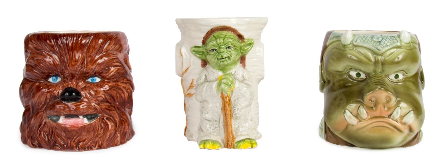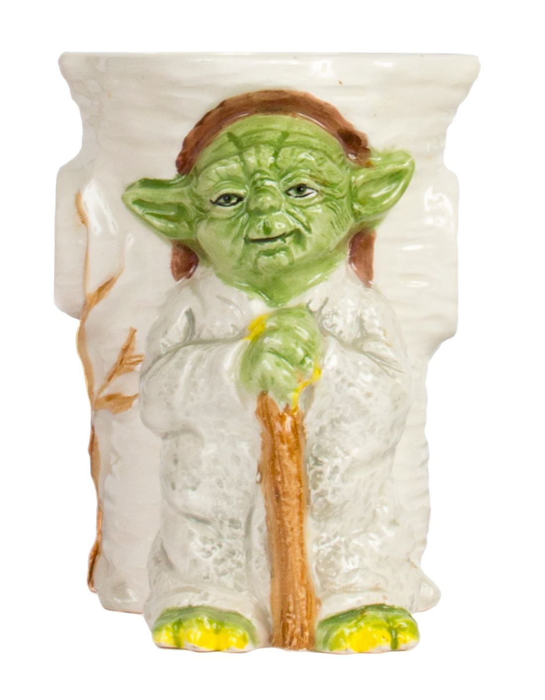 (LucasFilm, c.1983) A set of (3) hand-painted "Return of the Jedi" character mugs created by Sigma. The mugs depict Yoda, Chewbacca, and a Gamorrean Guard. The base of the Gamorrean mug has a "Return of the Jedi" logo while the others do not. The mugs measure 4" tall with the exception of Yoda, which measures 4.5" tall. The condition is very good overall with some spots of wear.