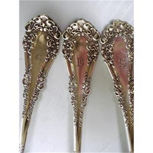 BEAUTIFUL SET CONSISTING OF 3 LARGE SERVING SPOONS, WITH BEAUTIFUL VICTORIAN PATTERN AND ENGRAVED MONOGRAM " B" - MADE BY 1847 RIGERS BROS A1 - as per images - each measures about 8 1/2" long - Very fine condition, free of dents and showing no significant ware - It is fresly polished AND READY TO BE USED.US Buyer to pay 7.00 for shipping plus insurance, THANKS.