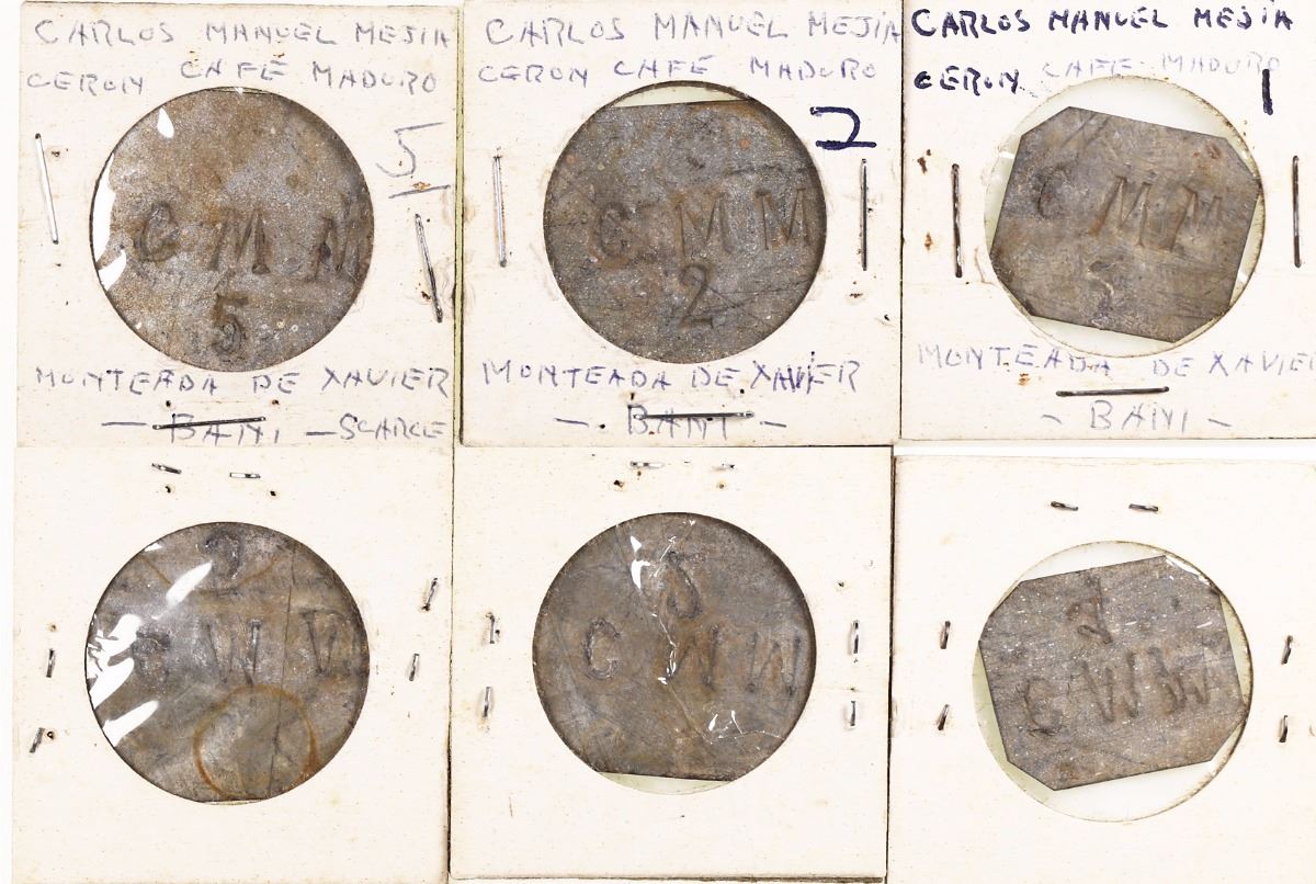 Set of 3 Santo Domingo, Dominican Republic, base-metal token 1, 2 and 5 cents, "CMM" (Carlos Manuel Mejia, Ceron Café Maduro, Monteada de Xavier, Bani), rare, ex-Roehrs collection. Graduated sizes but each with simple stamps for CMM and denomination, the metal somewhat oxidized and lightly encrusted. Pedigreed to the Ed Roehrs collection and left in his original cardboard holders with handwritten attributions.