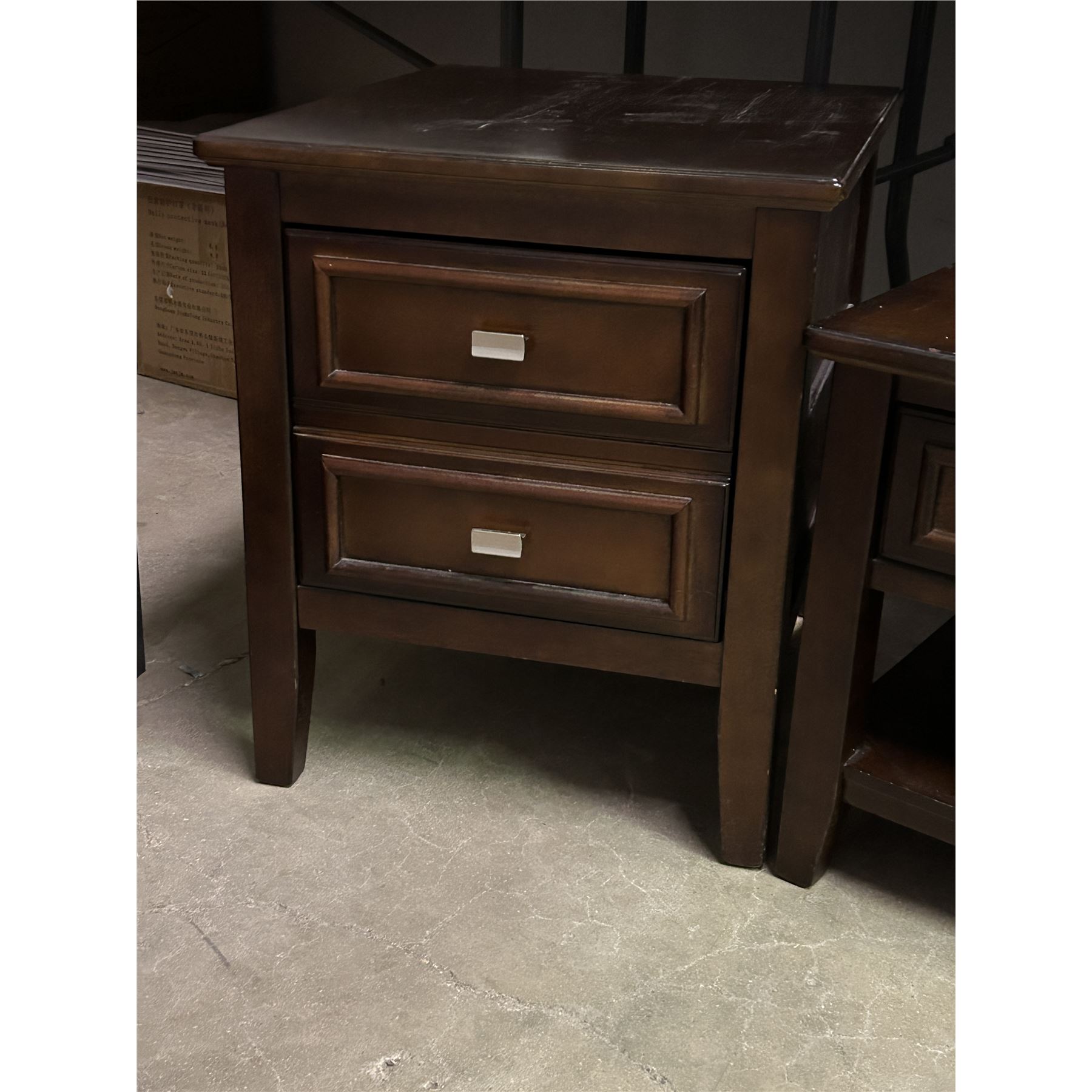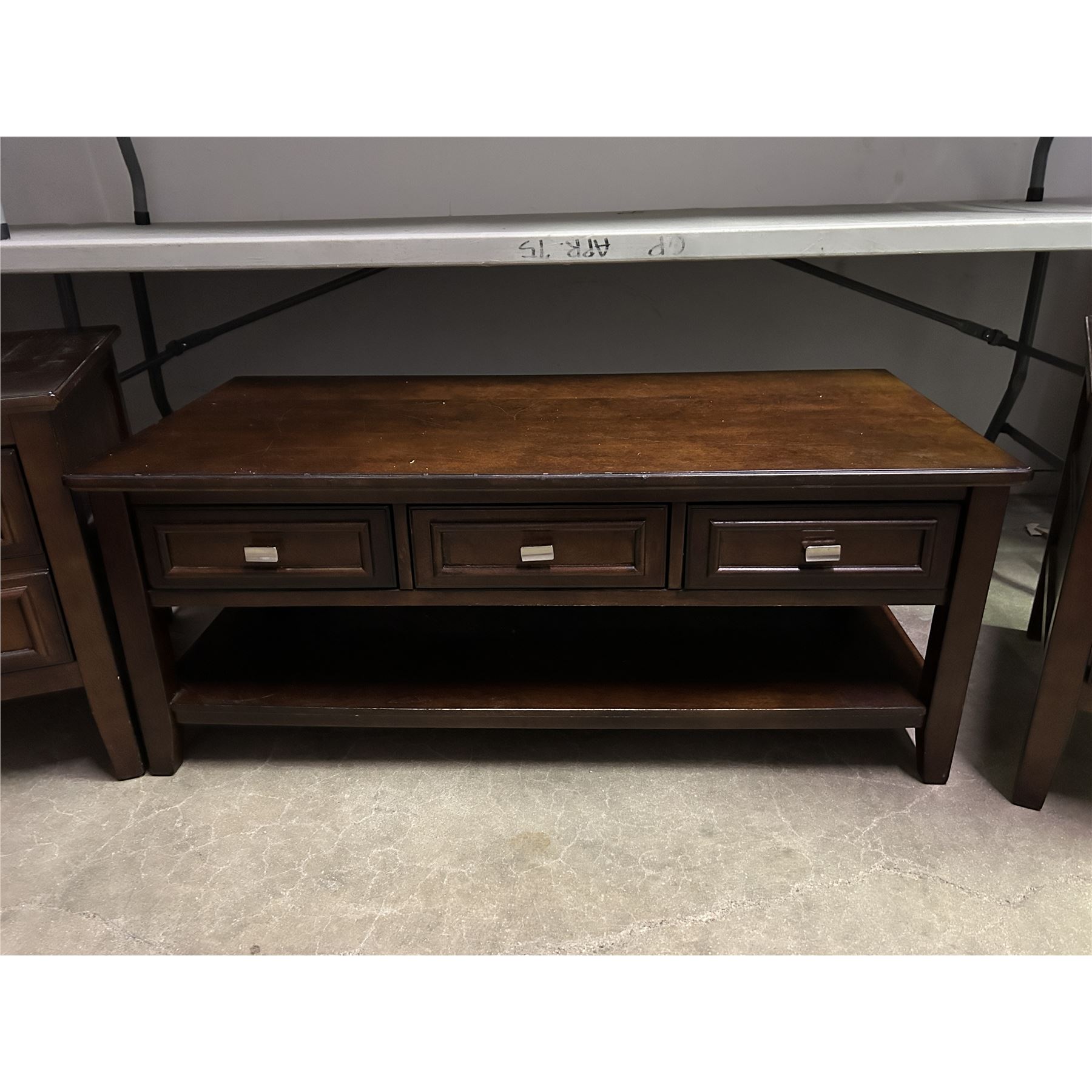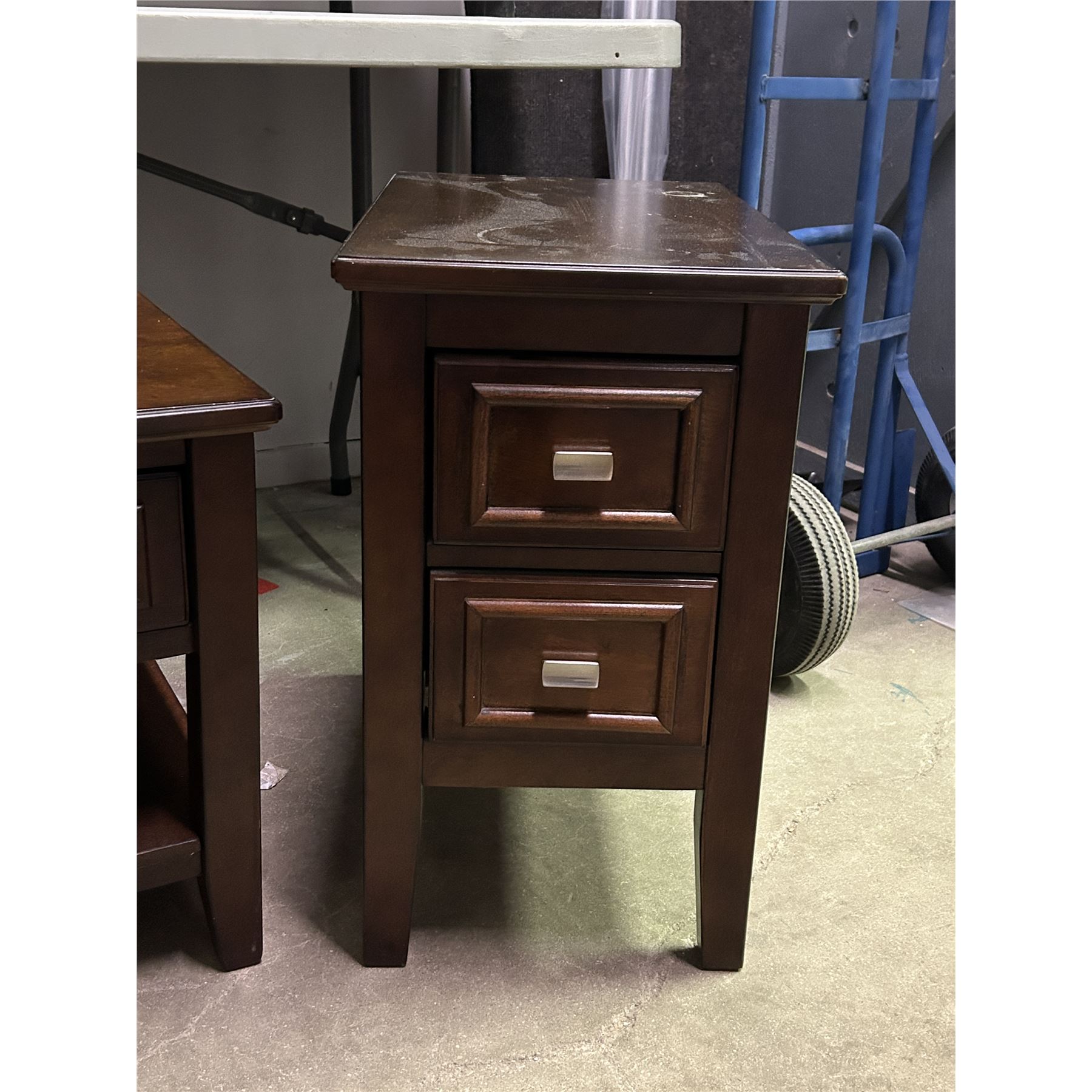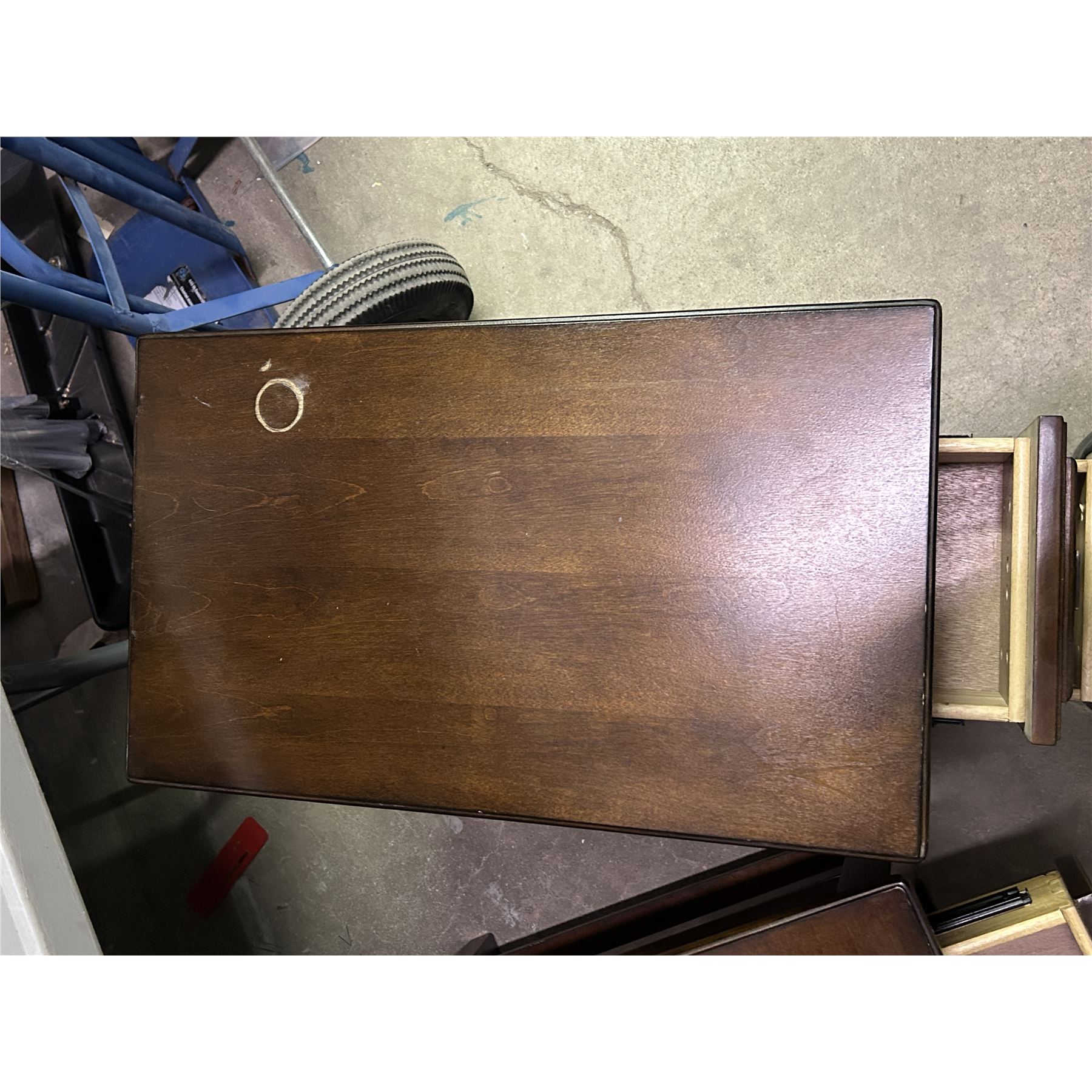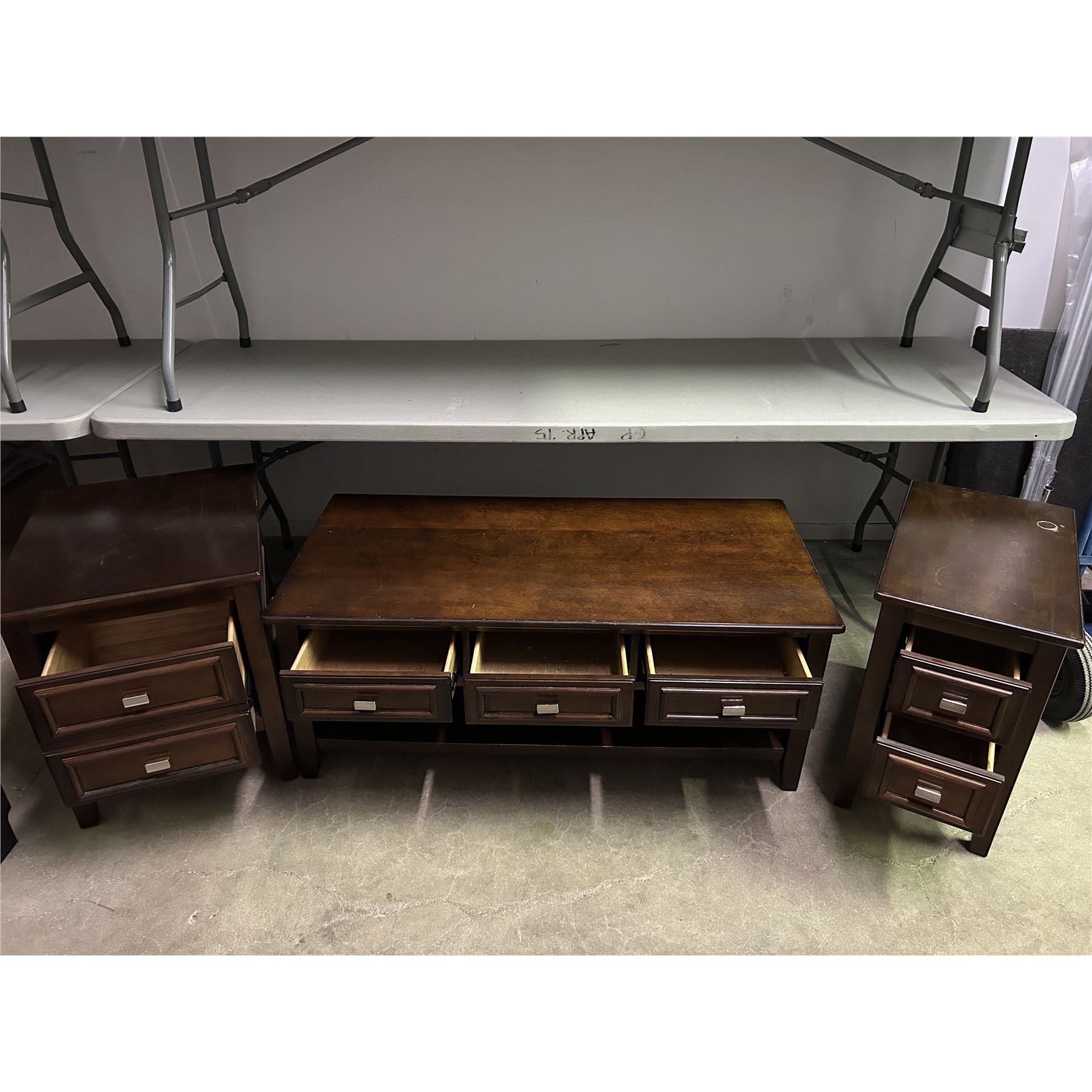 Coffee table is 47” x 24” x 19”. Left wide side table is 20” x 24” x 23”. Skinny table is 14” x 24” x 23”. There is a cup ring damage on one top.