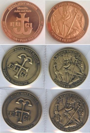 Set of 3 St. Eligius Medals (2 varieties): 2 of the 3 are the same variety 1-1/2 inches diameter by .094 inch thick, smooth edge made each of Antique Highlighted Copper and Antique Highlighted Bronze and only 50 pieces were made [Medal design by Judy Blackman, graphic layout by Astrid Bond, obverse sculpted by Arthur Chan and reverse by Fred Chan, Bas Relief was cut into die by Fred Chan, production by Pressed Metal Products Limited Vancouver B.C. owned by Alan and Greg Trammell — note this company does not sink dies]. The other Medal is one of 50 Copper Proof Like and has the same production, designer, etc. as the other two.