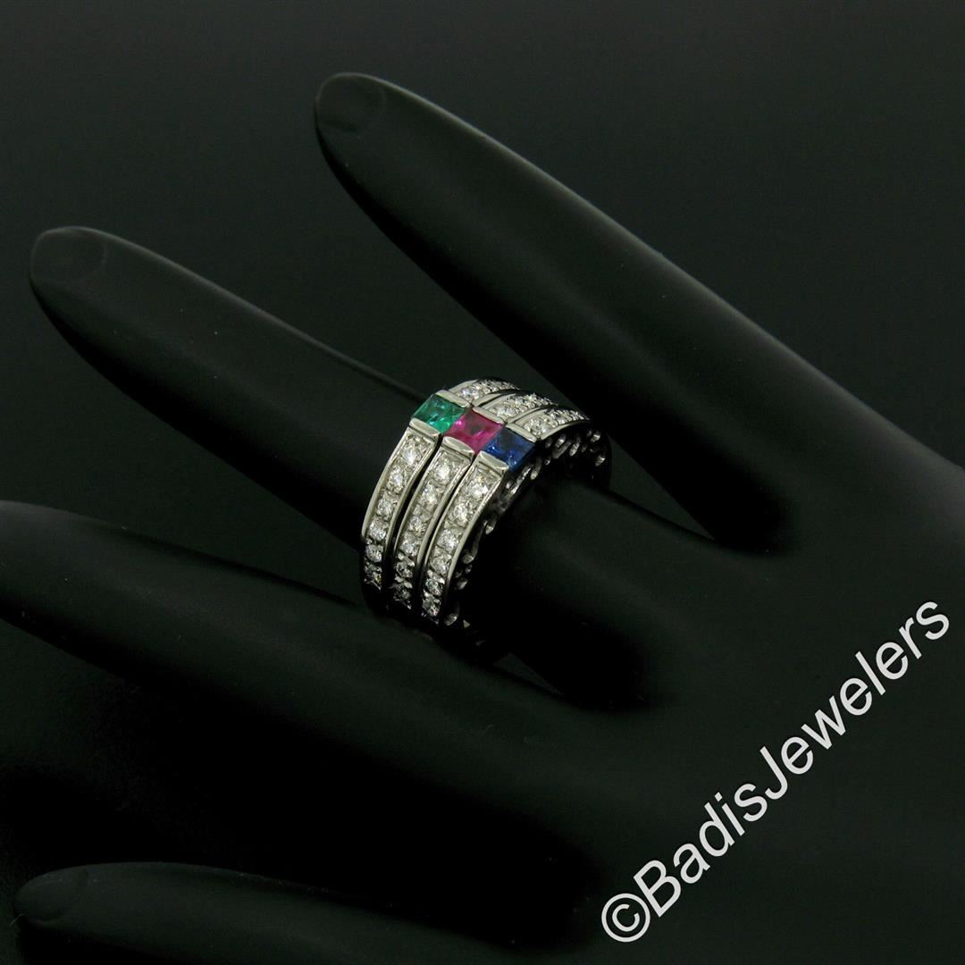 An excellent condition set of 3 18kt white gold band rings with each featuring a different princess cut gemstone (0.16ct ruby, 0.13ct sapphire, and 0.10ct emerald) and 0.20ctw of round diamonds (F/G - VS1/VS2). The rings are size 8, weigh a total of 11.38 grams, and each measure 3.0mm wide.