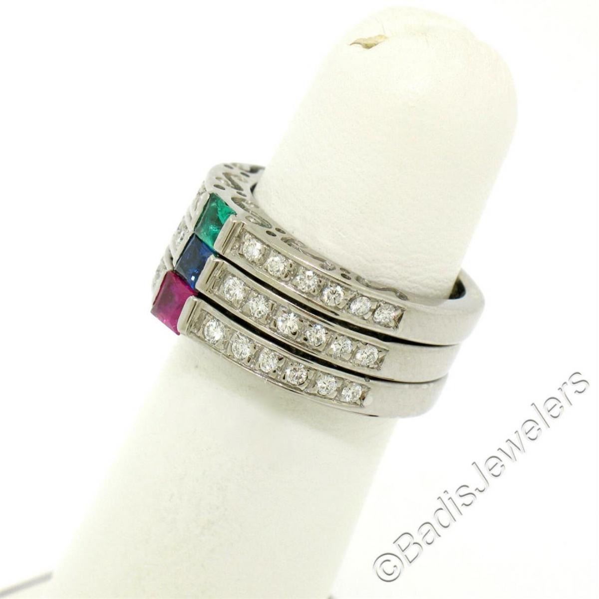 An excellent condition set of 3 18kt white gold band rings with each featuring a different princess cut gemstone (0.16ct ruby, 0.13ct sapphire, and 0.10ct emerald) and 0.20ctw of round diamonds (F/G - VS1/VS2). The rings are size 8, weigh a total of 11.38 grams, and each measure 3.0mm wide.