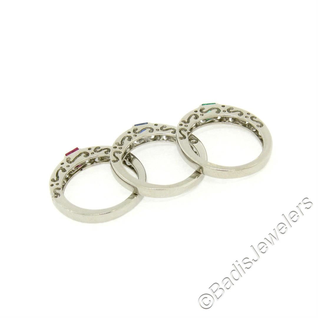 An excellent condition set of 3 18kt white gold band rings with each featuring a different princess cut gemstone (0.16ct ruby, 0.13ct sapphire, and 0.10ct emerald) and 0.20ctw of round diamonds (F/G - VS1/VS2). The rings are size 8, weigh a total of 11.38 grams, and each measure 3.0mm wide.