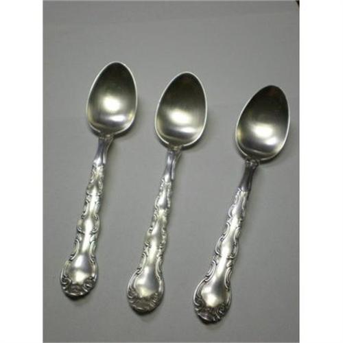 Set of 3 Sterling Silver Spoons. In good but used condition. Each have the normal usage scratches. Each are marked on back: ALVIN STERLING, FRENCH SCROLL. All three spoons weigh approximately 3 ounces. Still very useable.