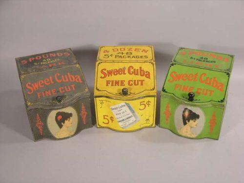 Set of 3 Sweet Cuba fine cut store tobacco tins. Green/Yellow/Black, all in good cond. 8"x 8" x 11".