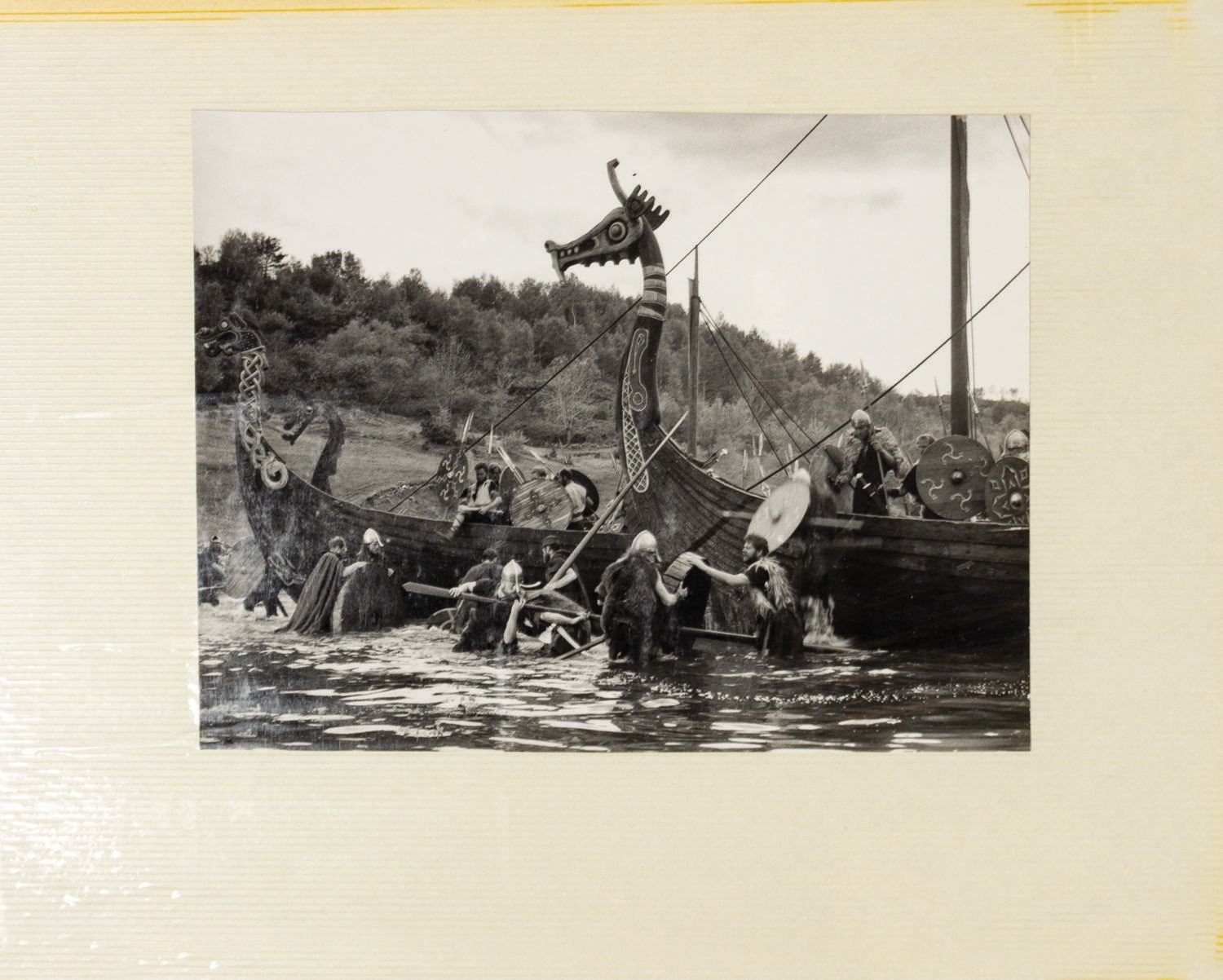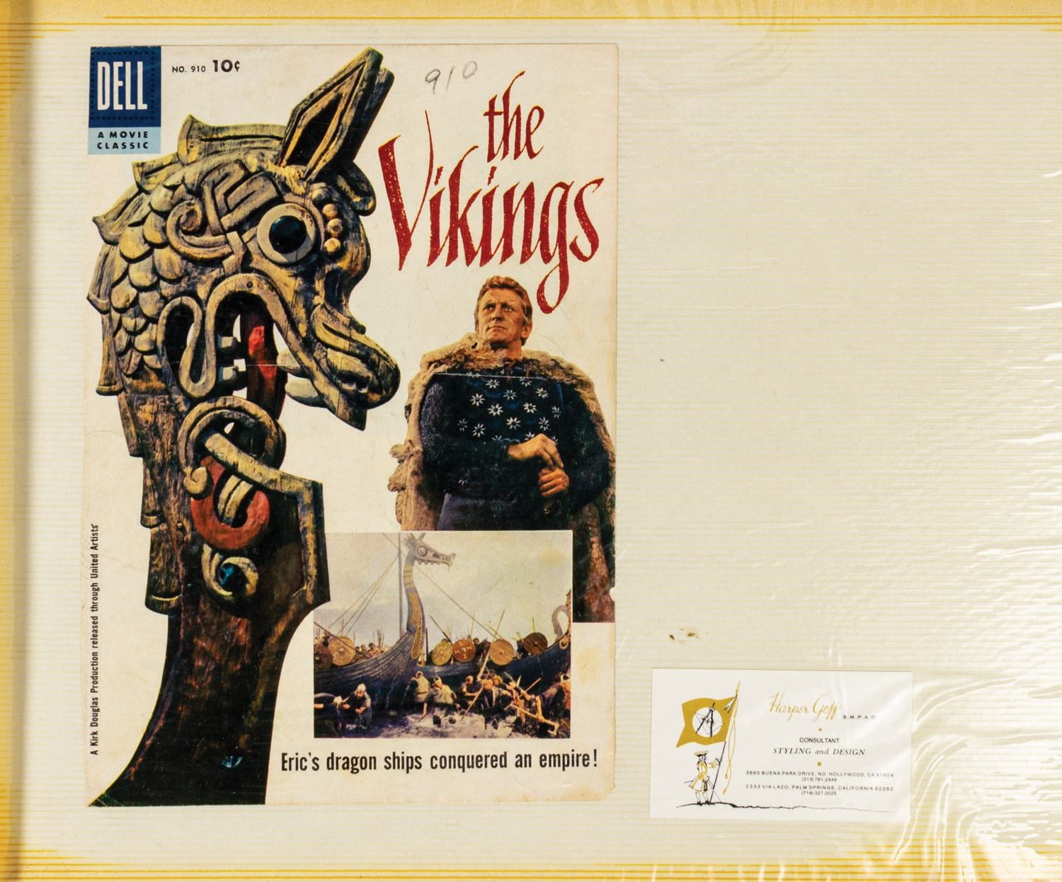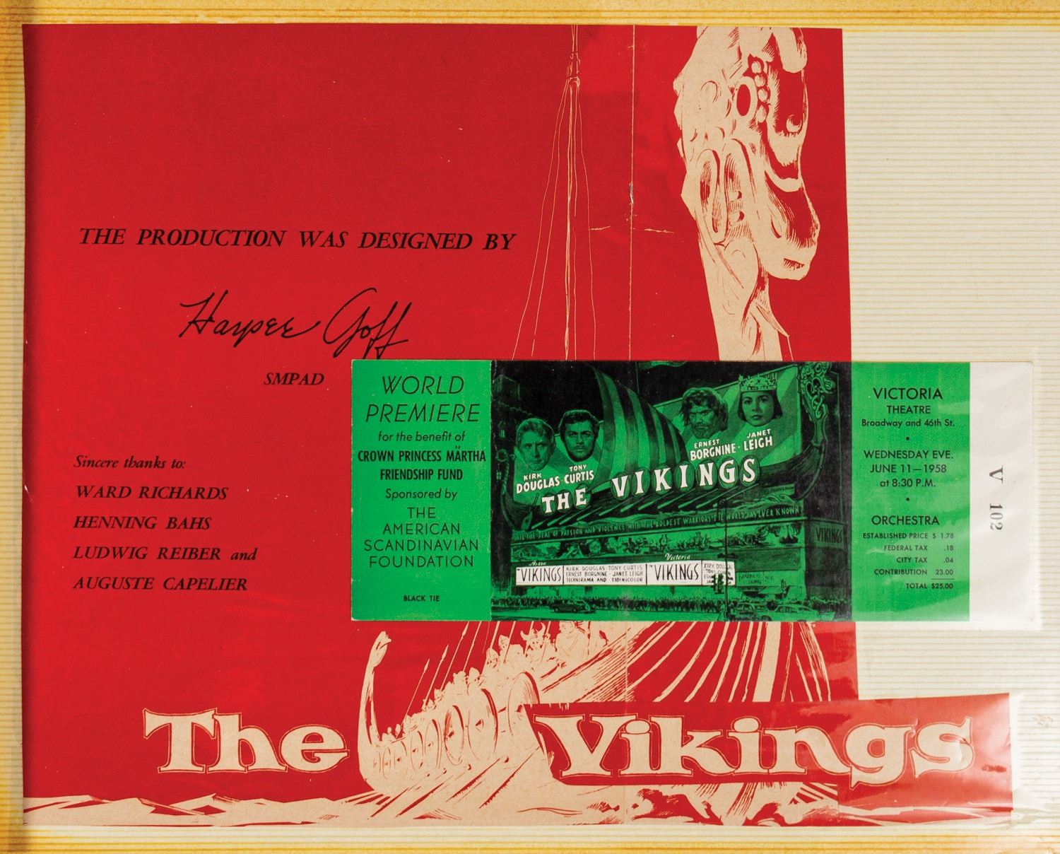 (United Artists, 1958) A set of (3) reference binders for The Vikings from the collection of Harper Goff. These binders are Goff's personal record of his time spent during the creation of the film The Vikings, including his time in Norway, France, and Munich. The binders contain photographs and photostatic prints of reference drawings, as well as other paper goods such as newspapers and promotional materials. Also included is an original typewritten letter from Kirk Douglas to Harper Goff. Douglas signed the letter in ink. Measuring 12.5"x16.5" each, the three binders contain (38) double-sided pages total. The condition is good with some expected wear from age and use, including some edge-wear on the binders and discoloration along the edges of the pages. There is some peeling to the thin plastic protective covers on some of the pages.