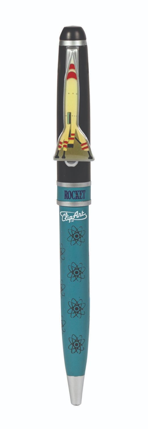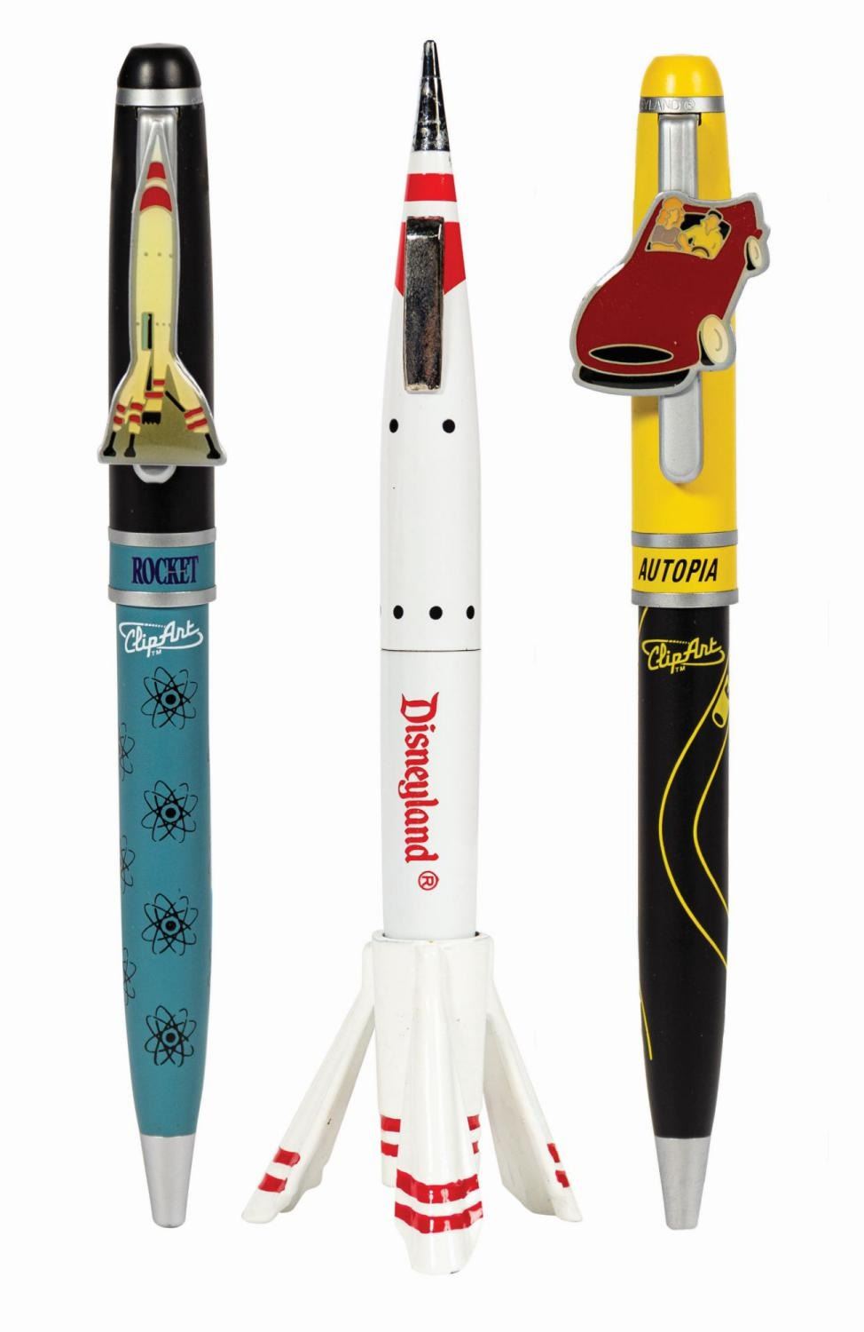 (Disneyland, c.2000s) A set of (3) Tomorrow-land themed ballpoint pens. The set includes a ClipArt brand Autopia pen, a ClipArt brand Rocket to the Moon pen, and a Rocket to the Moon rocket form pen with stand. All pieces are accompanied by their original packaging. The ClipArt pens each measure 5.25" long and the rocket-shaped pen stands 7" tall. The ClipArt pen cases are 6"x2.5" and 1.25" deep, while the plastic cylinder housing the rocket is 7.5" tall x 3" in diameter. The pens are in fine, as-new condition. The packaging exhibits some scuffs and surface wear.