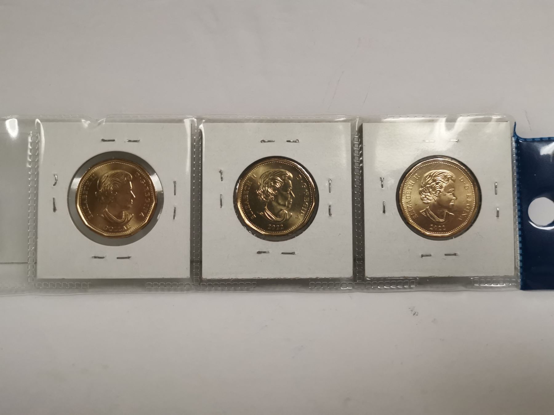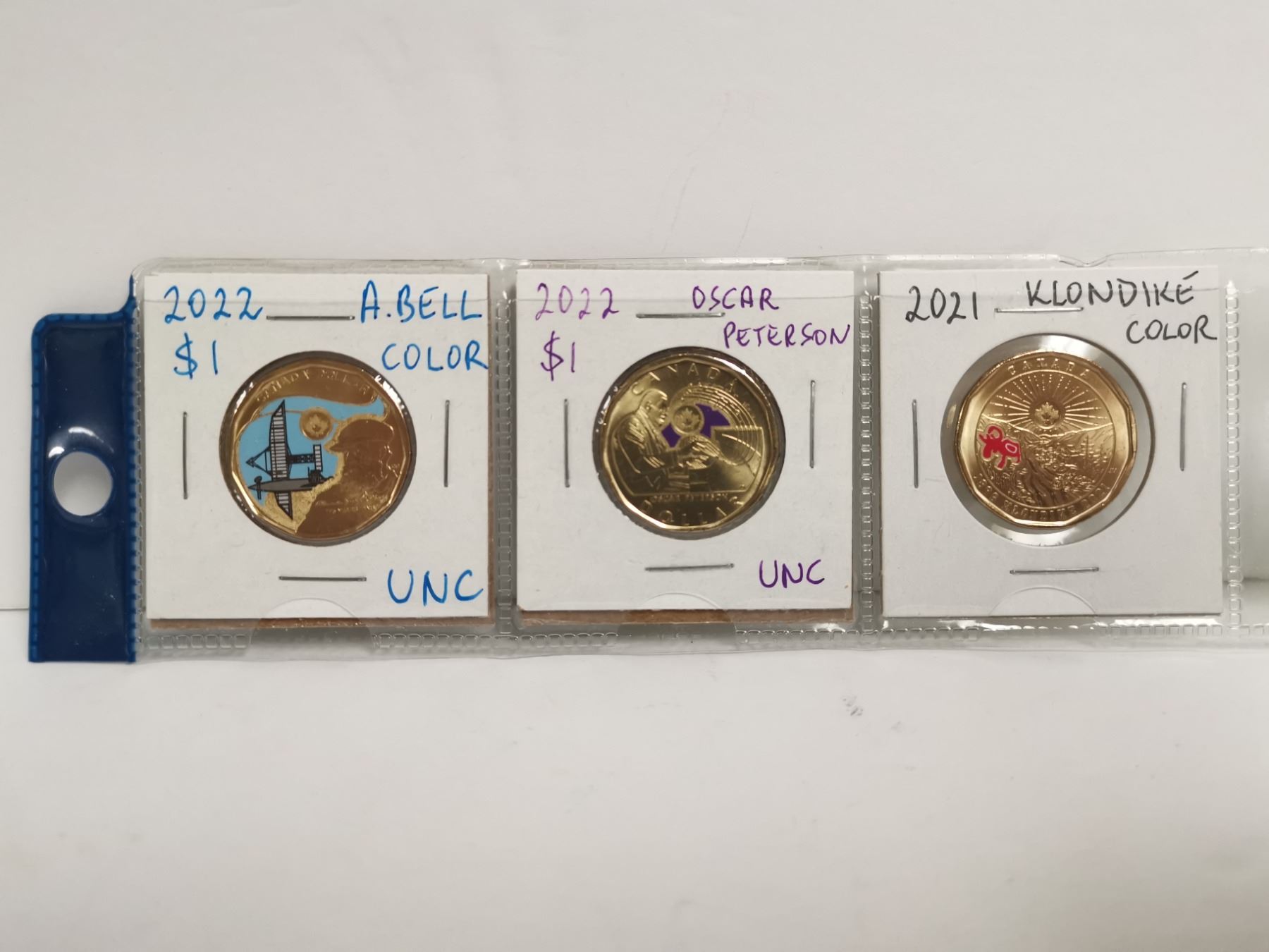 Set of 3, UNC colored 1 dollar loonies - Bell, Peterson and Klondike