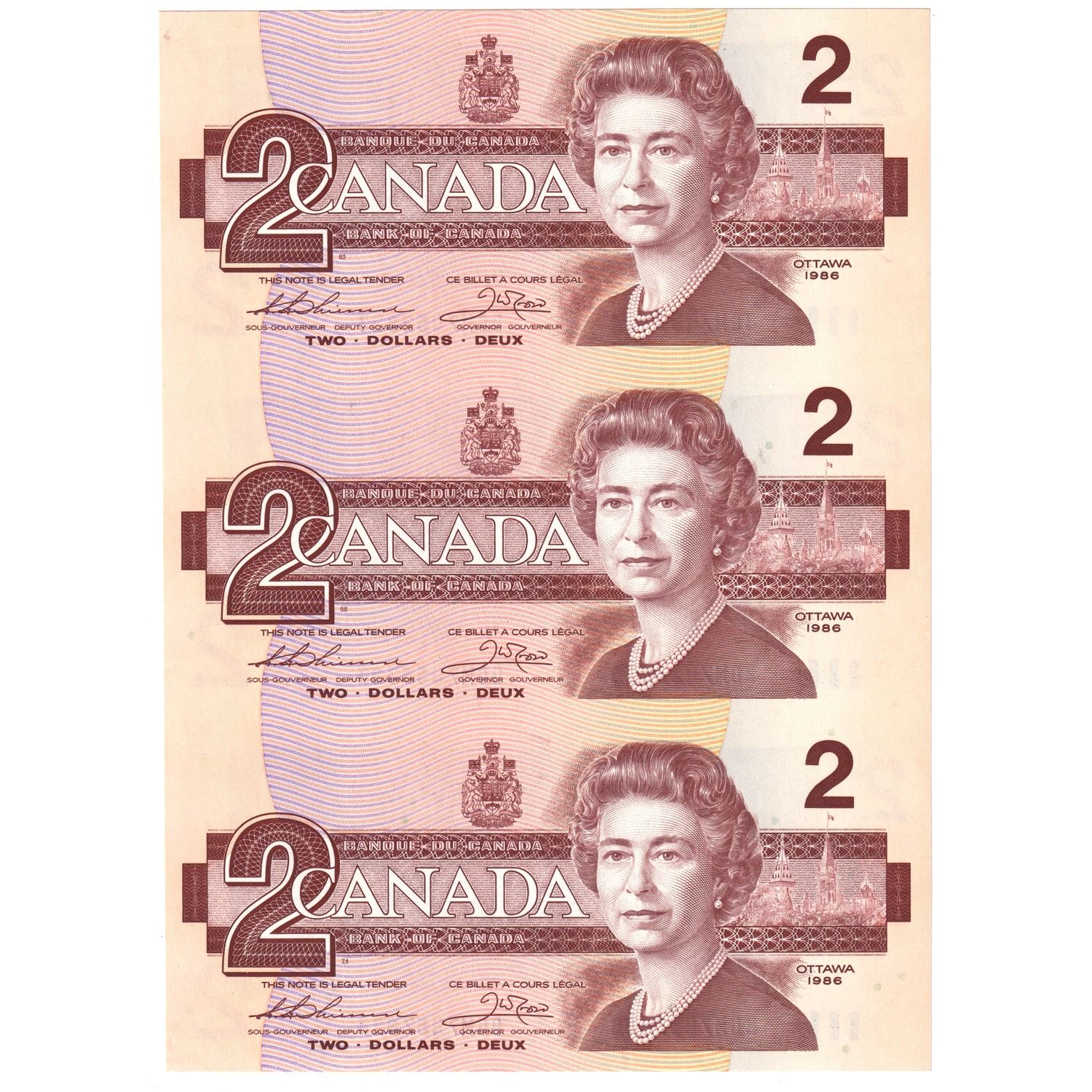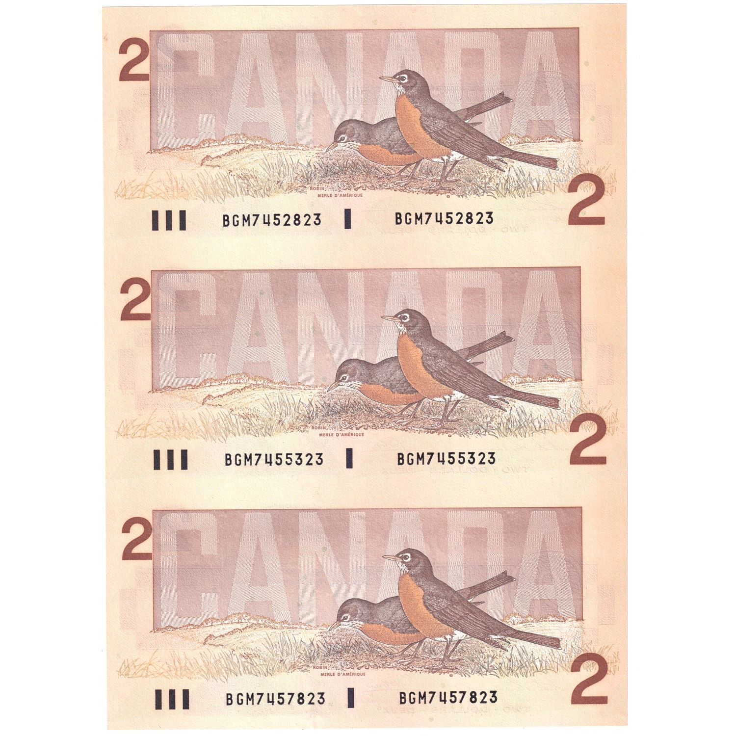 Set of 3 Uncut 1986 $2 BC-55b (two small B's) Theissen-Crow S/N: BGM7452823/7455323/7457823. UNC *Scarce*
