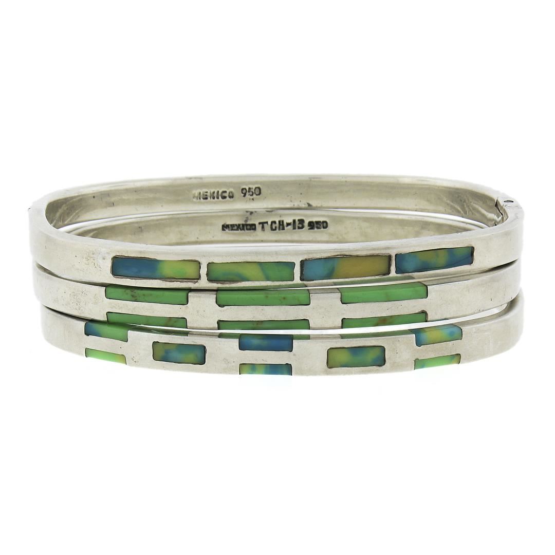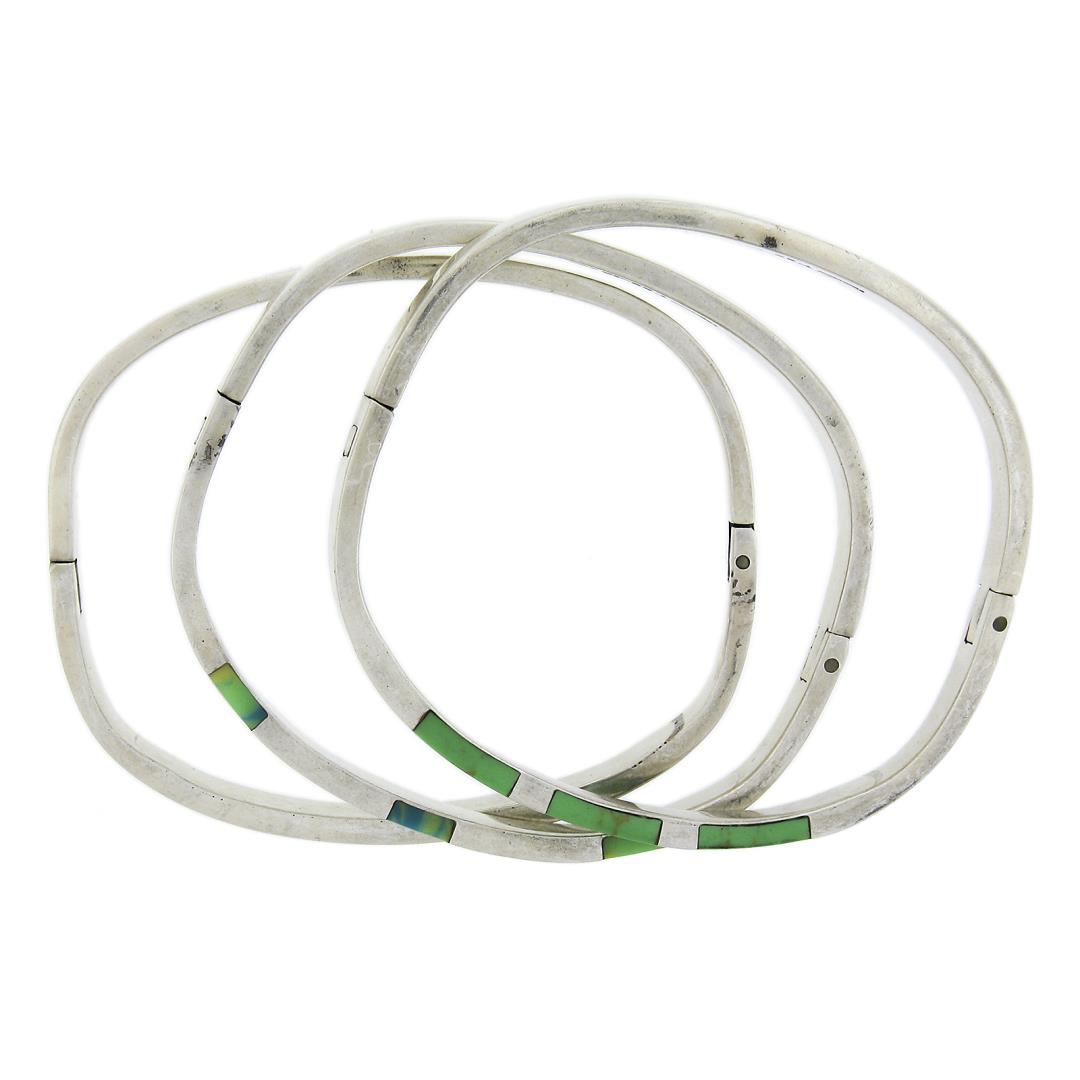 A vintage solid silver set of 3 bangle bracelets, with inlaid set natural turquoise. It weighs a total of 67.7 grams, measures 14.6mm wide, and measures 6.75 inches in length.