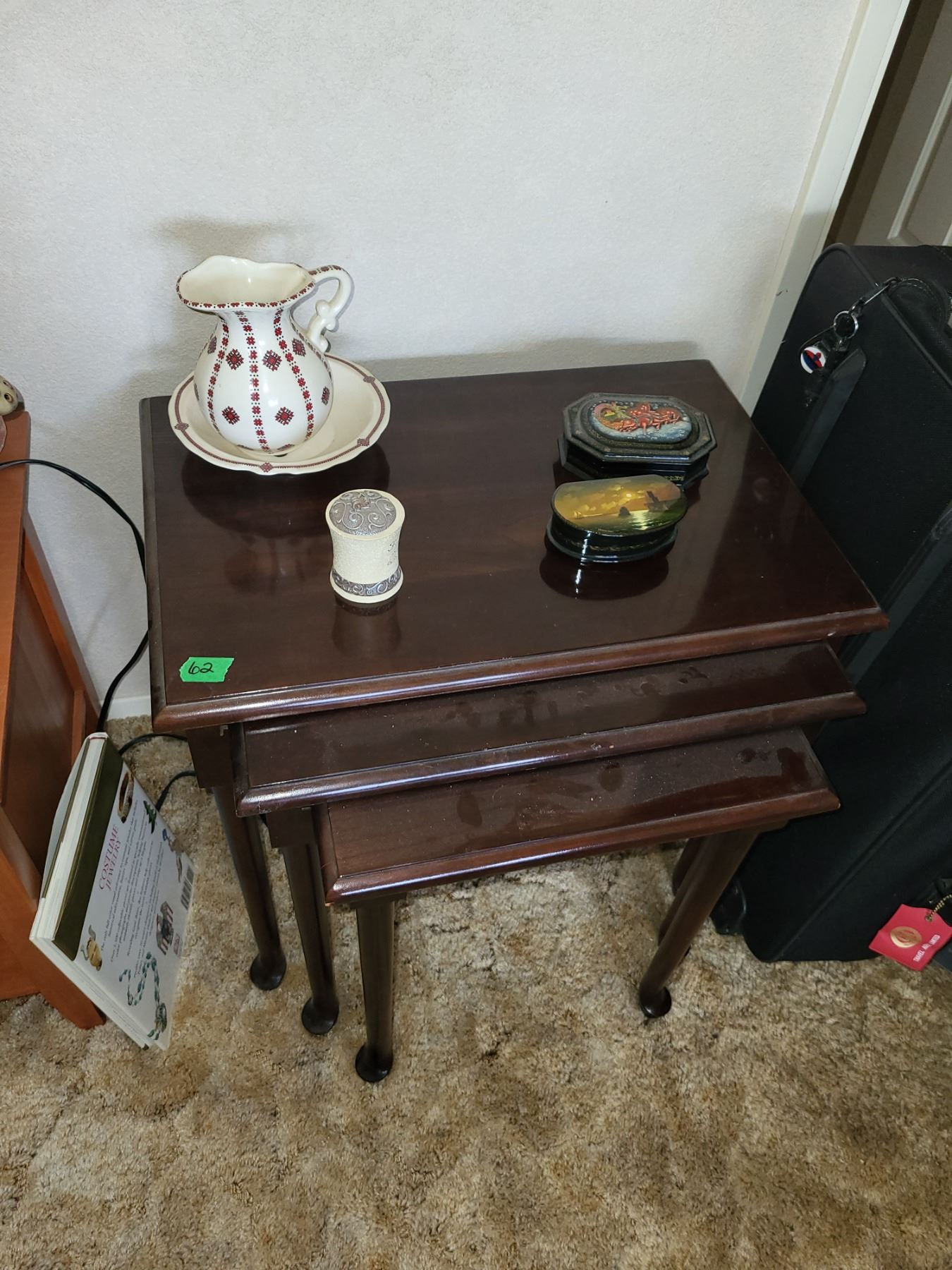 Set of 3 Vintage Nesting Tables + Collectible Contents on Top. Large to Small Measures: 24x16" 20x16", 16x16"
