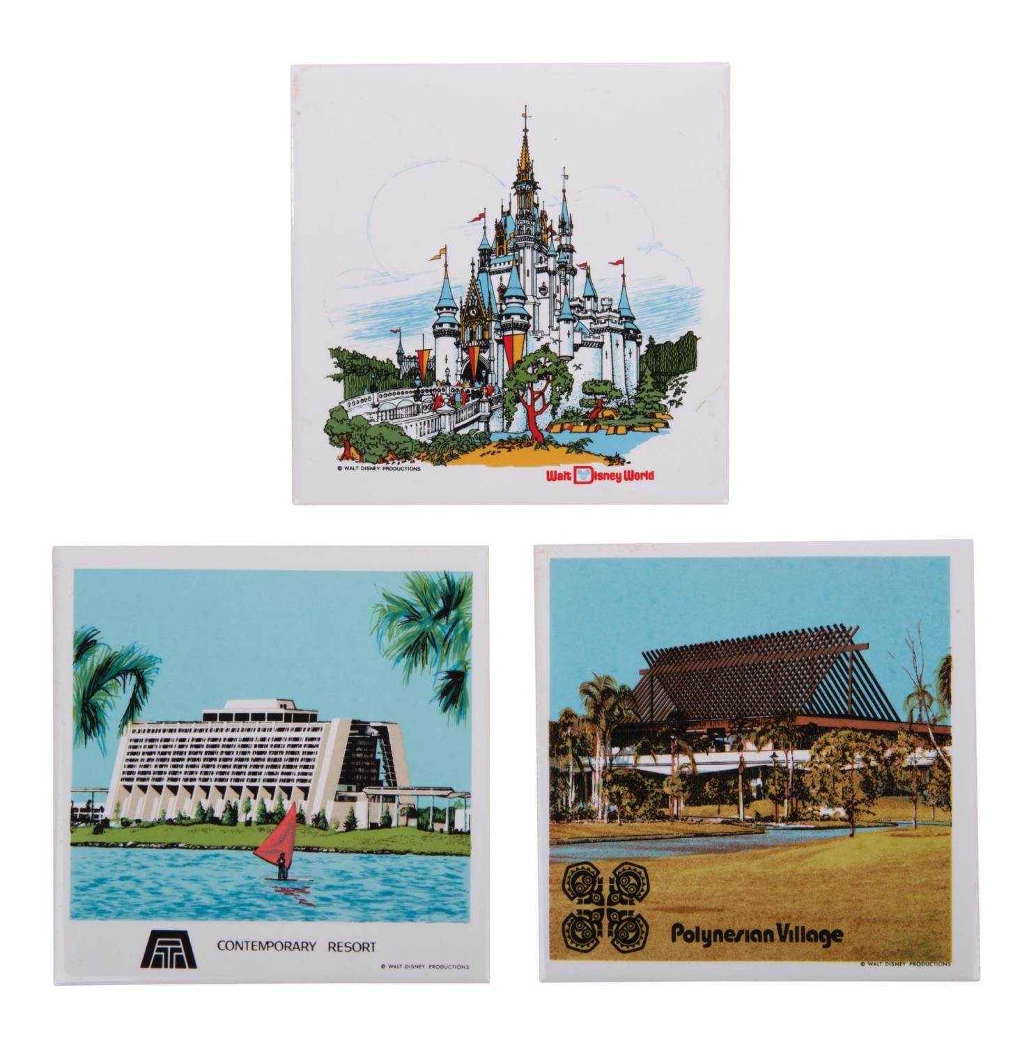 (Walt Disney World, c.1971) A set of (3) Walt Disney World Resort ceramic trivet tiles. Each of the (3) tiles feature colorful depictions of Walt Disney World landmark destinations including Cinderella's Castle at Walt Disney World, the Contemporary Resort Tower, and the Polynesian Village Great Ceremonial House. Measuring 6"x6" the ceramic tile trivets are in fine condition with very minor wear, retaining their original cork backing, and pristine painted and glazed artwork.