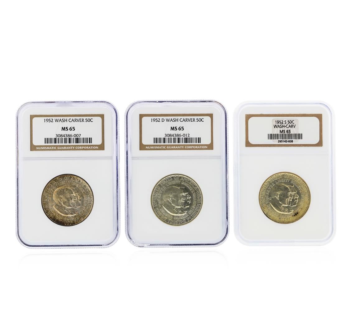 This set includes (3) Washington-Carver Commemorative Half Dollar Coins including: 1952-S NGC Graded MS65, 1952-D NGC Graded MS65, and 1952 NGC Graded MS65. NGC Certified.