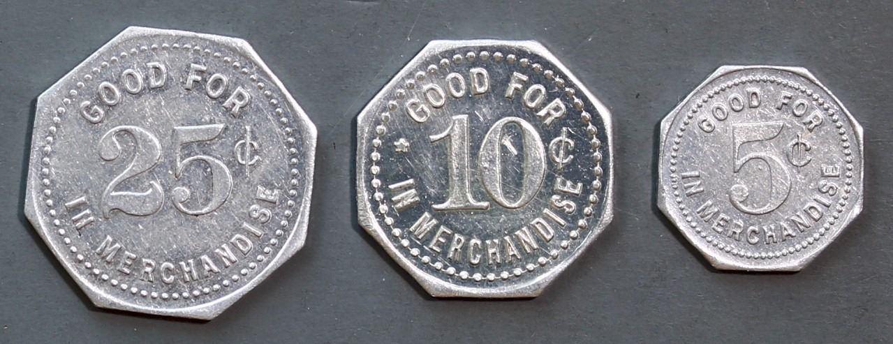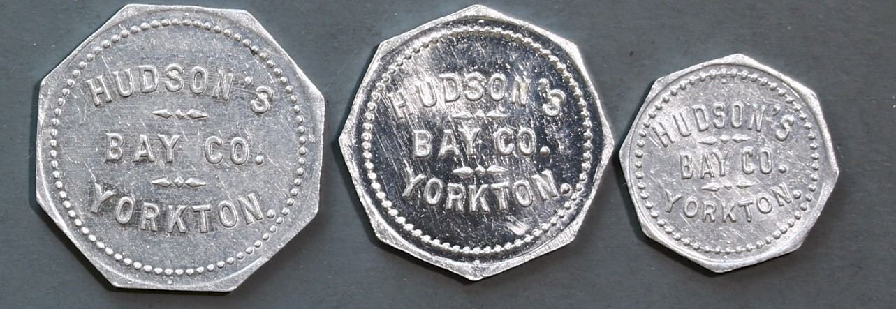 Set of 3 Yorkton Hudson Bay Company tokens – 5 cent piece. 10 cent piece and 25 cent piece sold as a package of three. As the local settlers demanded a currency, the set of 5 pieces ( there is also a 50cent piece and $1.00 )were originally struck in 1898. Interestingly, there is no record on these being authorized by the parent HBC so may have been done as a local initiative.