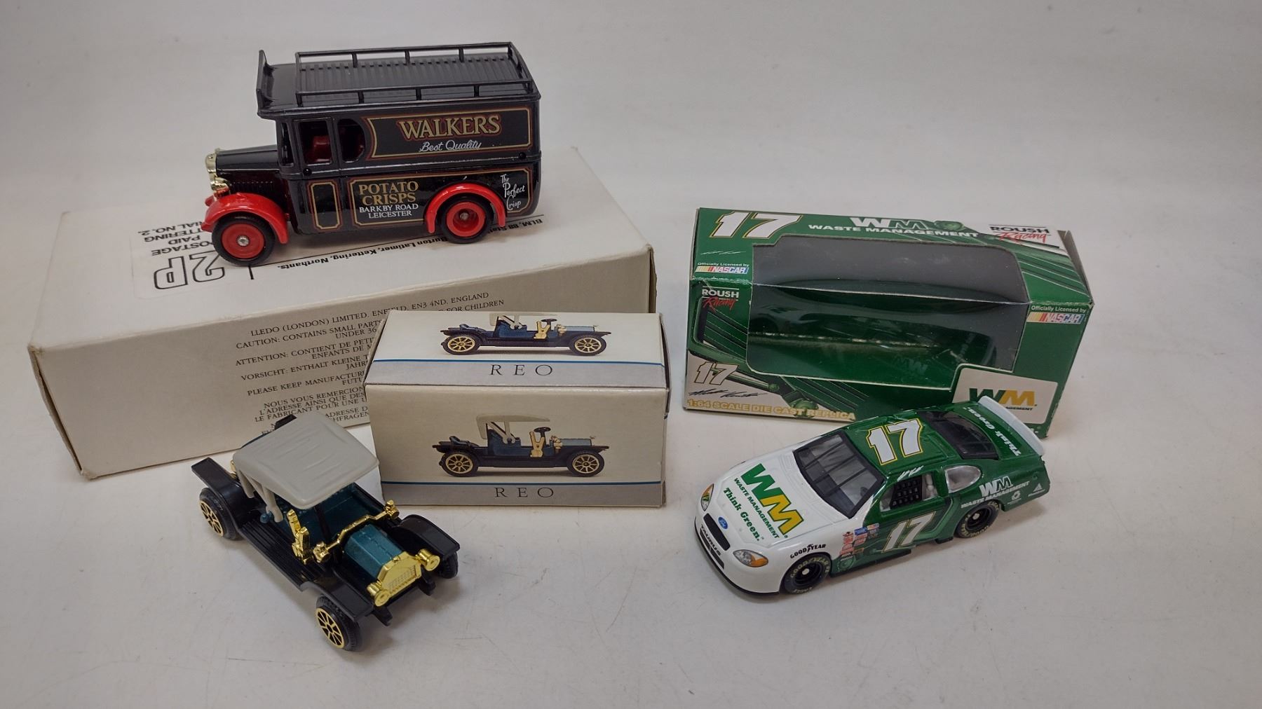From top left to right: Lledo walkers potato crisps van, #17 Matt Kenseth Nascar race car, Reader's Digest Reo No. 212 box car