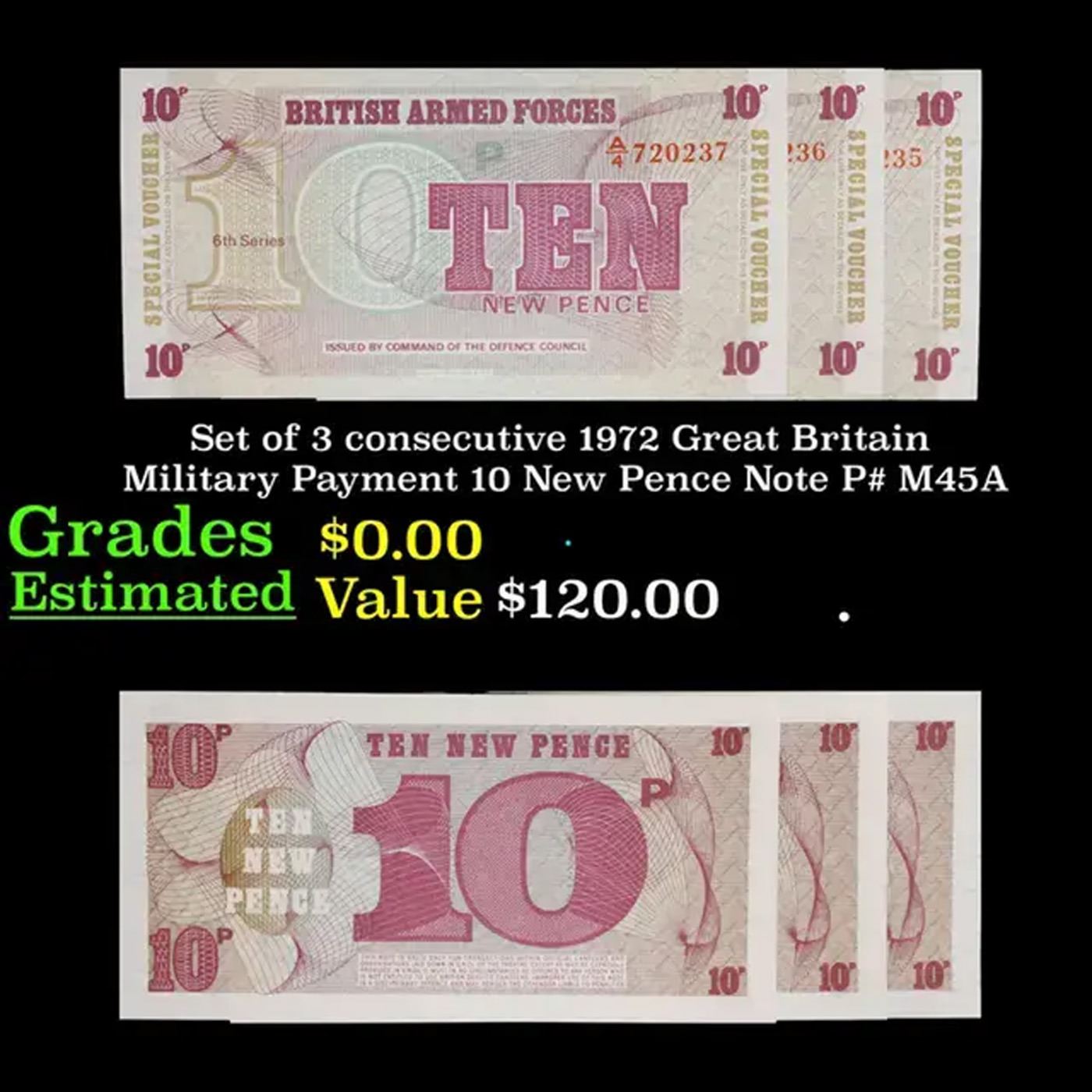 Set of 3 consecutive 1972 Great Britain Military Payment 10 New Pence Note P# M45A Grades CU.