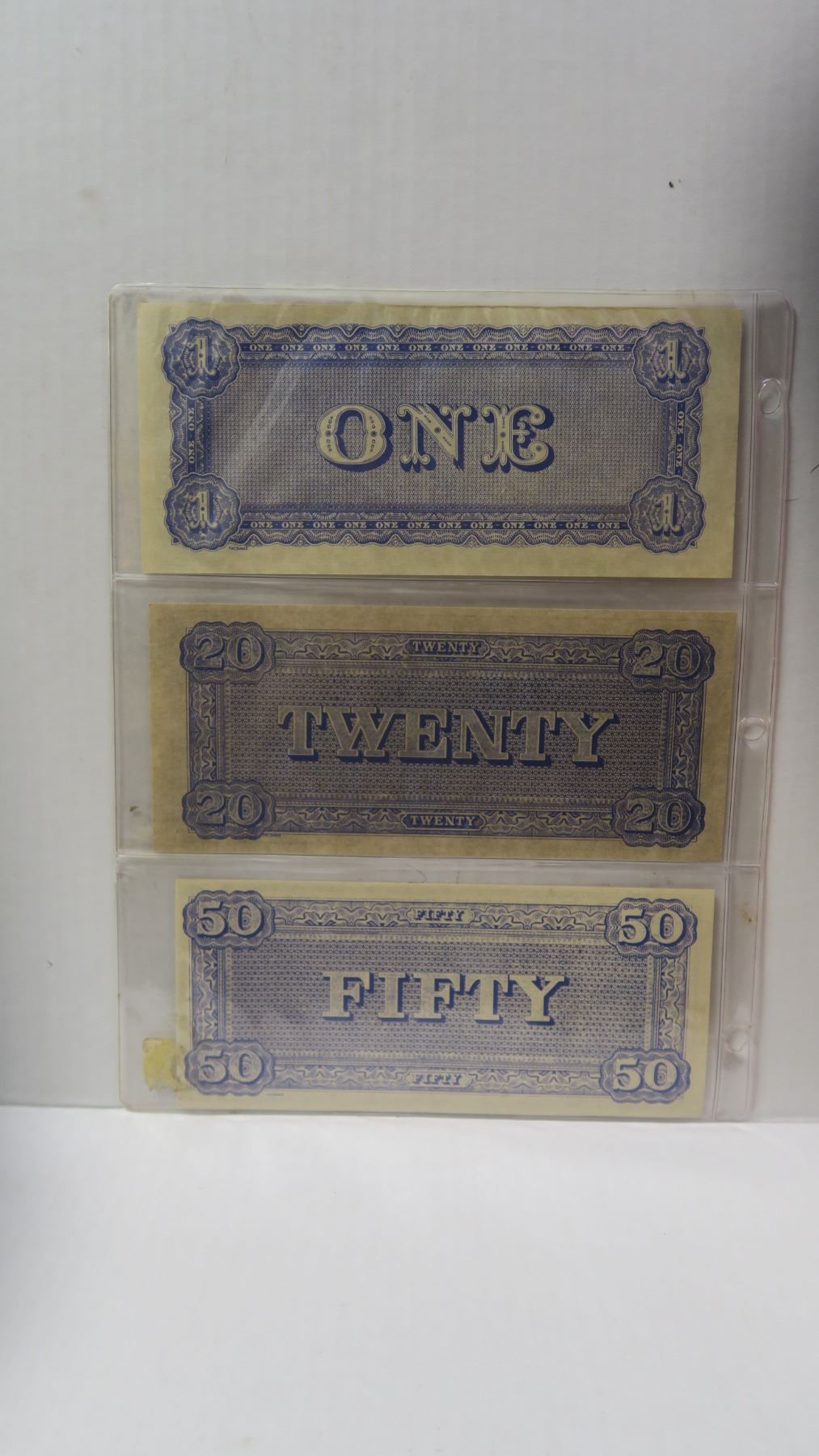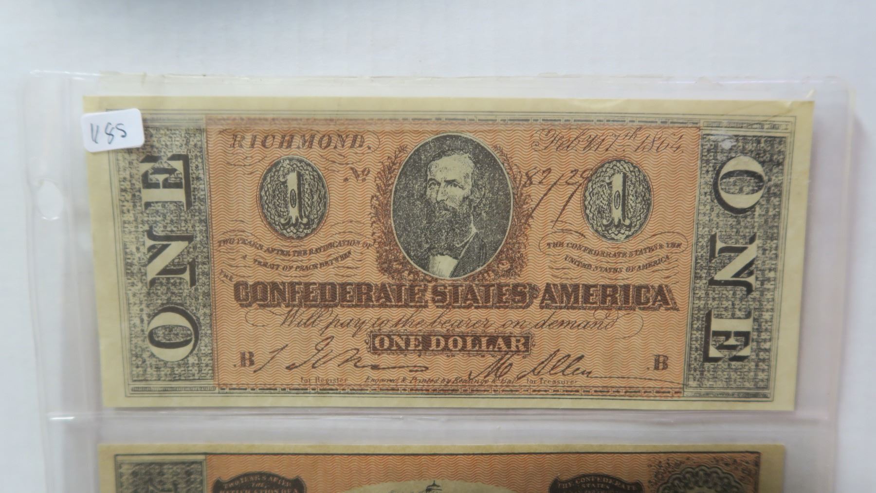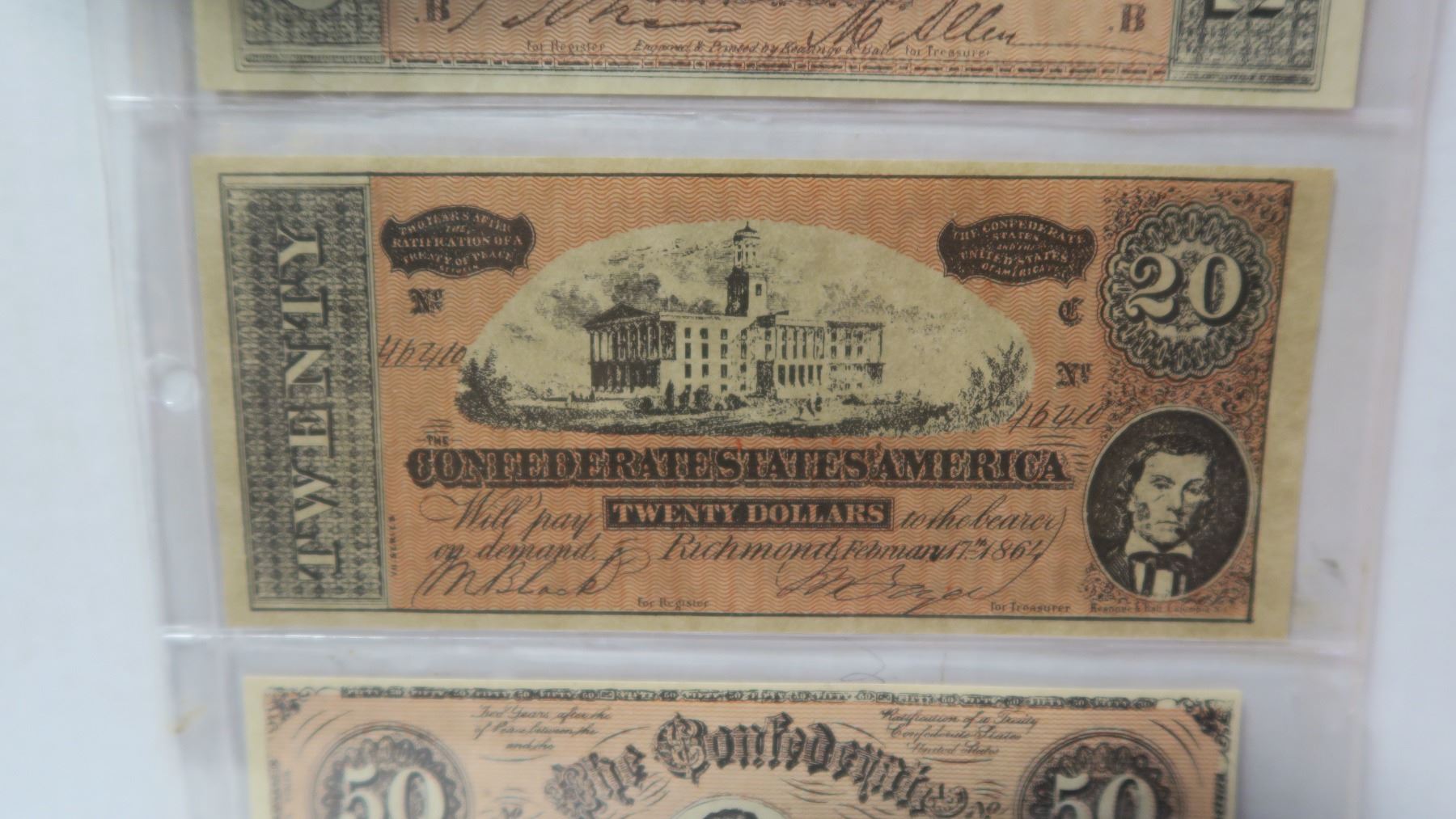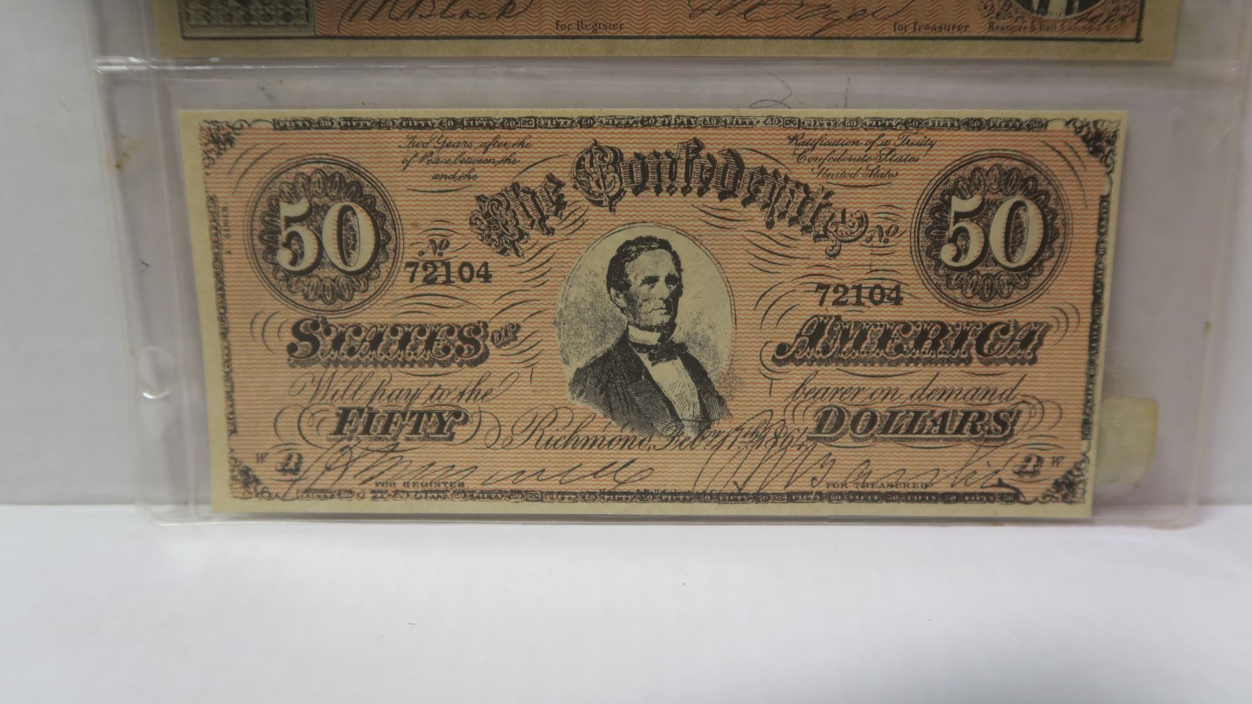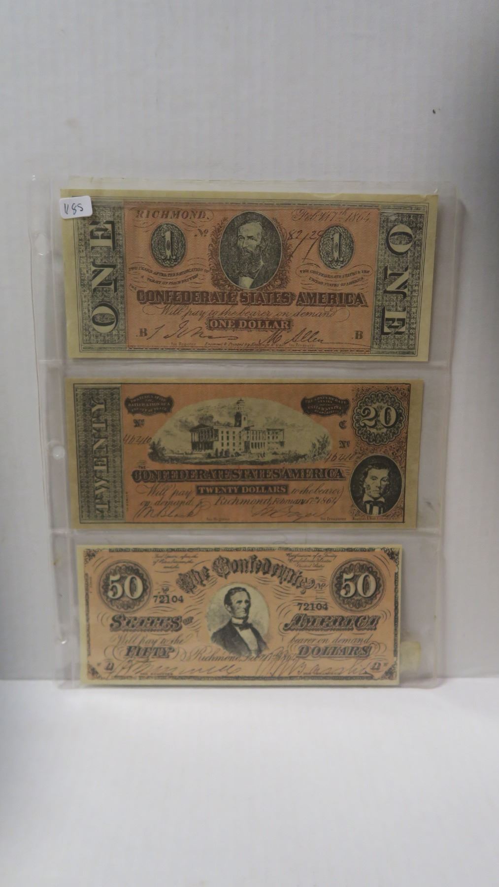 Set of 3 copies of Confederate States of America notes. Includes $1, $20 & $50 and date 1864. These are not real notes. AU.