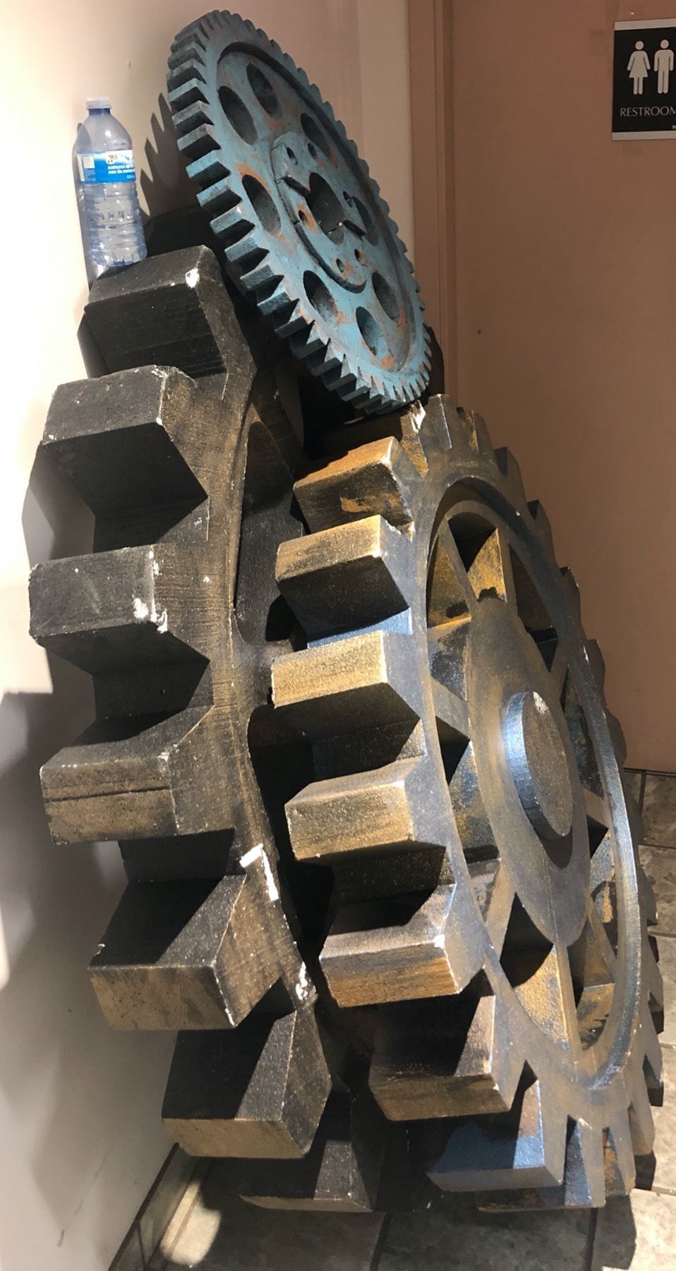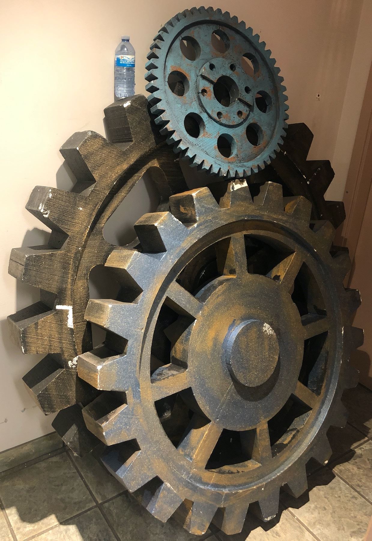 Set of 3 custom-designed Styrofoam prop gears (largest gear approx. 64in diameter)