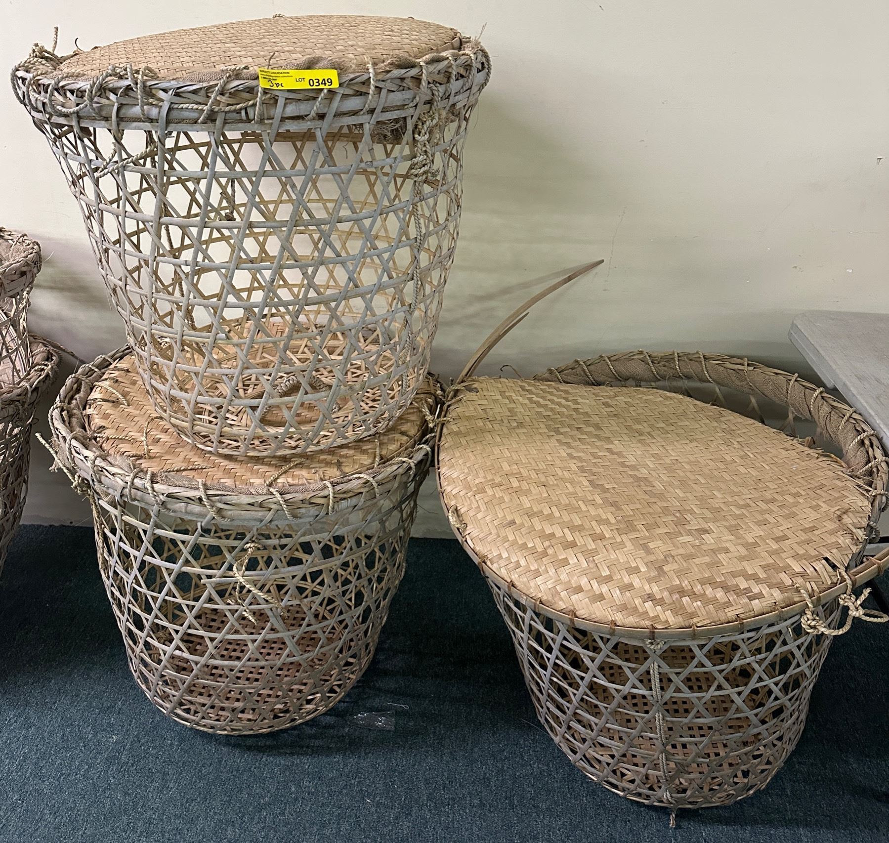Set of 3 large 27in wicker baskets w/ lids (one lid needs repair)