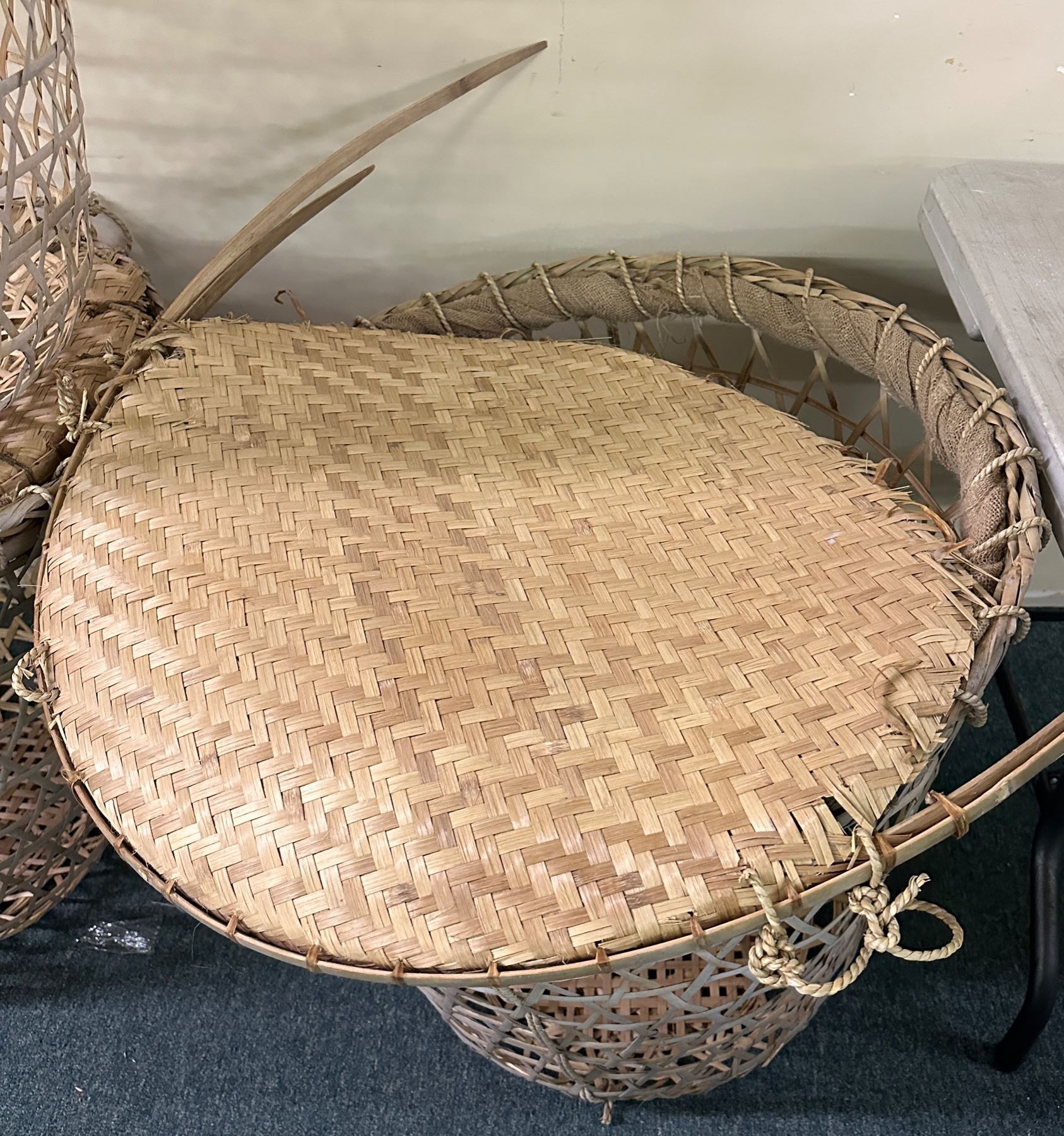 Set of 3 large 27in wicker baskets w/ lids  (one lid needs repair)