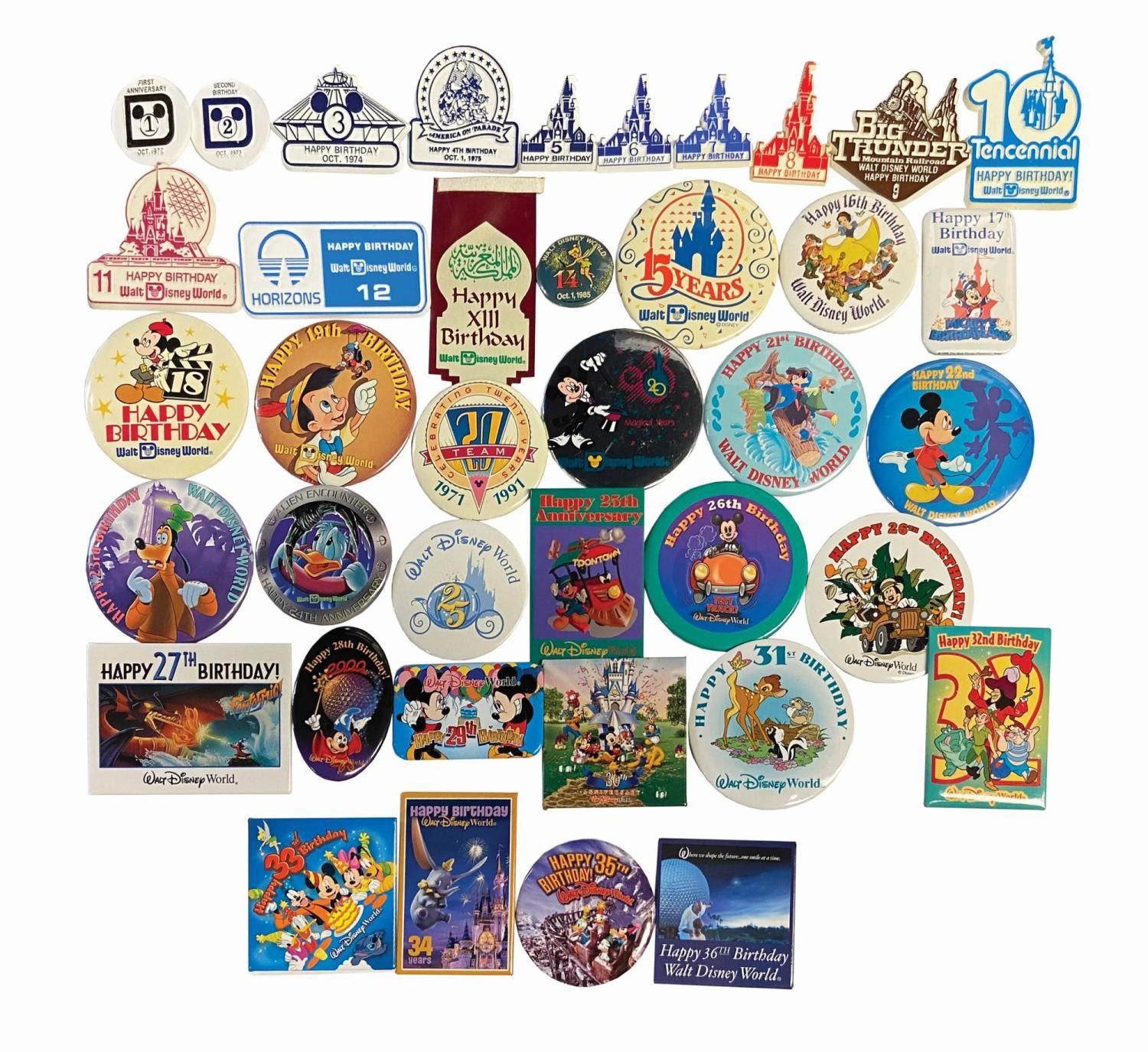 (Walt Disney World, 1972-2008) A set of (39) cast member exclusive Walt Disney World birthday pinback buttons. The collection covers the years 1972-2000 with a single button representing each anniversary, save for (2) 20th, (2) 25th, (2) 26th buttons. However, for duplicated milestones, each button is a different style. The set also includes a leatherette ribbon for the 13th anniversary. Very few sets this comprehensive exist, and it would be exceedingly difficult to build one from scratch. Ranging in size from 1.5" in diameter to 2.5"x3.5", the buttons are in good to very fine condition with some surface wear, rubbing, and oxidation to the backings.