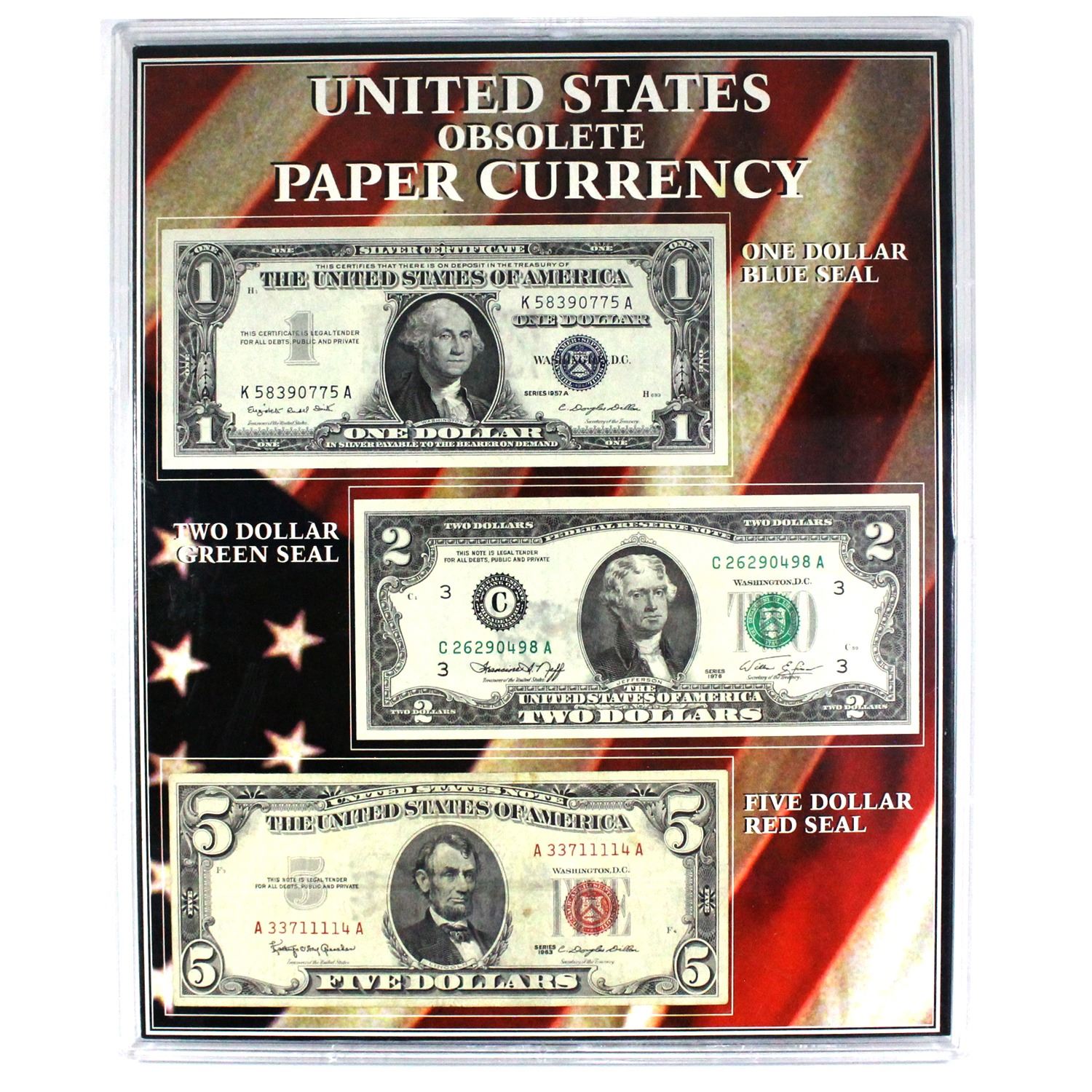 Set of 3x United States Obsolete Paper Currency in Plastic Display board. Lot includes 1957 $1 Silver Certificate Blue Seal, 1976 $2 Green Seal, & 1962 $5 Red Seal. Plastic Display has some surface scratches.