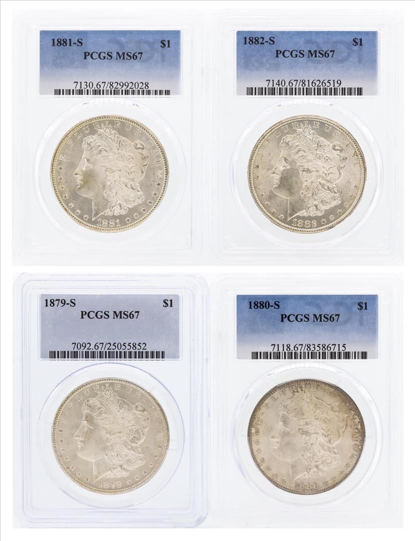 One Set of (4) 1879-S to 1882-S $1 Morgan Silver Dollar Coins PCGS MS67. PCGS Graded.