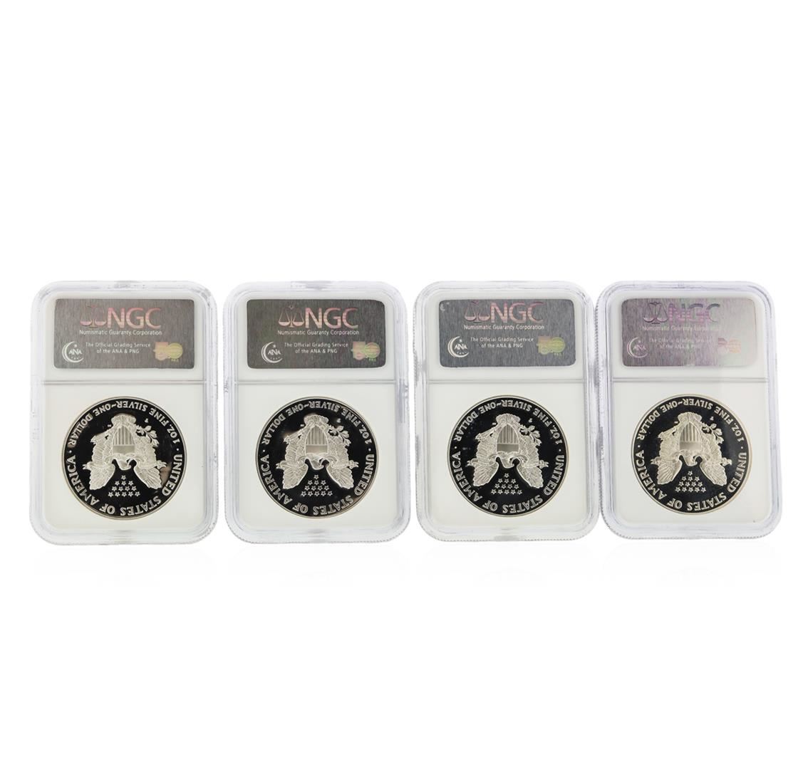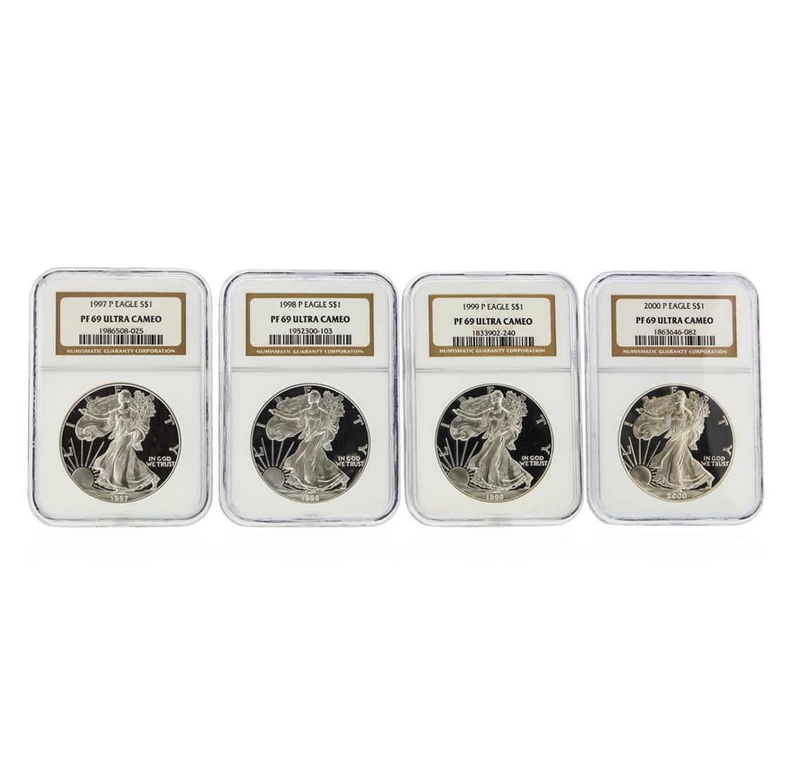One Set of (4) 1997-2000 $1 American Silver Eagle Coins NGC PF69 Ultra Cameo. NGC Certified.