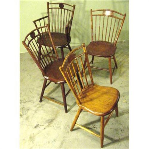 Set of 4 19th Century American Faux Bamboo Rod Back Windsors Chairs with Shield Plate Circa 1820 One Arm Chair and Three Side Chairs