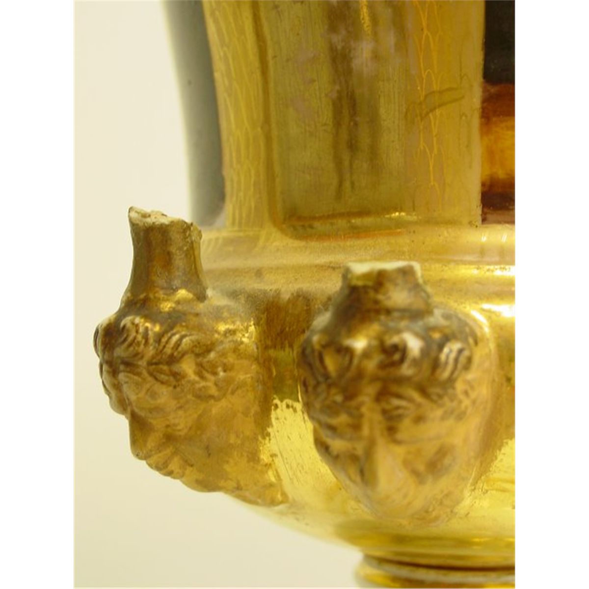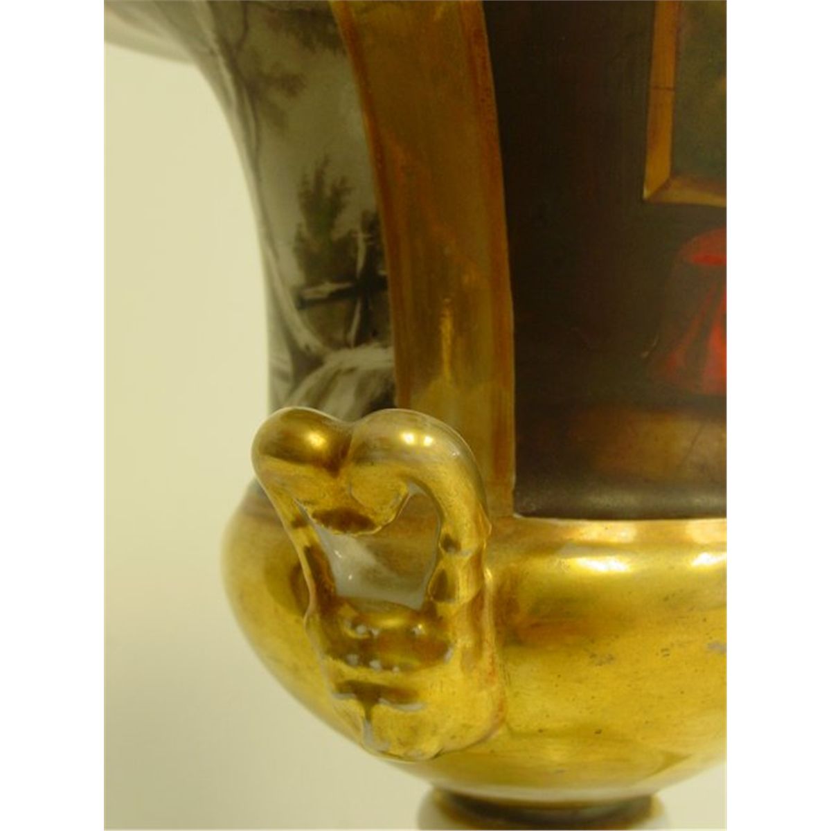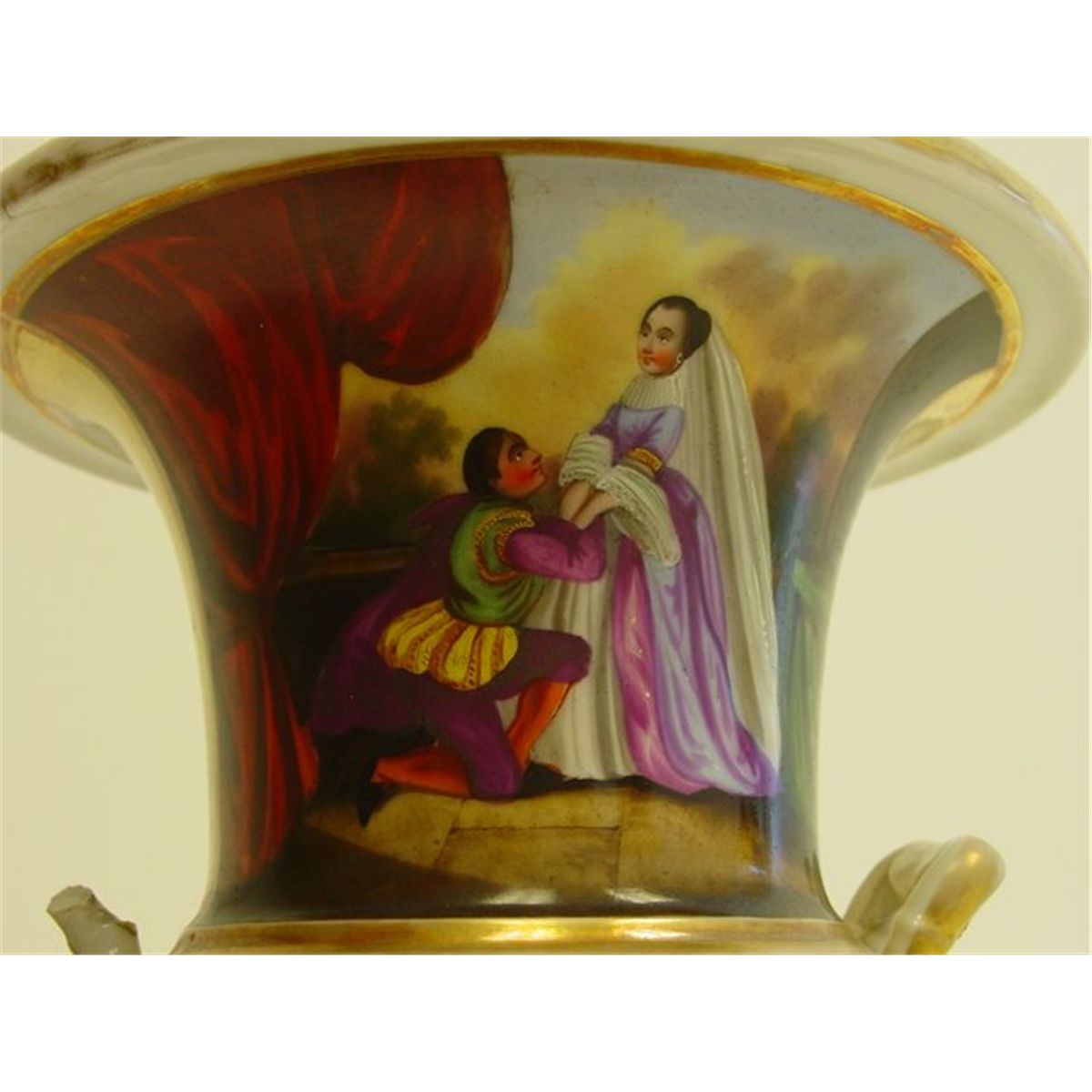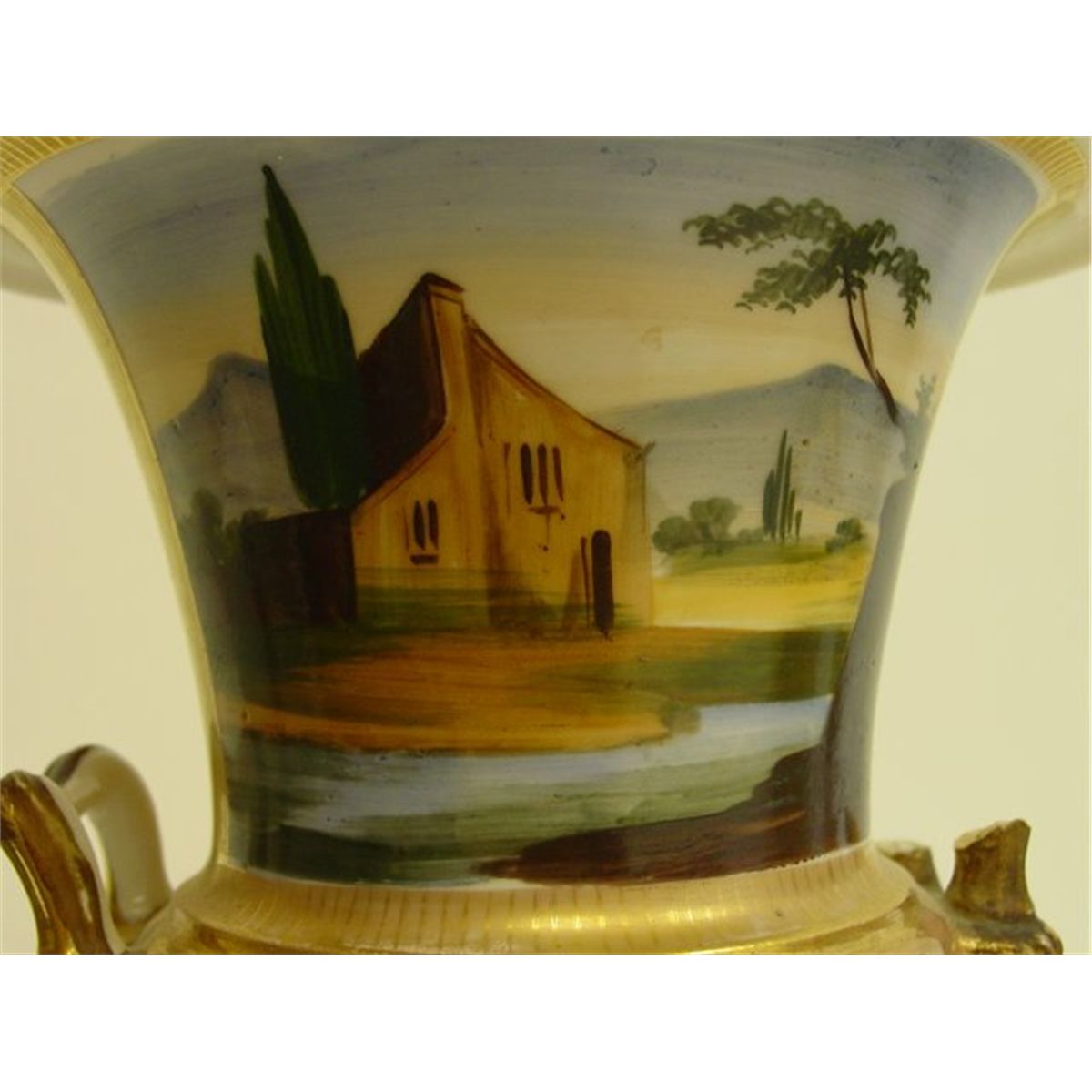 Hand painted, 2- handles "as is", some gold paint wear, indentations on bottom wear, vases were electrified for wire cord. Approx. 10" H x 7.5" mouth. Please read our terms of sale.