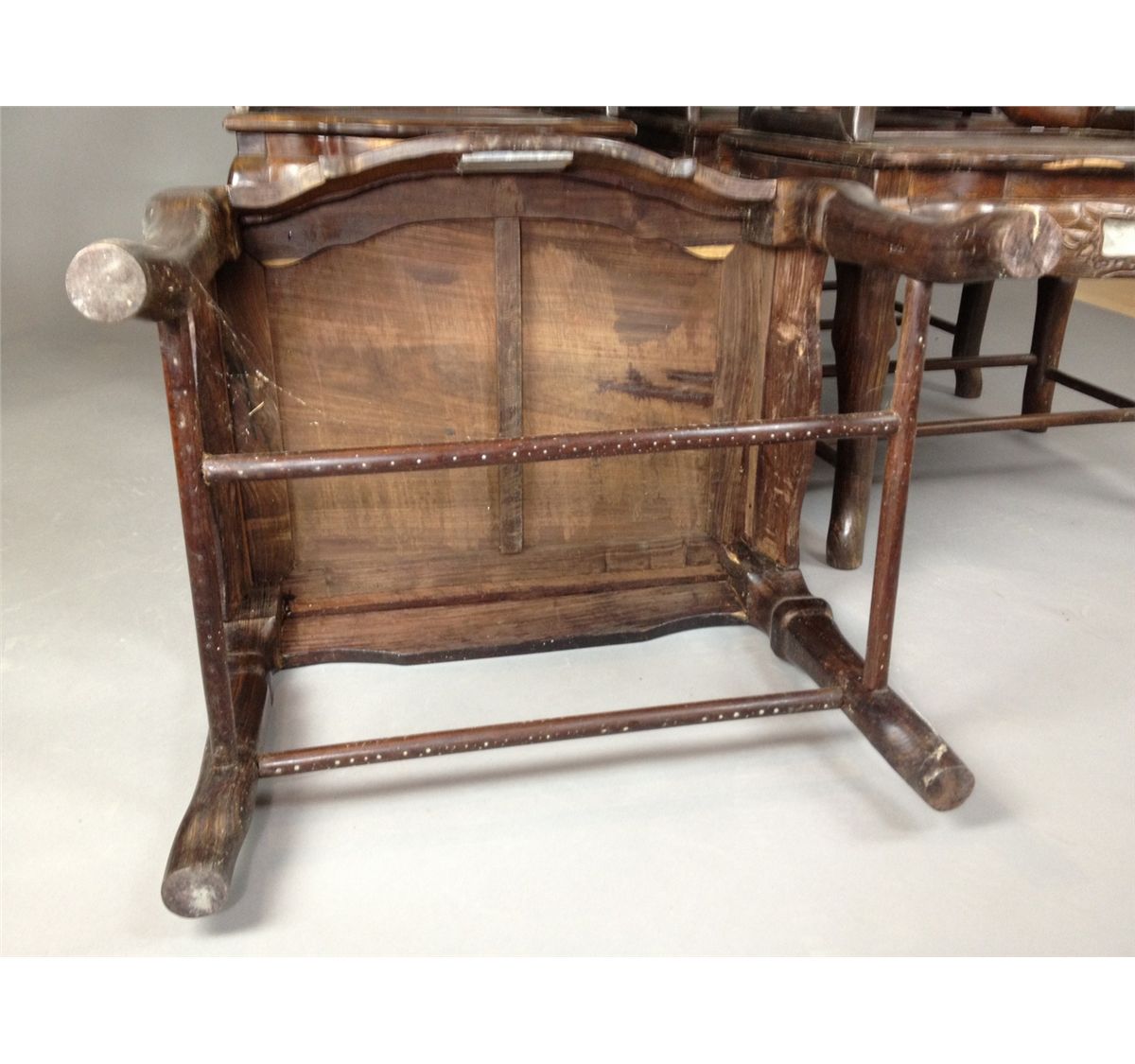 Heavy and antique, Chinese 19th Century Qing Period Rosewood carved chairs, having pierced carving throughout, back rest depicting butterfly, fruit and leaves, apron carved prunus and leaves, symbolizing long life and beauty. The back and apron set with "dreamstone" marble plaques. Joint construction without nails. Excellent condition. H: 112 cm W: 50 cm, L: 62 cm (chairs)