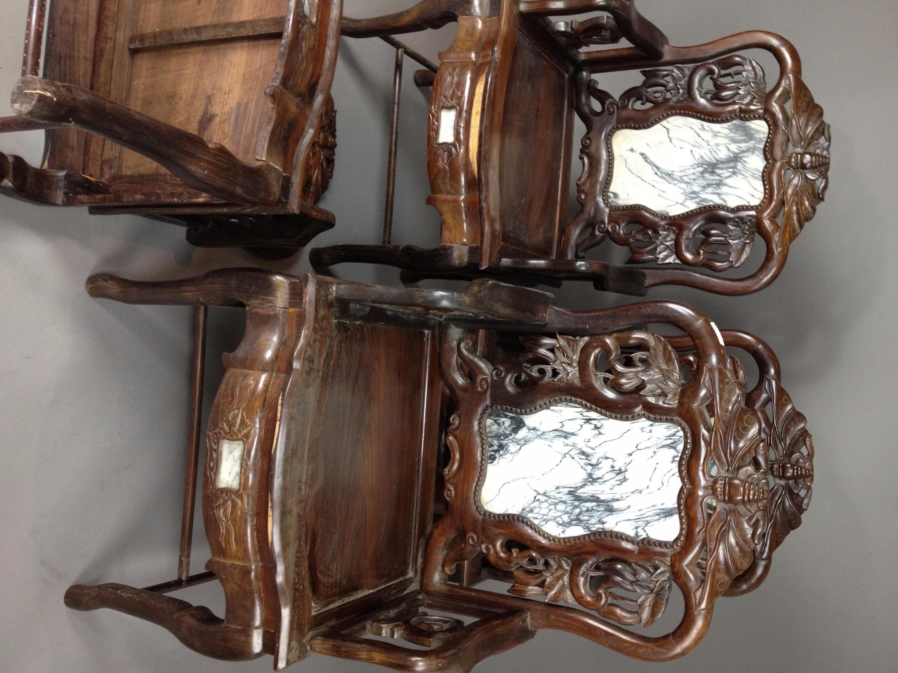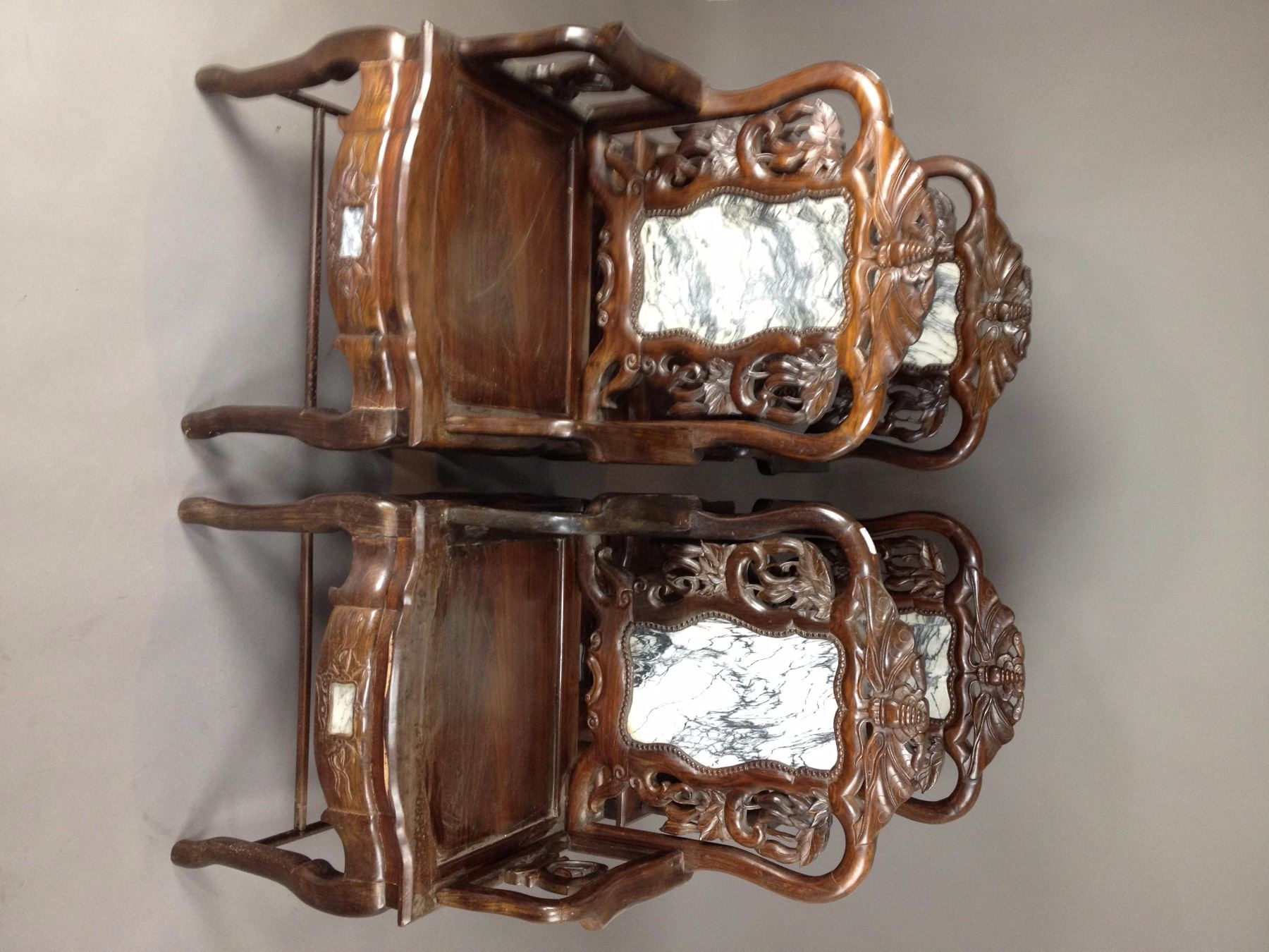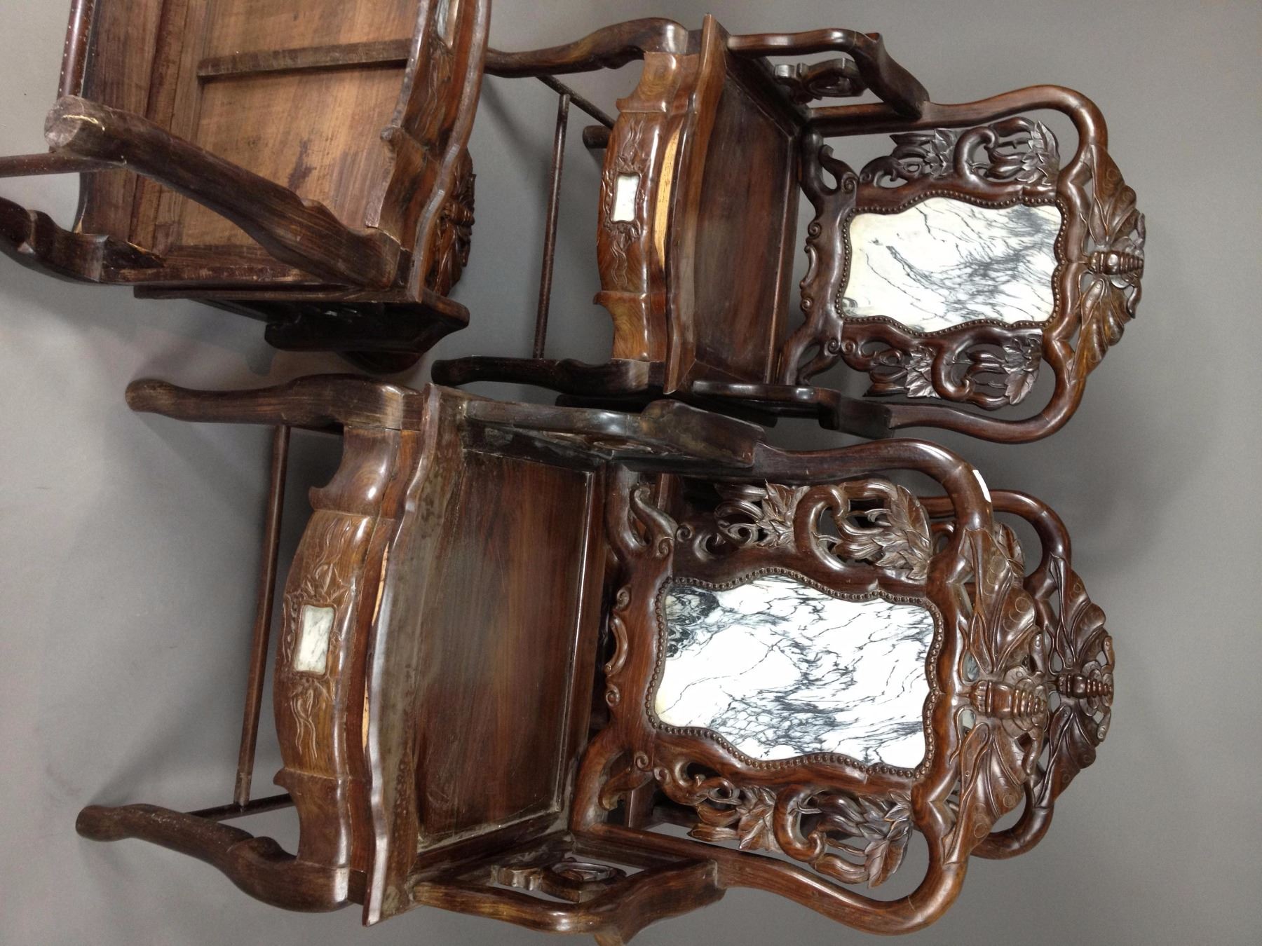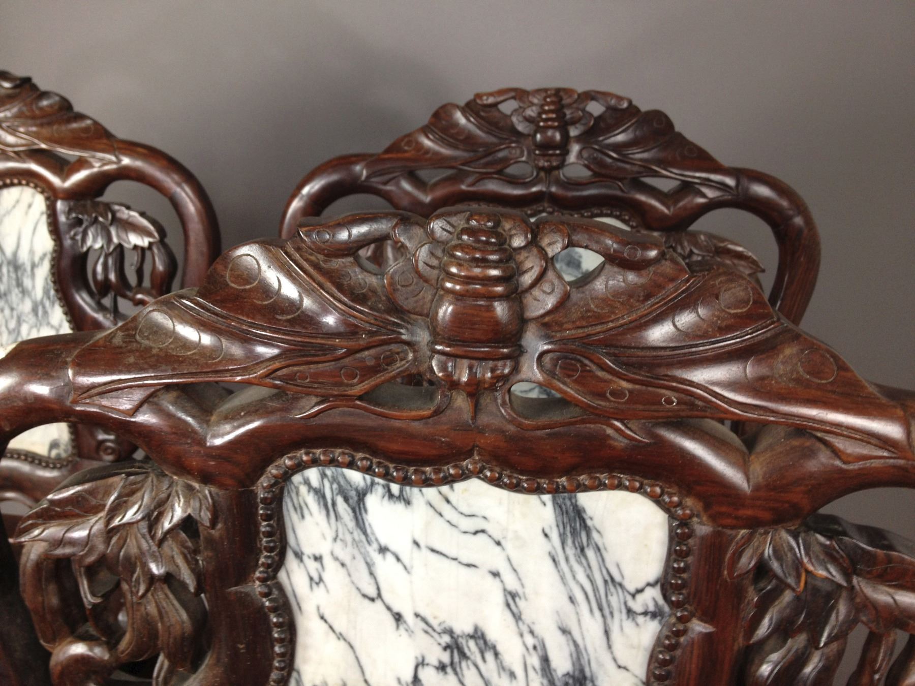 Heavy and antique, Chinese 19th Century Qing Period Rosewood carved chairs, having pierced carving throughout, back rest depicting butterfly, fruit and leaves, apron carved prunus and leaves, symbolizing long life and beauty. The back and apron set with "dreamstone" marble plaques. Joint construction without nails. Excellent condition. H: 112 cm W: 50 cm, L: 62 cm (chairs)