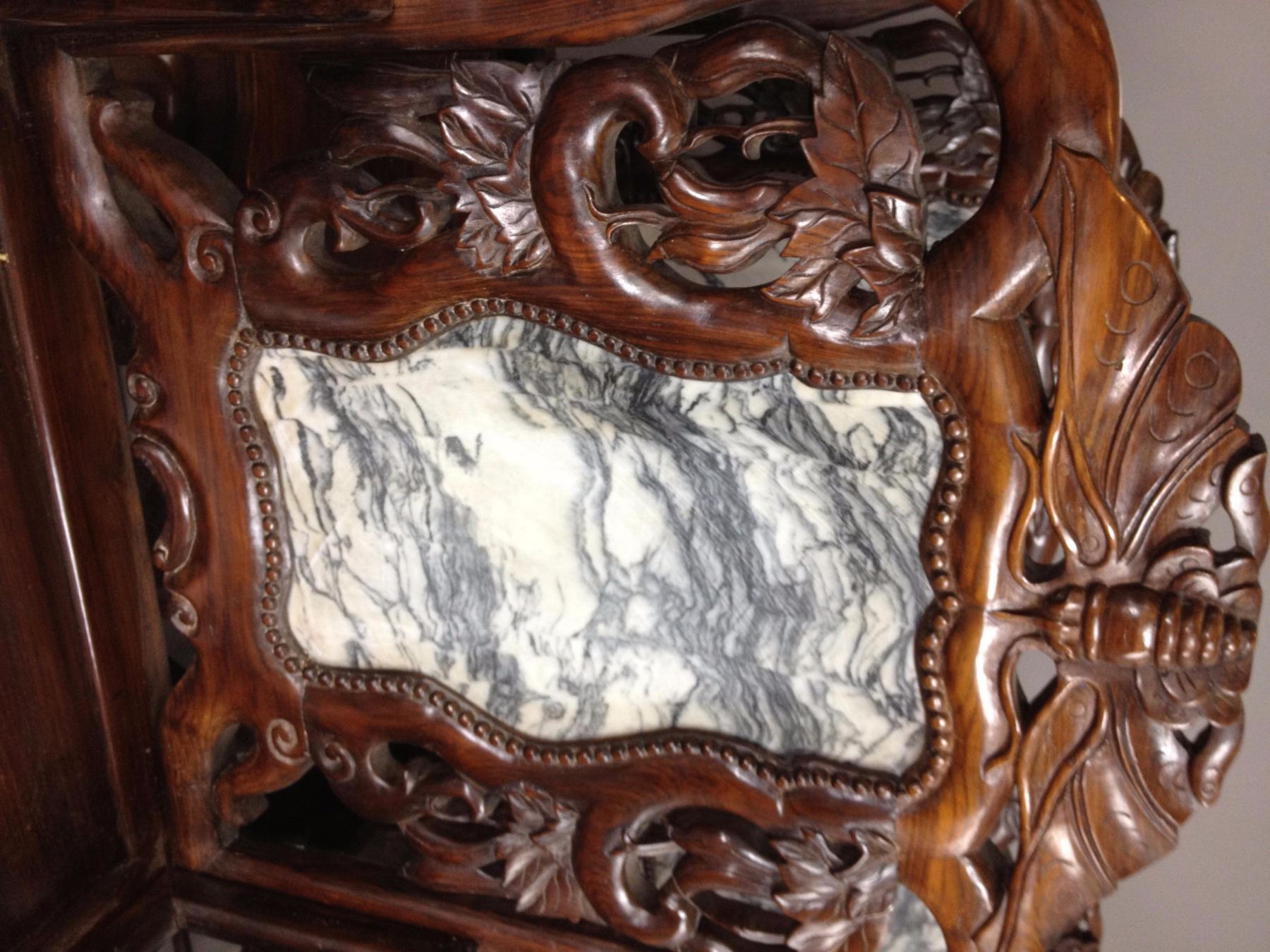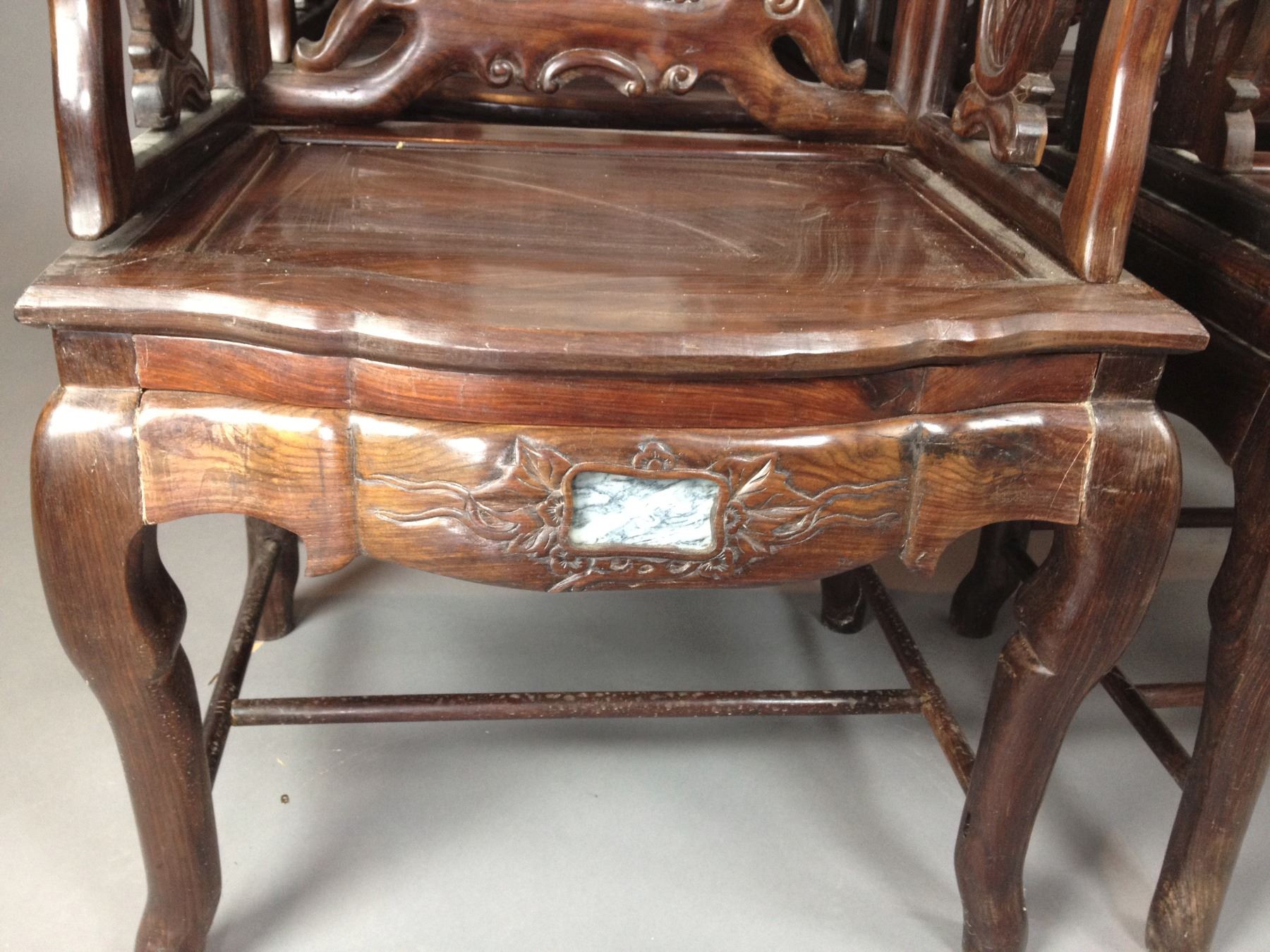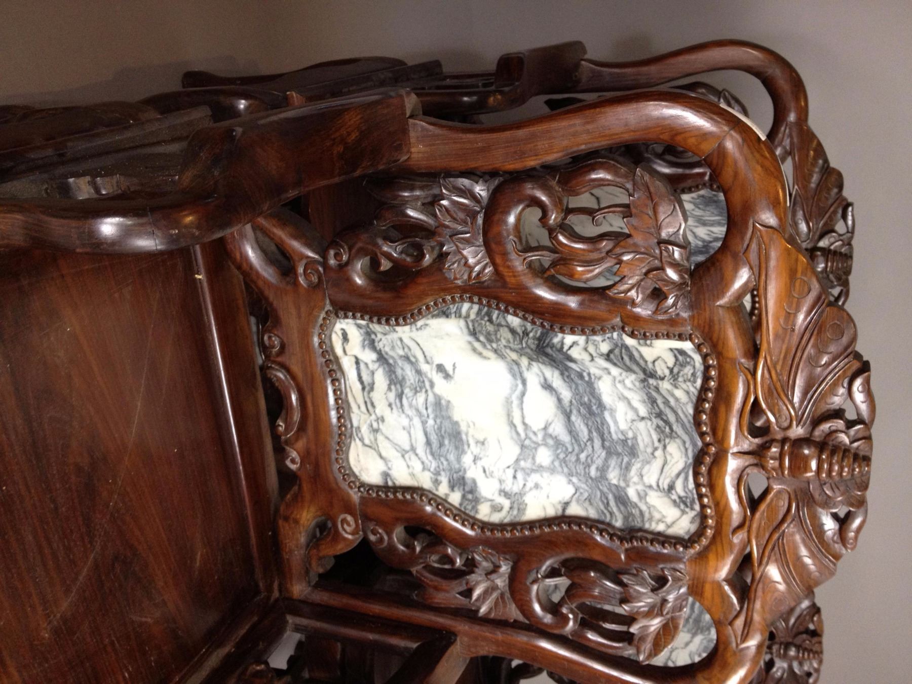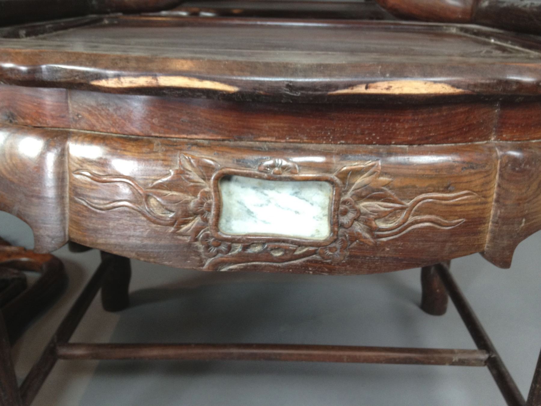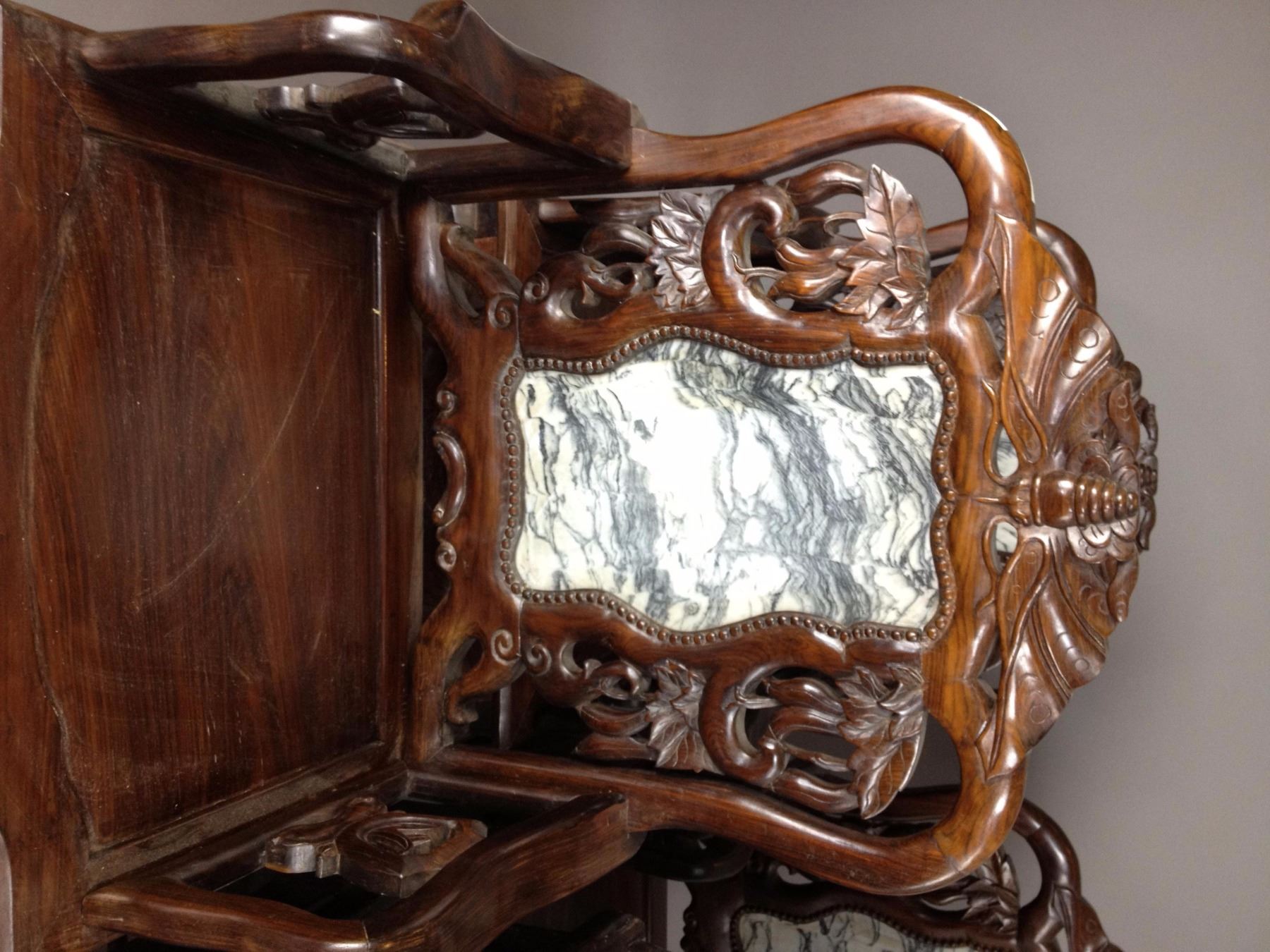 Heavy and antique, Chinese 19th Century Qing Period Rosewood carved chairs, having pierced carving throughout, back rest depicting butterfly, fruit and leaves, apron carved prunus and leaves, symbolizing long life and beauty. The back and apron set with "dreamstone" marble plaques. Joint construction without nails. Excellent condition. H: 112 cm W: 50 cm, L: 62 cm (chairs)