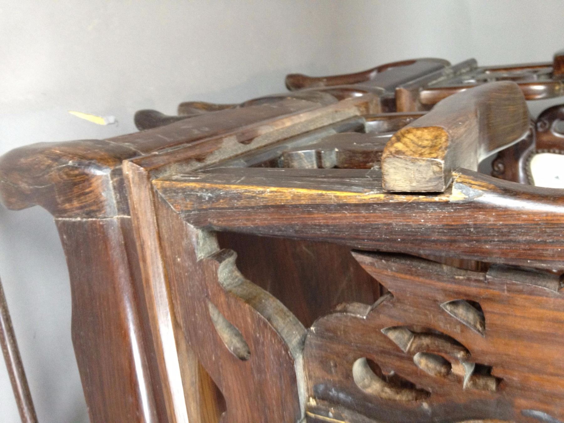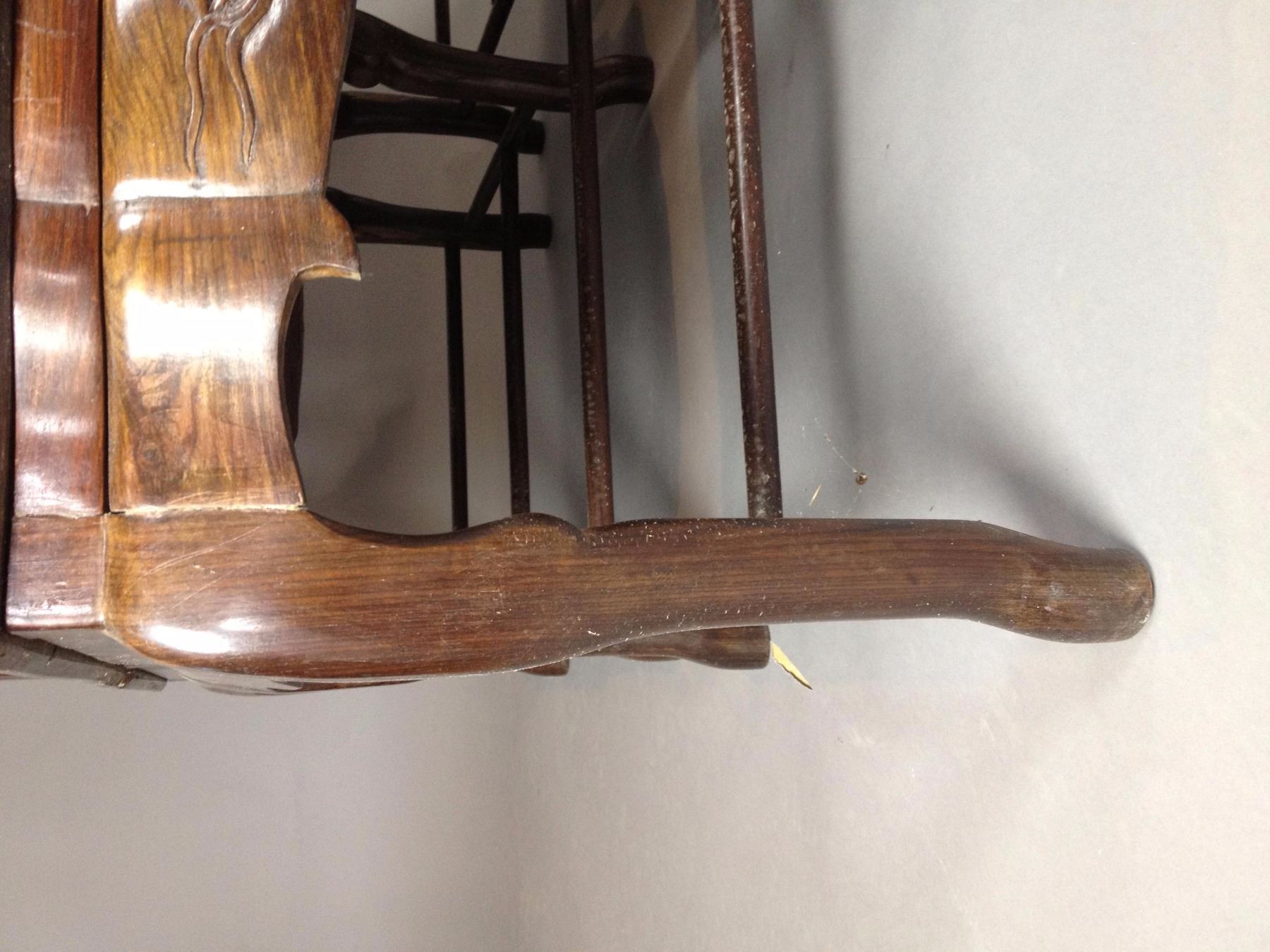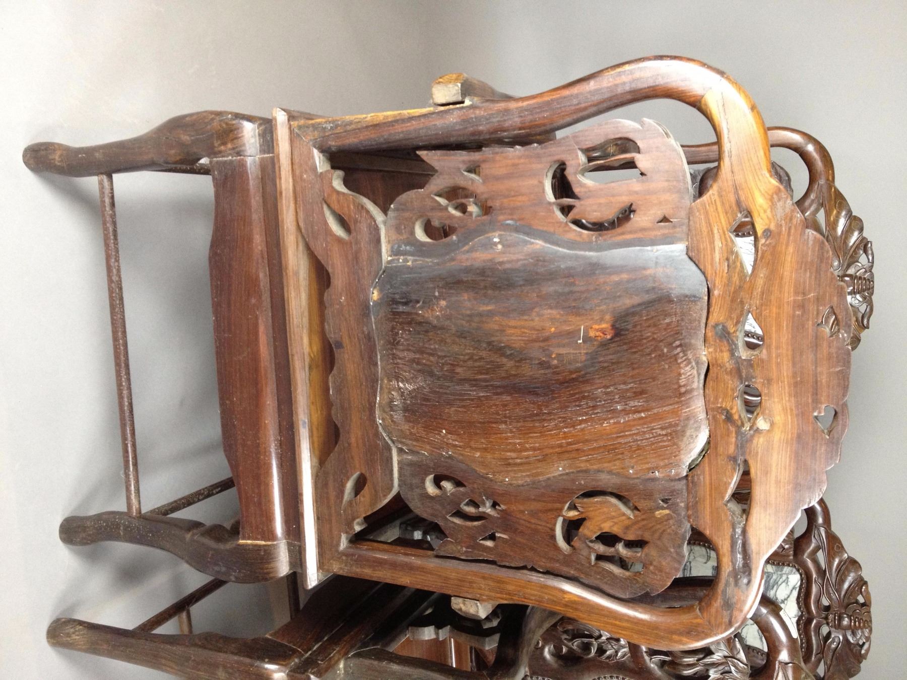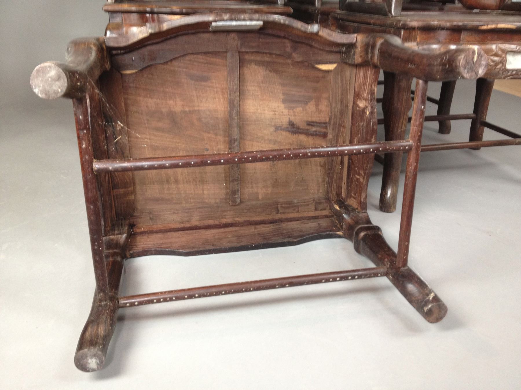 Heavy and antique, Chinese 19th Century Qing Period Rosewood carved chairs, having pierced carving throughout, back rest depicting butterfly, fruit and leaves, apron carved prunus and leaves, symbolizing long life and beauty. The back and apron set with "dreamstone" marble plaques. Joint construction without nails. Excellent condition. H: 112 cm W: 50 cm, L: 62 cm (chairs)