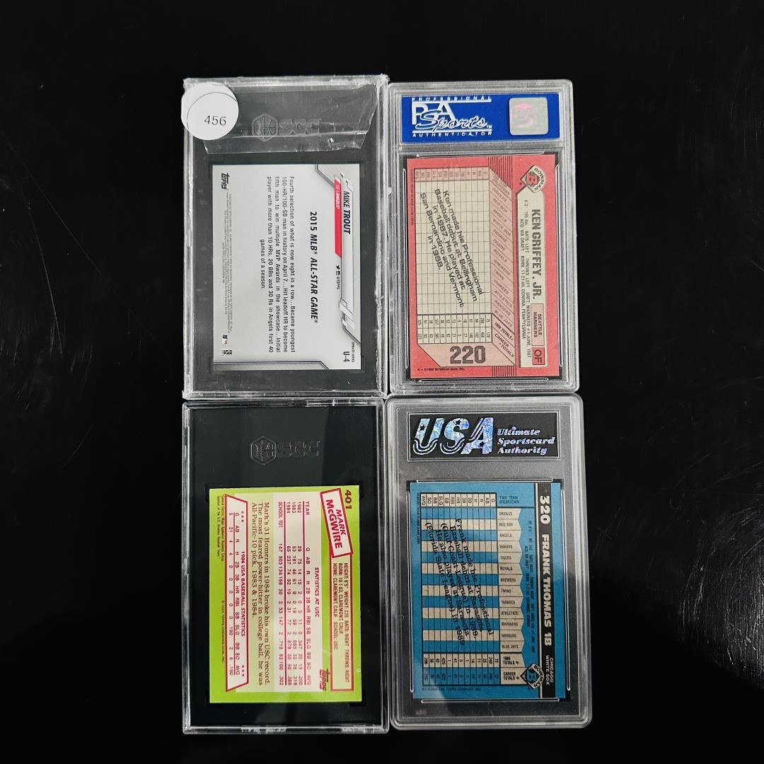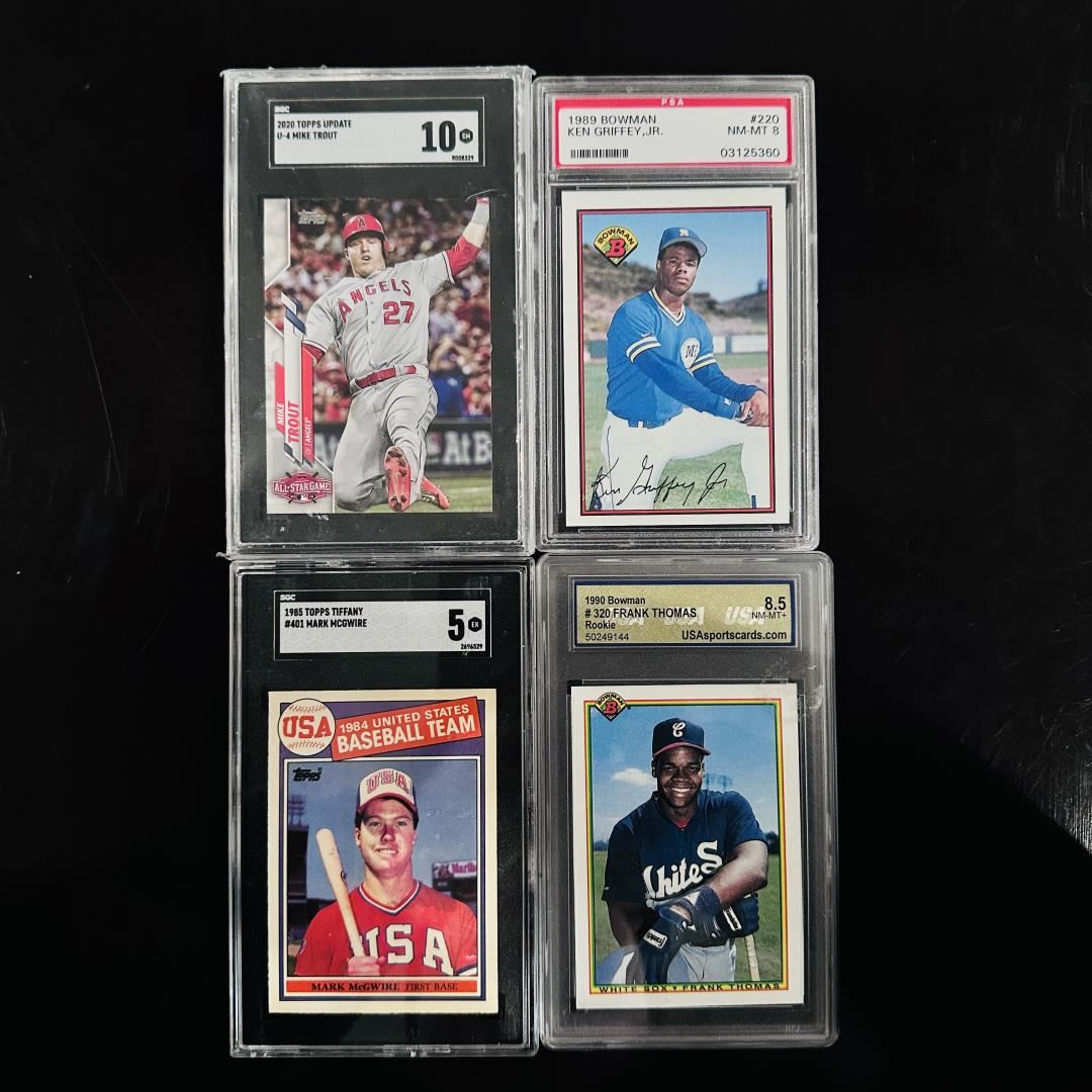 This four-card lot includes iconic names across generations, each slabbed by a recognized grading service. Featured are a 2020 Topps Update #4 Mike Trout "All-Star Game" card graded SGC 10, a 1989 Bowman #220 Ken Griffey Jr. rookie graded PSA 8, and a 1985 Topps Tiffany #401 Mark McGwire graded SGC 5. Also included is a 1990 Bowman #320 Frank Thomas rookie graded 8.5 by USA Sports Authority. A standout mix of legends and modern stars ideal for long-term collectors and baseball historians alike.