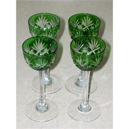 Exquisite set of four Bohemia Czech cut crystal cordials. Beautiful deep green cut to clear. These have 6 sided stems and have a full 6 second ping! The measurements are 4 3/4" tall, 2" wide at the base, and 1 7/8" wide at the mouth. The four are in excellent condition with no chips or scratching. These are of very fine quality that will not disappoint.