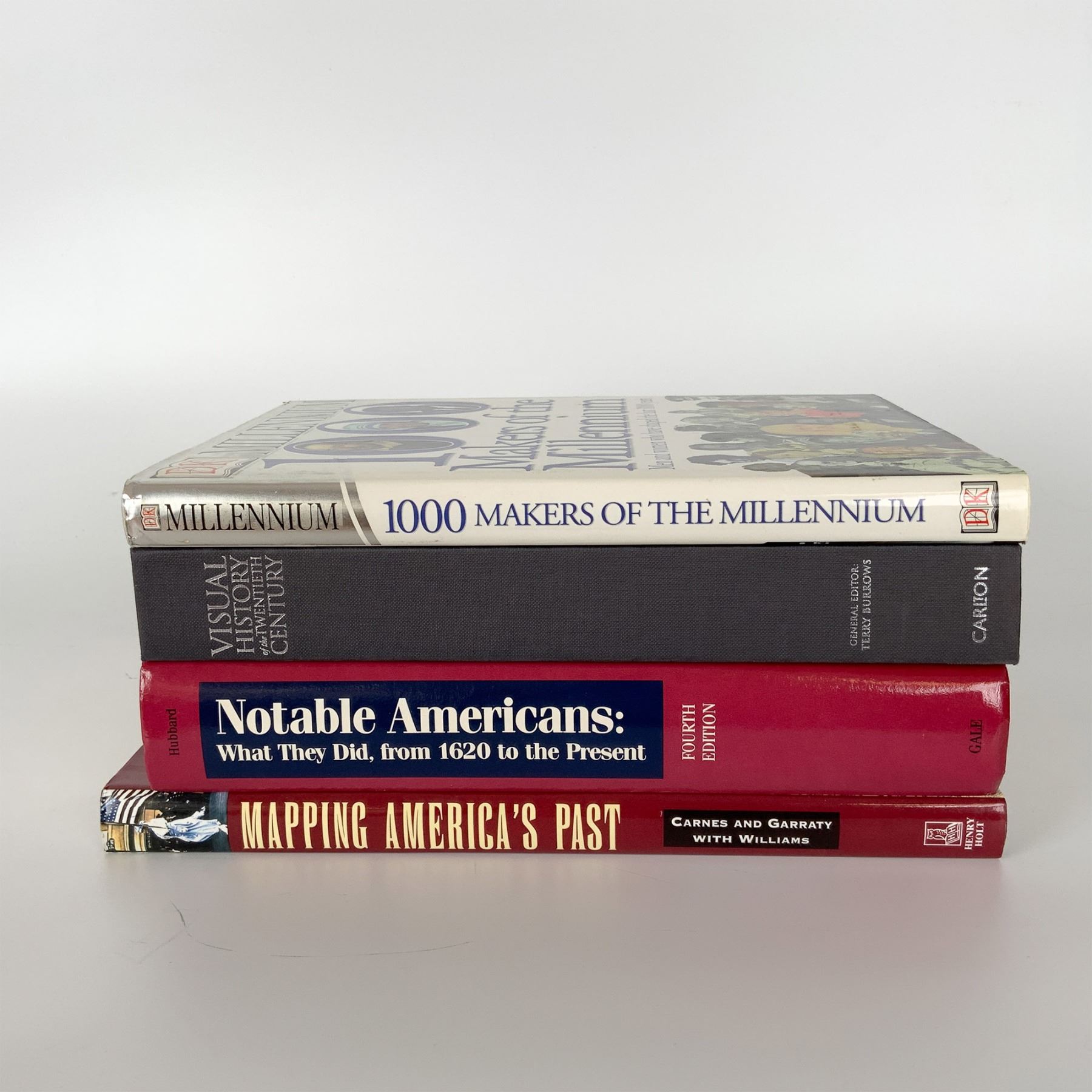 This set includes four hardcover books covering American history and influential figures. The titles are Mapping America's Past by Carnes and Garraty with Williams, 1000 Makers of the Millennium by DK Millennium, Visual History of the Twentieth Century, and Notable Americans: What They Did, from 1620 to the Present (Fourth Edition) by Gale. These volumes provide a comprehensive look at key historical events, prominent individuals, and cultural shifts that shaped the nation, with in-depth narratives, photographs, and reference material valuable for historians, researchers, and collectors.