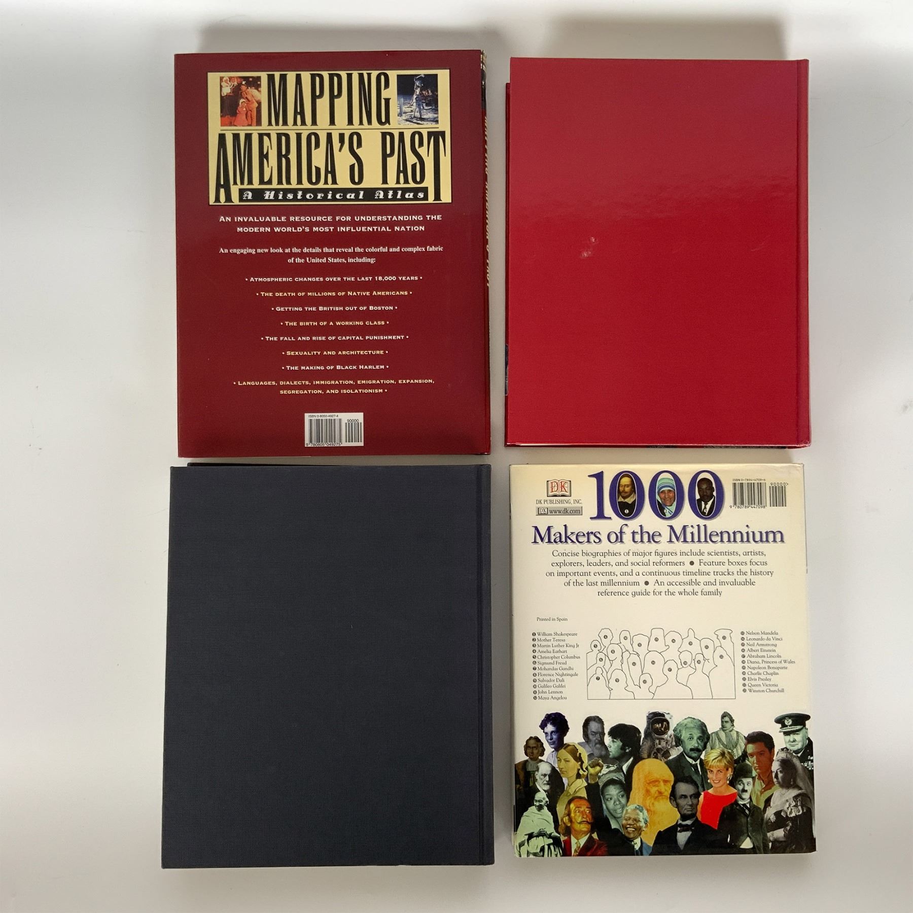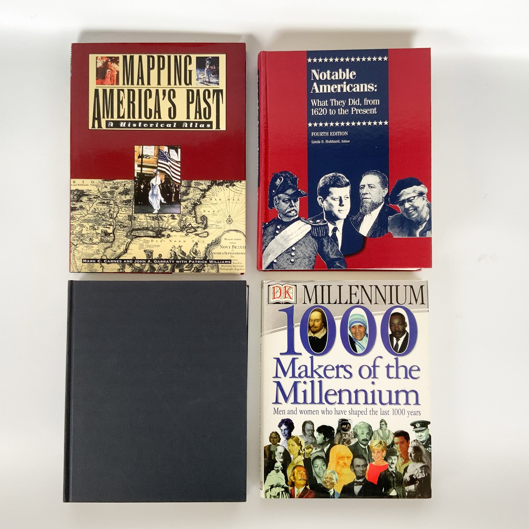 This set includes four hardcover books covering American history and influential figures. The titles are Mapping America's Past by Carnes and Garraty with Williams, 1000 Makers of the Millennium by DK Millennium, Visual History of the Twentieth Century, and Notable Americans: What They Did, from 1620 to the Present (Fourth Edition) by Gale. These volumes provide a comprehensive look at key historical events, prominent individuals, and cultural shifts that shaped the nation, with in-depth narratives, photographs, and reference material valuable for historians, researchers, and collectors.