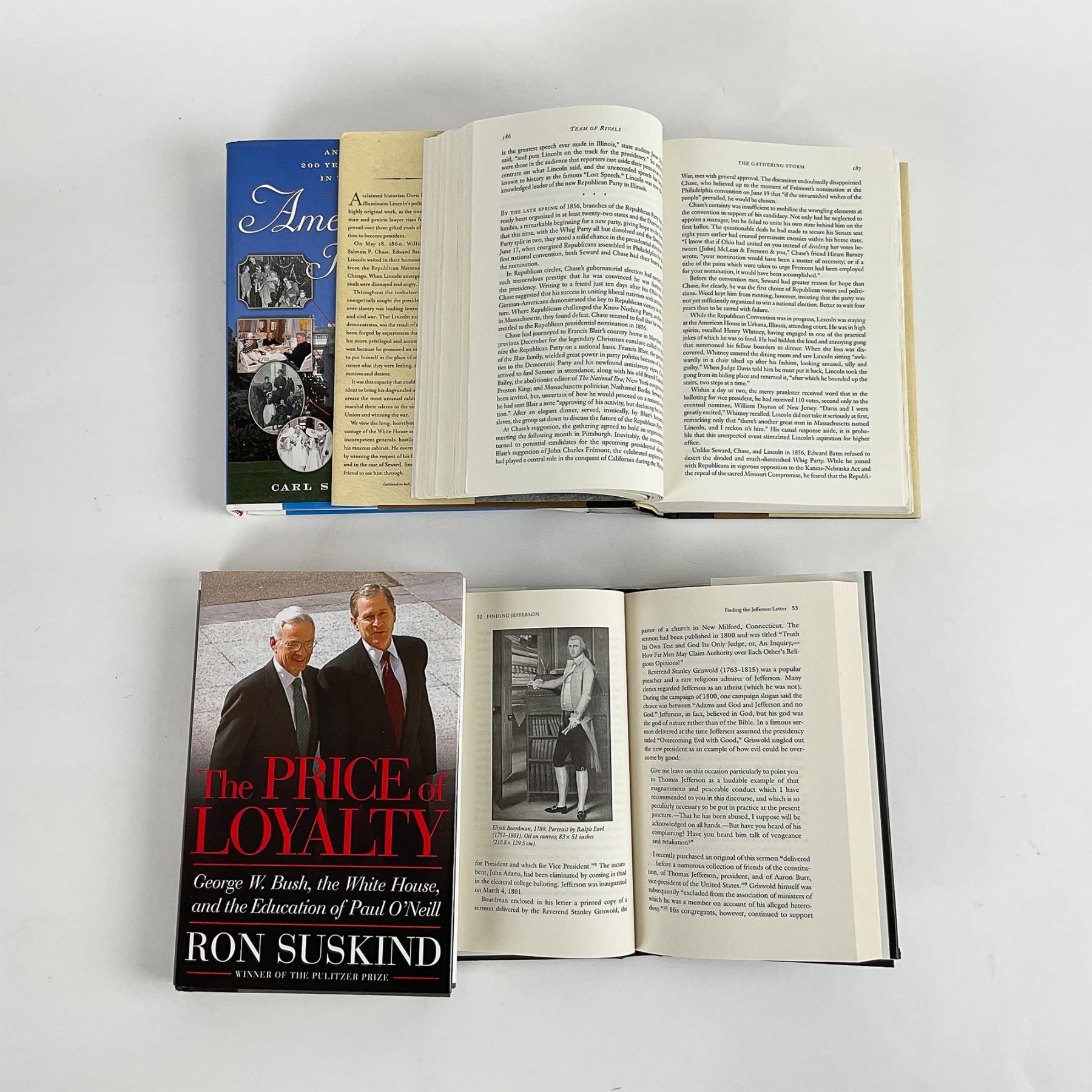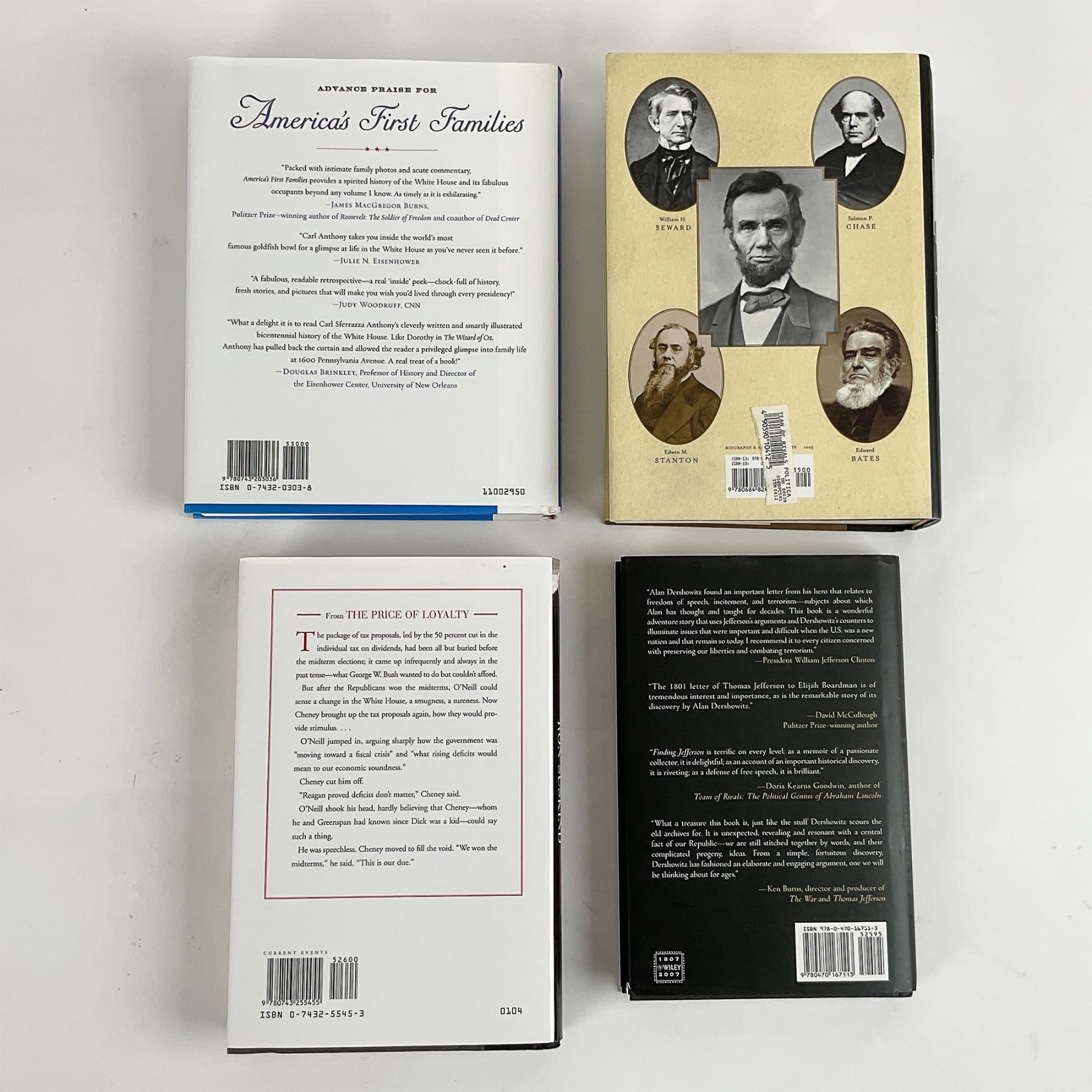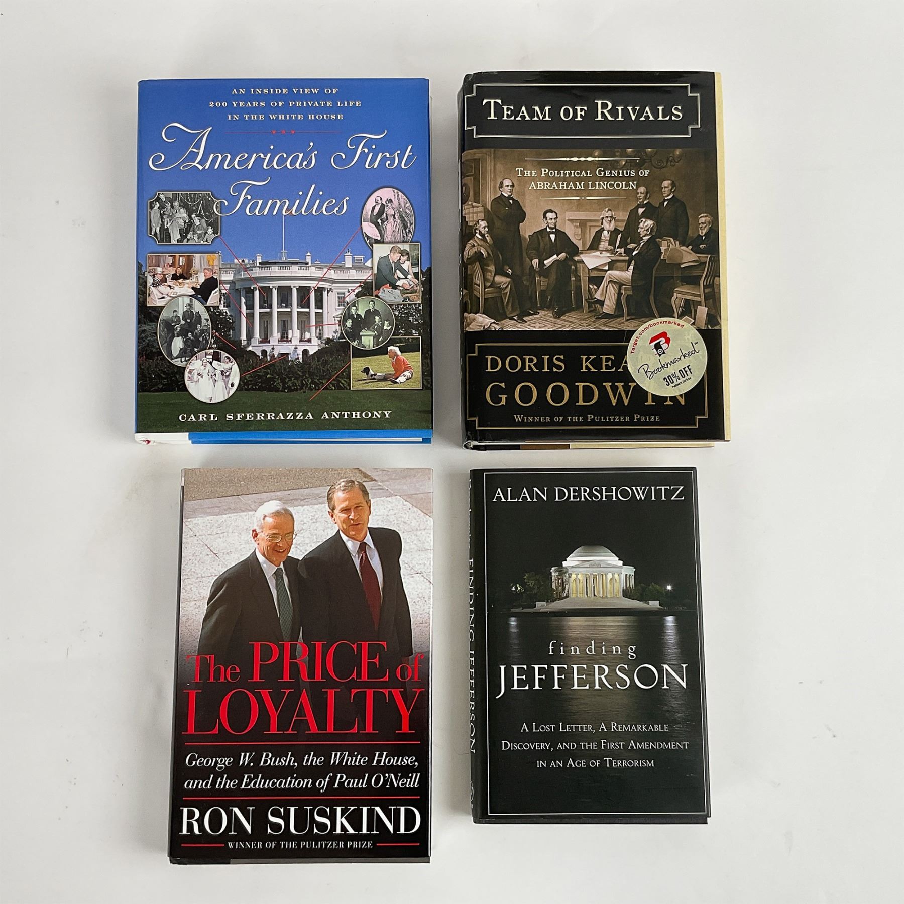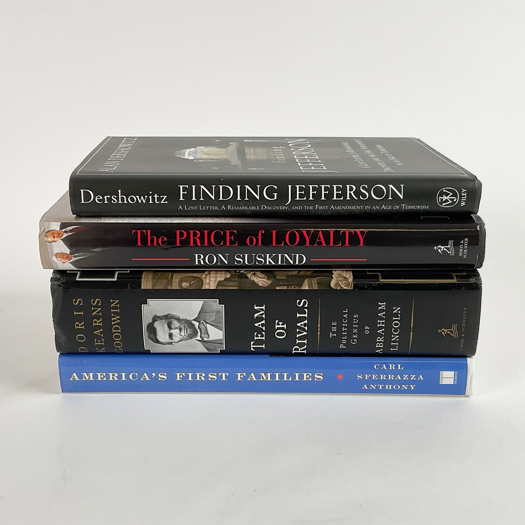 A collection of four hardcover books offering in-depth perspectives on American political history and leadership. Included in this lot is The Price of Loyalty by Ron Suskind, an investigative account of George W. Bush's administration through the experiences of former Treasury Secretary Paul O'Neill. Team of Rivals by Pulitzer Prize-winning historian Doris Kearns Goodwin examines the political genius of Abraham Lincoln and his ability to unify a cabinet of former adversaries. Finding Jefferson by Alan Dershowitz explores a lost letter attributed to Thomas Jefferson and its implications on the First Amendment and contemporary politics. America's First Families by Carl Sferrazza Anthony provides a richly illustrated and narrative-driven look into the private lives of U.S. presidents and their families over two centuries. These books offer valuable insight into leadership, governance, and the inner workings of the White House, making them essential additions for collectors of political history and presidential biographies.