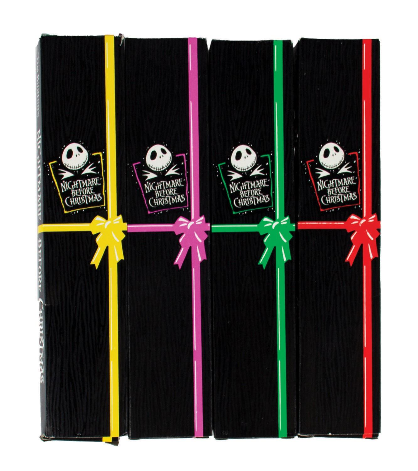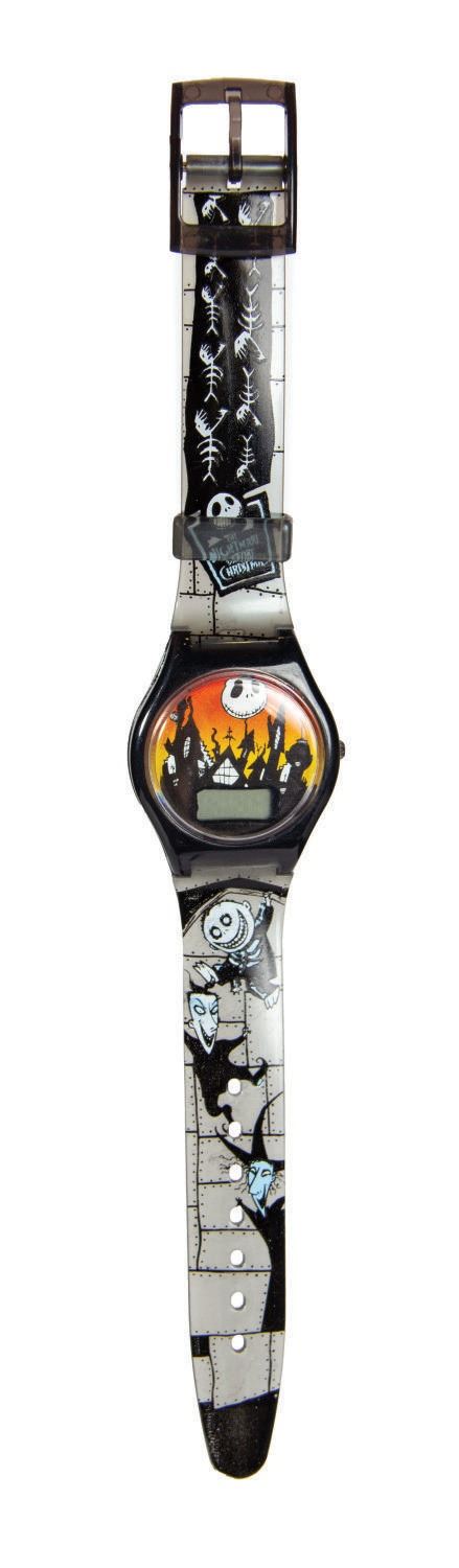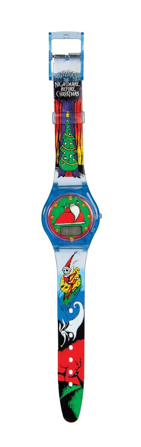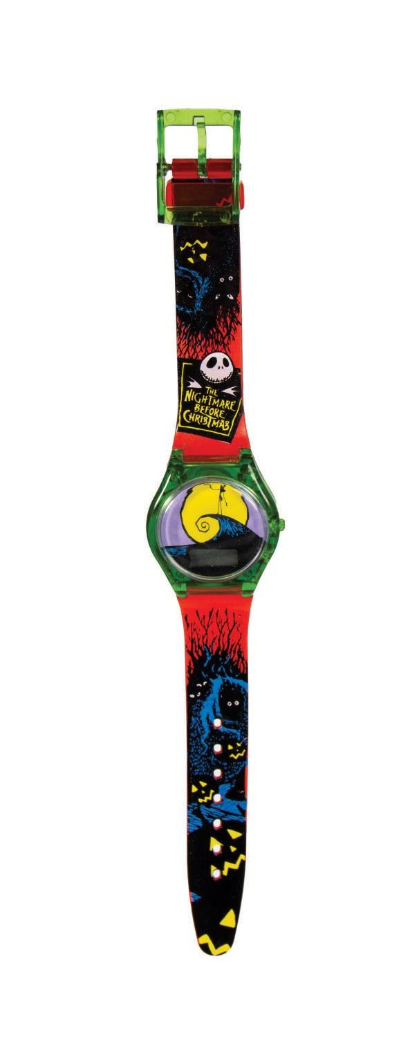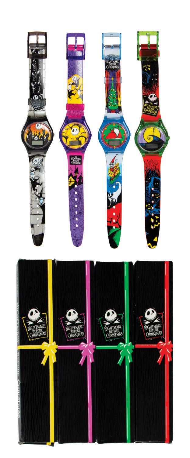 (Disney, 1993) A complete set of (4) Nightmare Before Christmas-themed wristwatches from a Burger King tie-in promotion. The set includes Christmastown, Pumpkins, Bats and Cats, and Halloweentown. Each measures 9" long and is in very good condition with some light surface wear to the case and crystal. The watches are in need of new batteries. The boxes measure 10"x2" and 0.75" deep and exhibit minor bowing to the sides and edge wear.