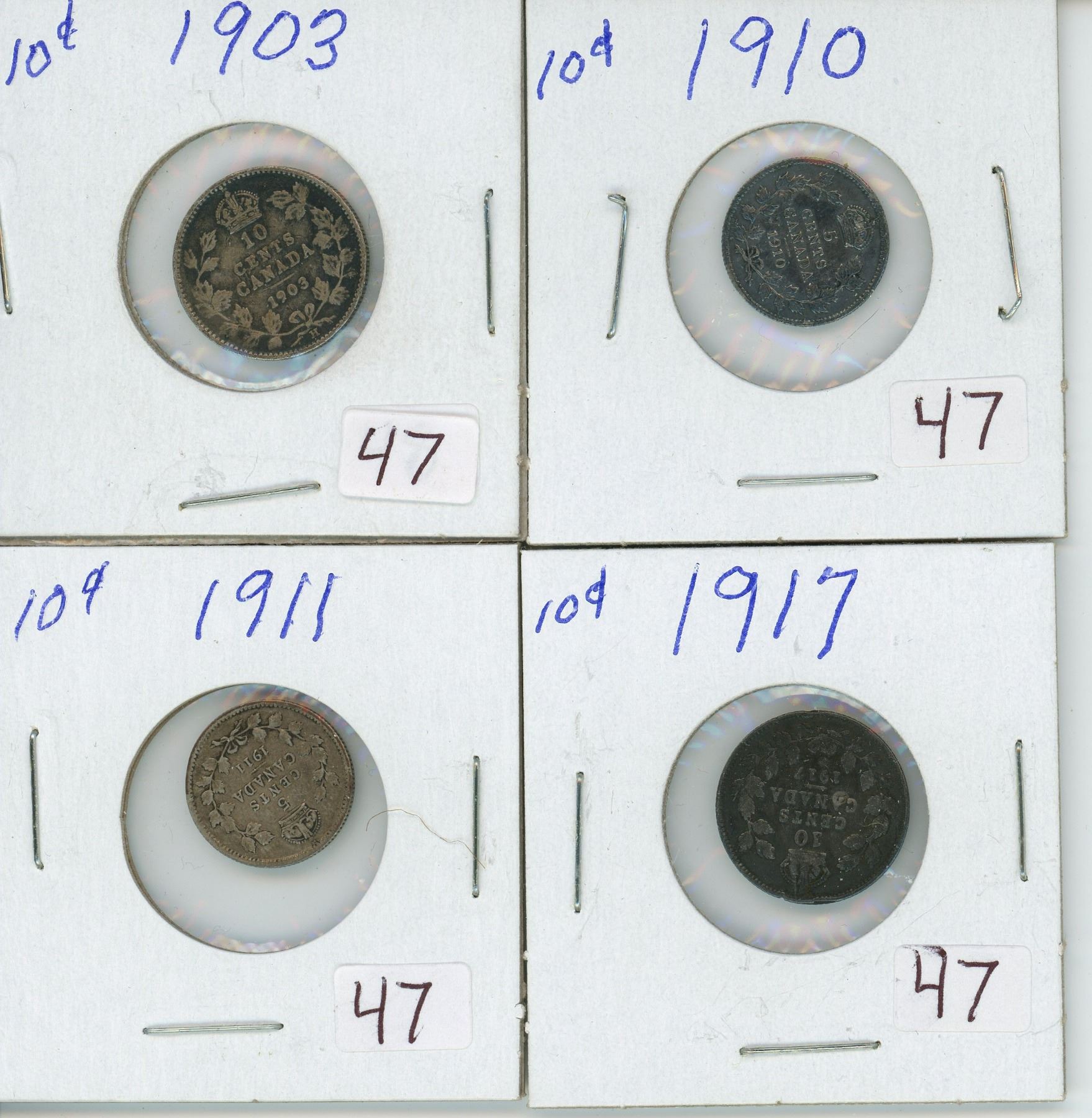 Set of 4, Canadian 10 cent coins - 1903, 1910, 1911 & 1917