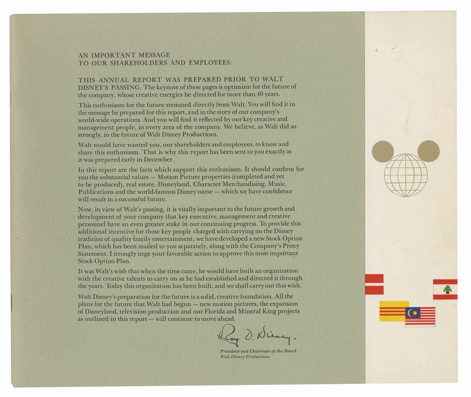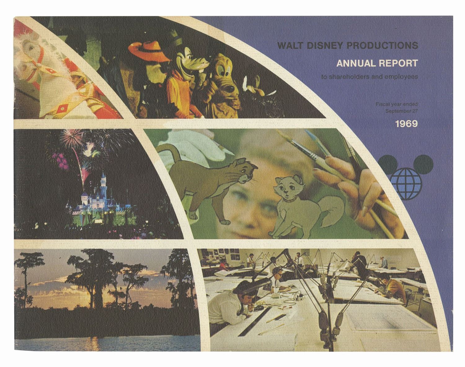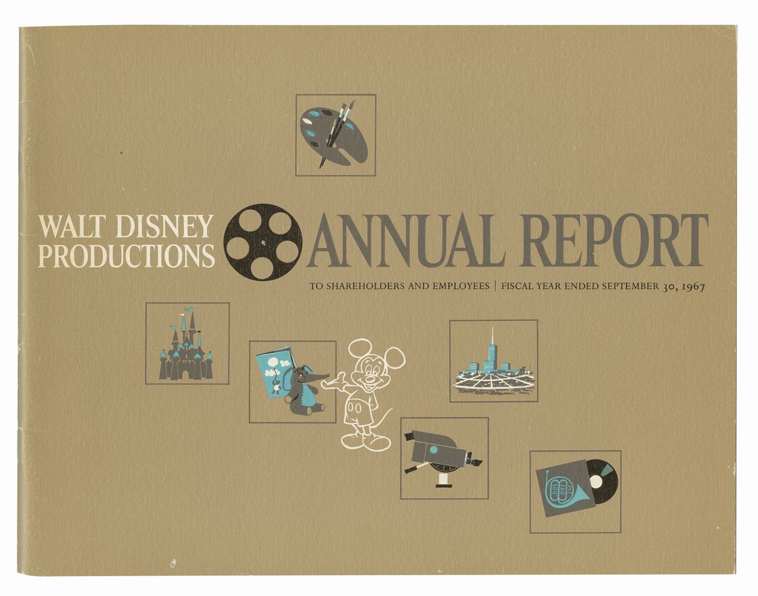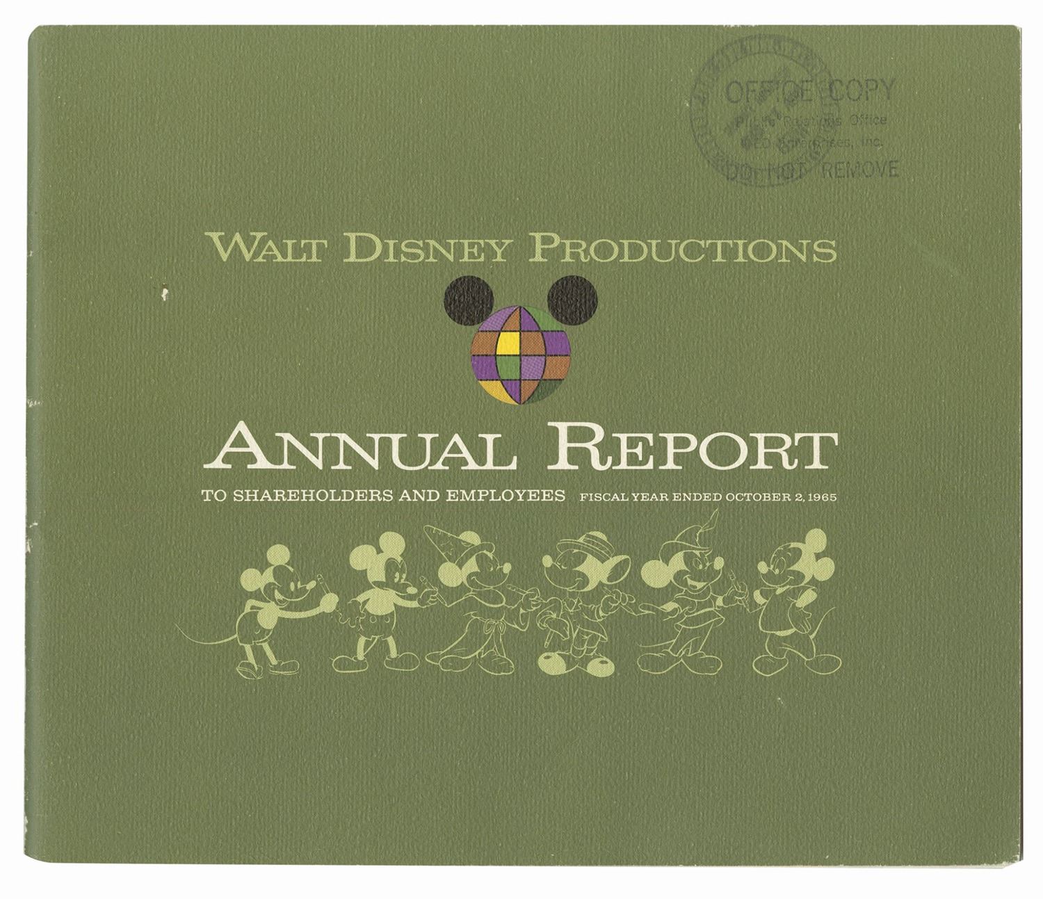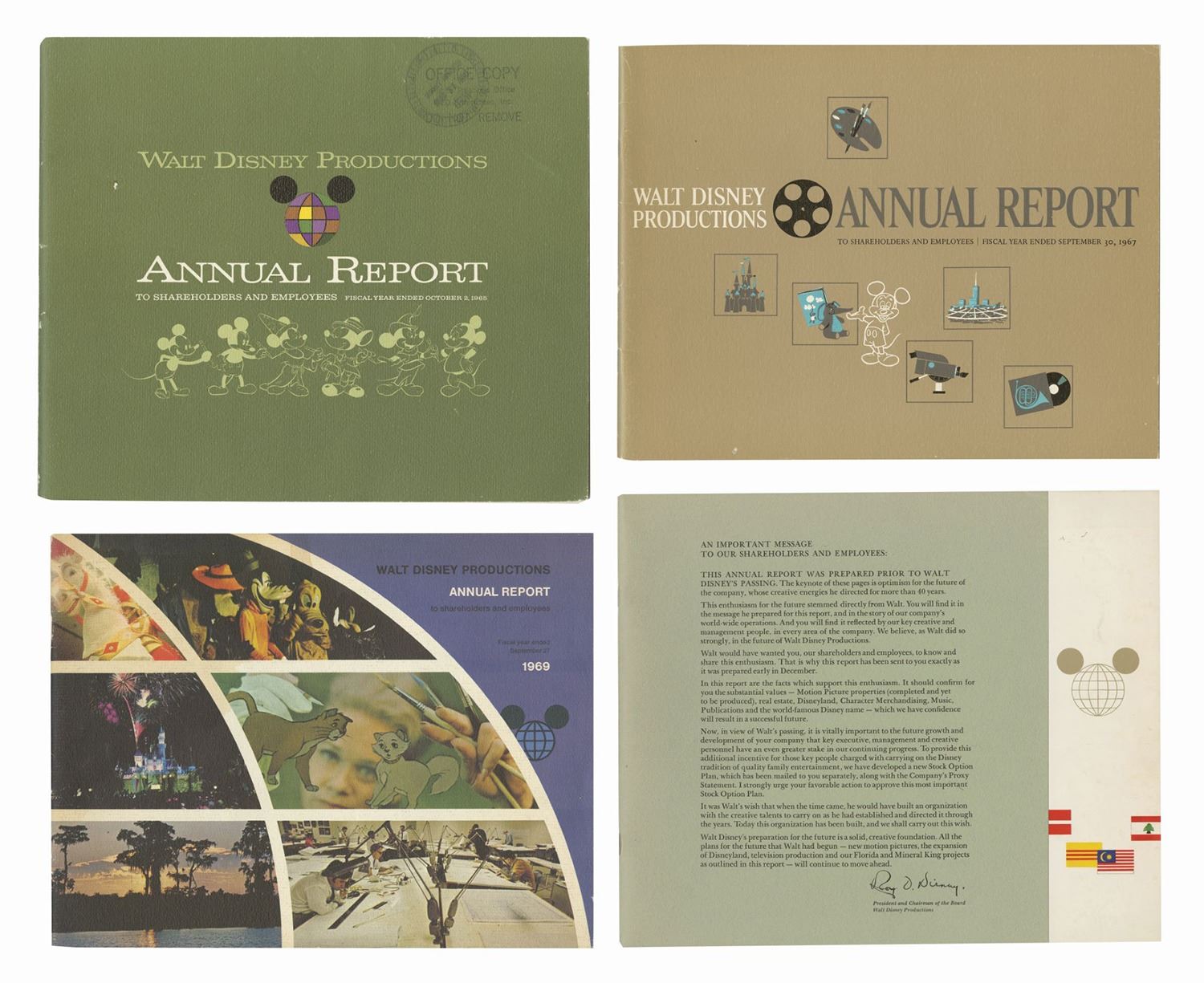 (Disney, 1965-69) A set of (4) annual reports from Walt Disney Productions. The reports were given to cast members and shareholders during the years 1965, 1966, 1967, and 1969. This period of time covers the years surrounding the death of Walt Disney, a milestone event for both cast members and shareholders as the company faced an uncertain future. The reports contain between 28-42 pages each, and measure between 8.75"x11.25" and 9.5"x11.25". The condition is very good with minor wear to the covers from use.