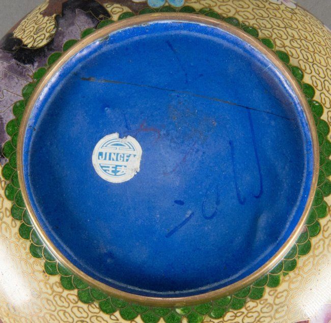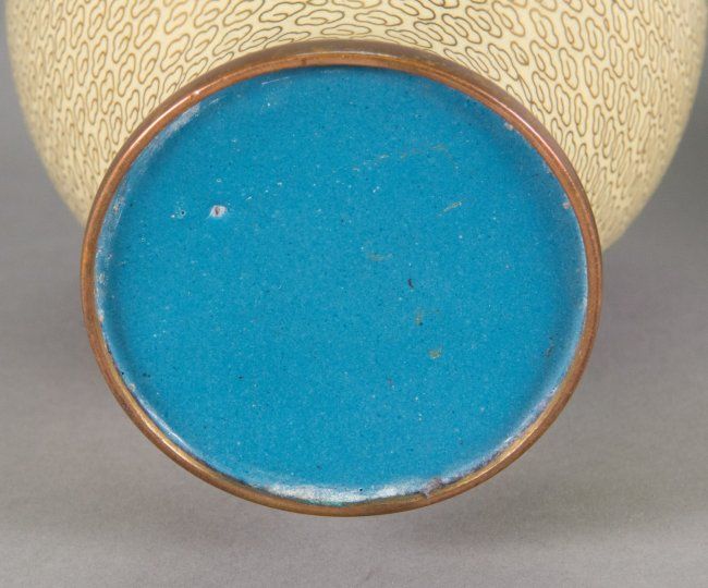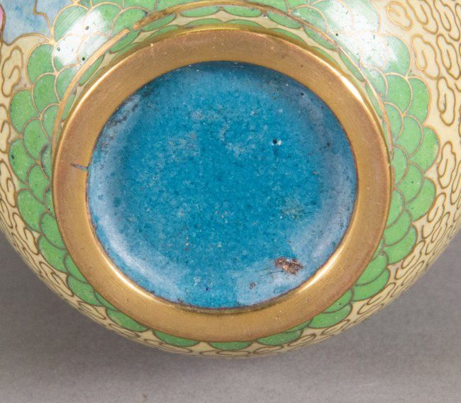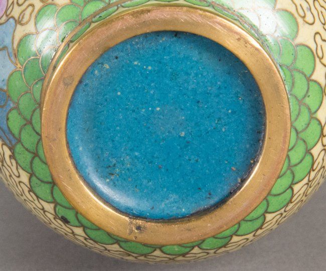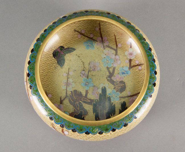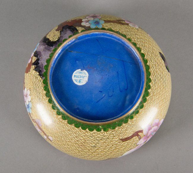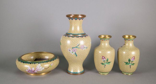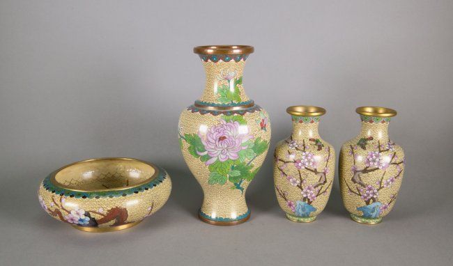Three Chinese bronze cloisonne vases and one Chinese bronze cloisonne bowl; of yellow ground; featuring various designs of plum blossoms; H: 6.5 cm, D: 14 cm, 582 grams (1); H: 16 cm, W: 8.5 cm, 309 grams (2); H: 24 cm, W: 12.5 cm, 677 grams (3); H: 15.5 cm, W: 9 cm, 319 grams (4)