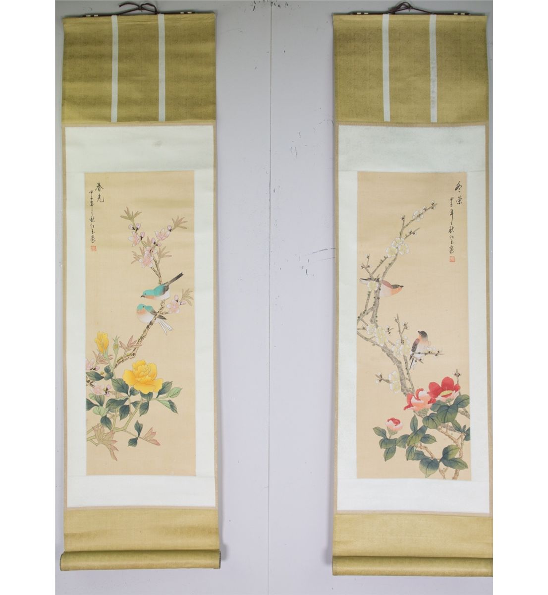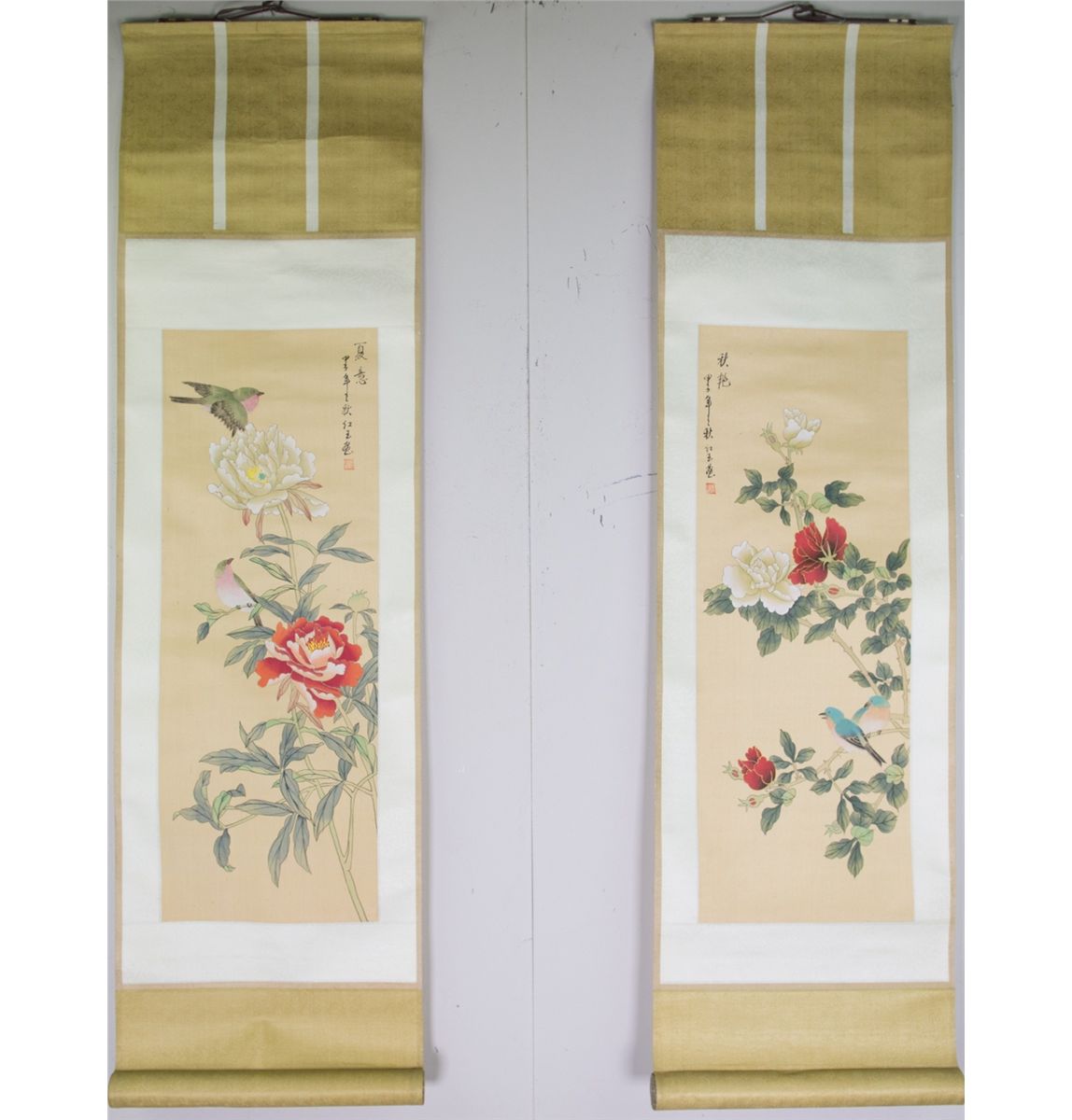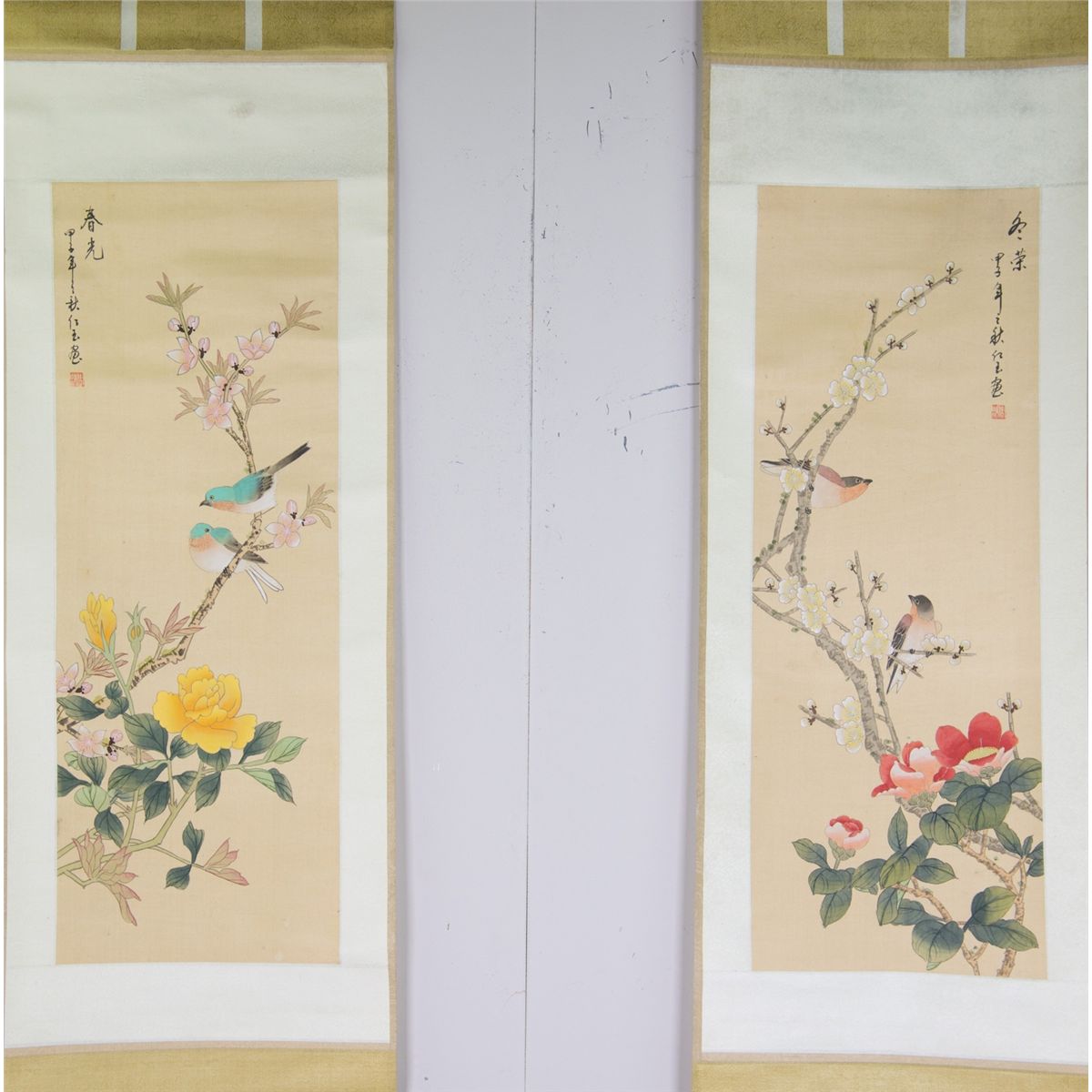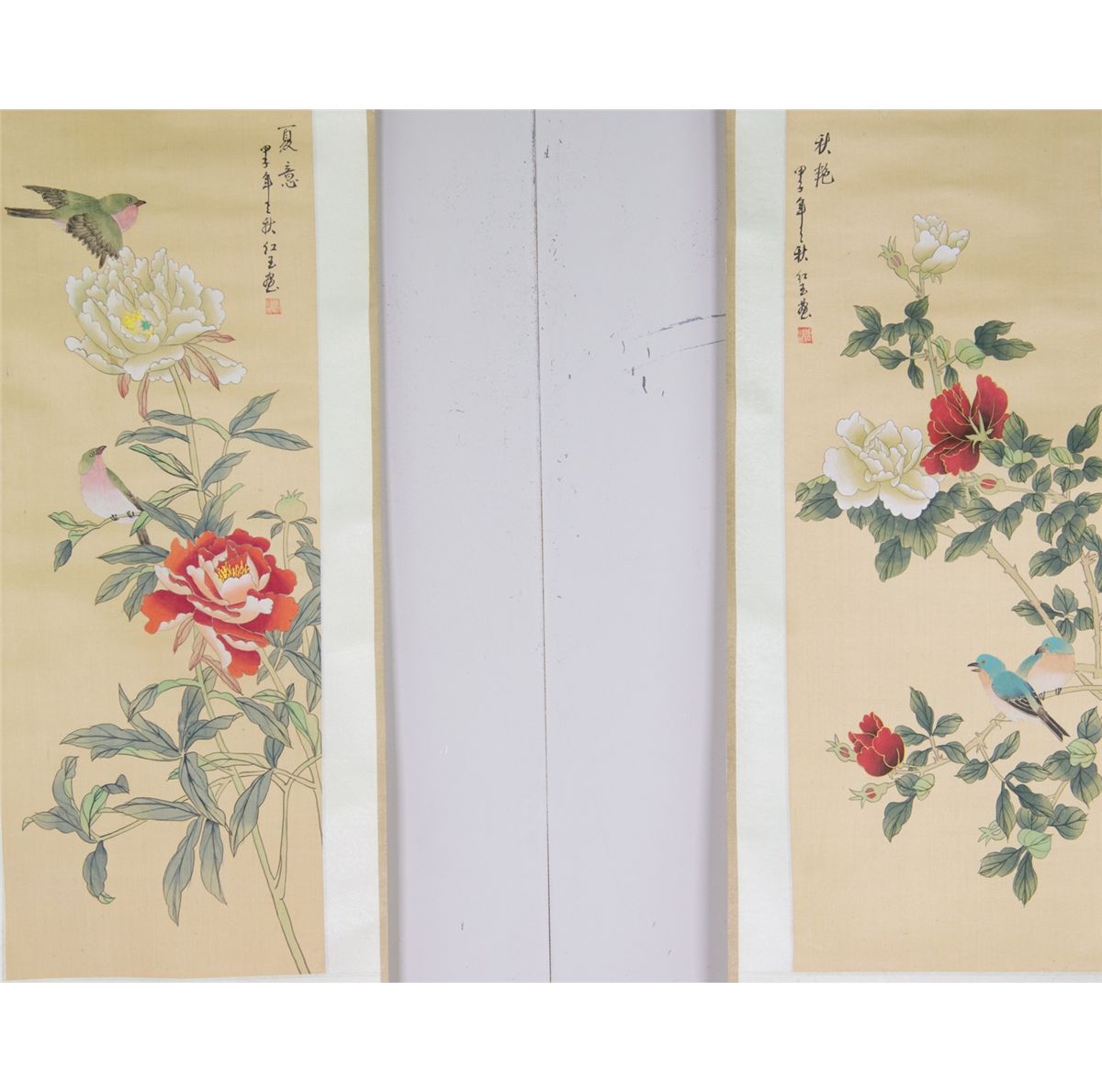 Flowers and birds; Set of four Chinese painting hanging scrolls; ink and watercolour on paper; signed and inscribed with one artist seal each; 59 cm x 21 cm each