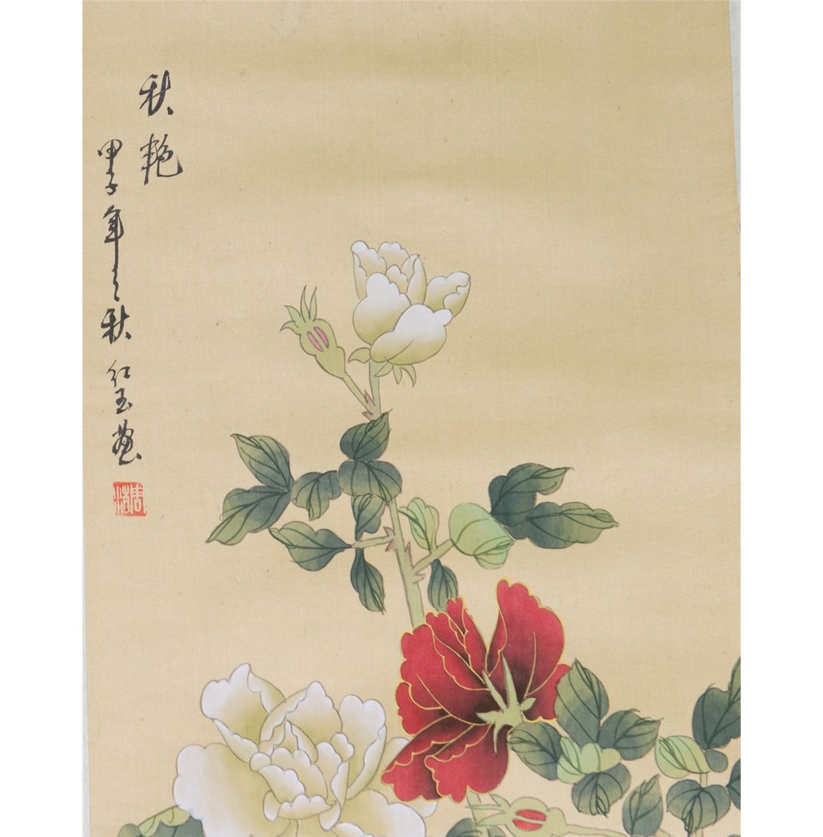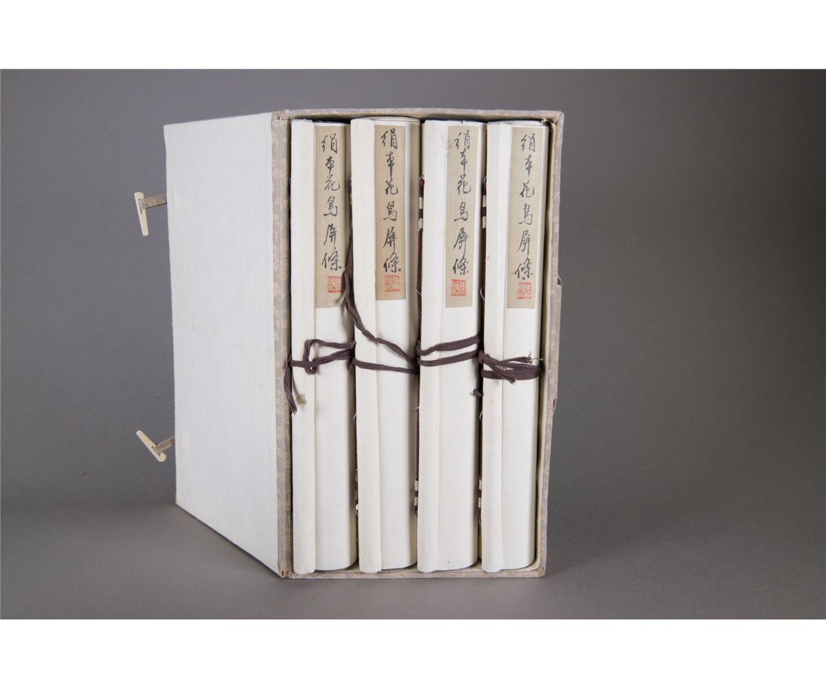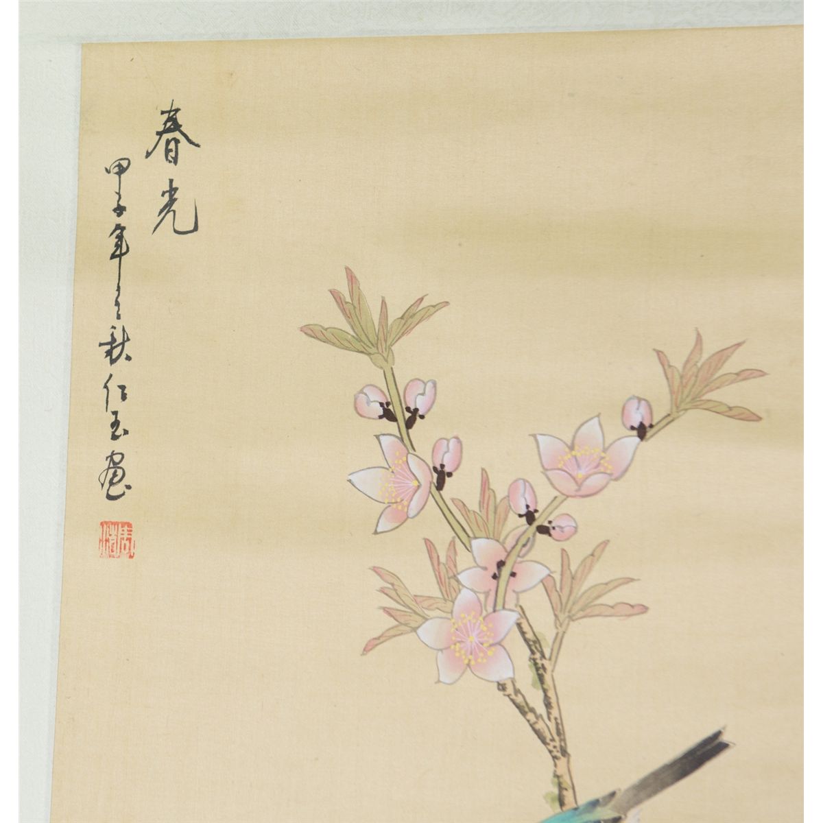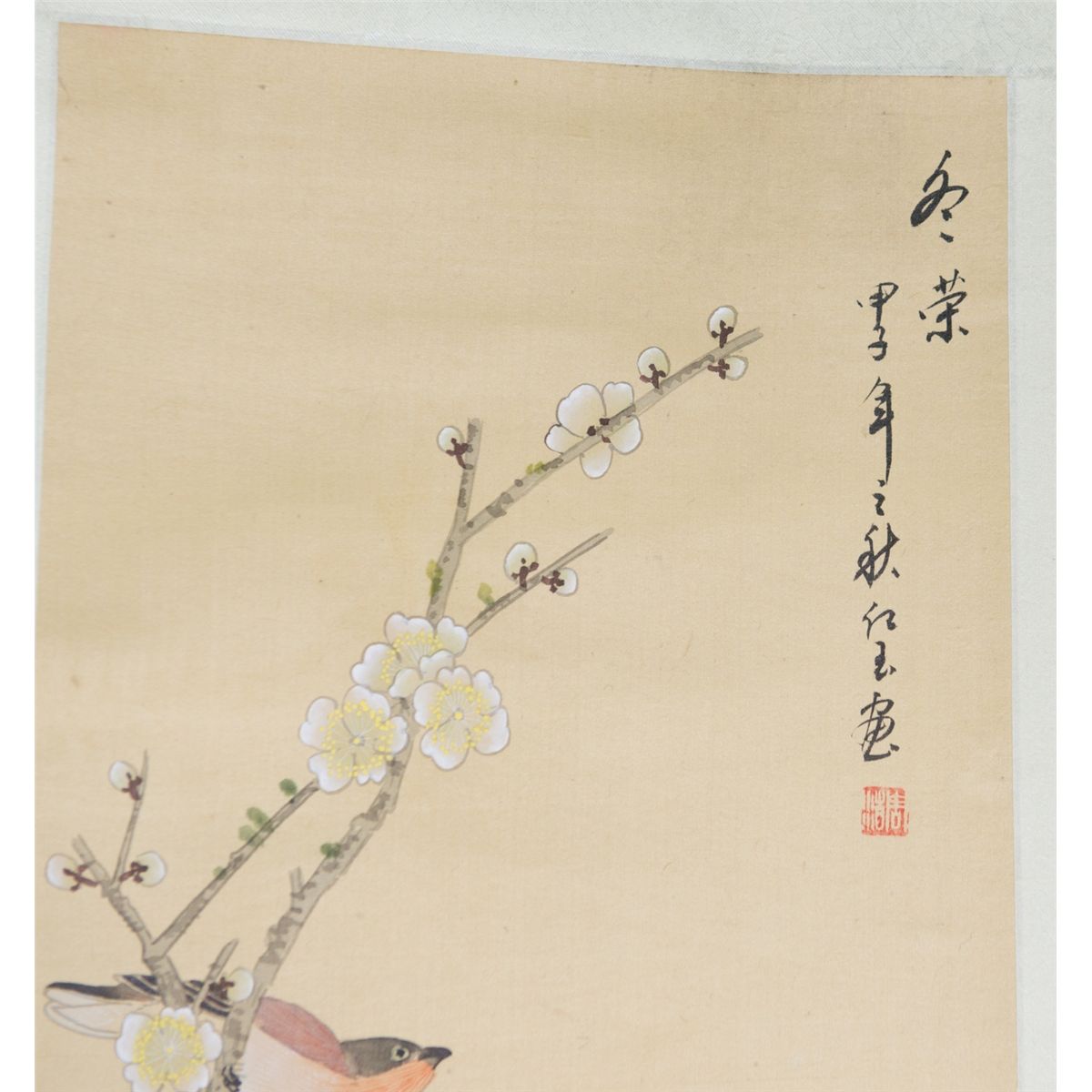 Flowers and birds; Set of four Chinese painting hanging scrolls; ink and watercolour on paper; signed and inscribed with one artist seal each; 59 cm x 21 cm each