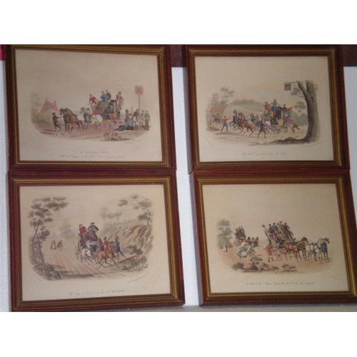 Set of 4 Colorful Prints London England. This set of 4 say London Published Jan 2, 1845 by Mefs & Fores 41 picadilly on the bottom right hand side. Also on left bottom side says C.B Newhouse dell. They are great old wooden frames, each one has a different saying. 1. says The drag is broke & we are on the bank. 2. Hold hard! You have forgot the lady. 3. No Time to lose Maam! The other coach close behind. 4. An unwelcome fare all that luggage by the mail! Quite Impossible. Really colored &detailed very nicely. They are 13" H X 16" W. Hope you like them. Great gift item also.