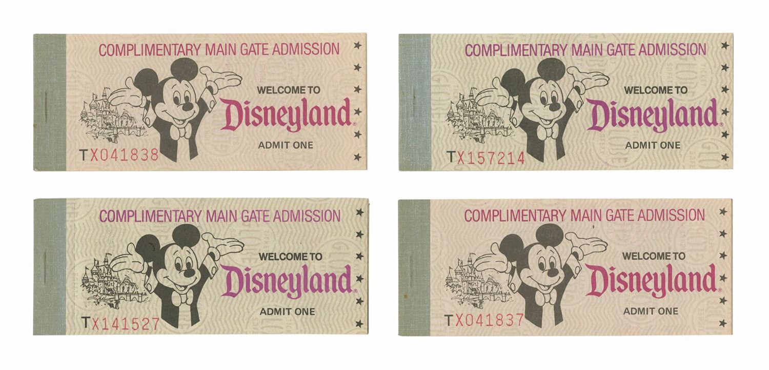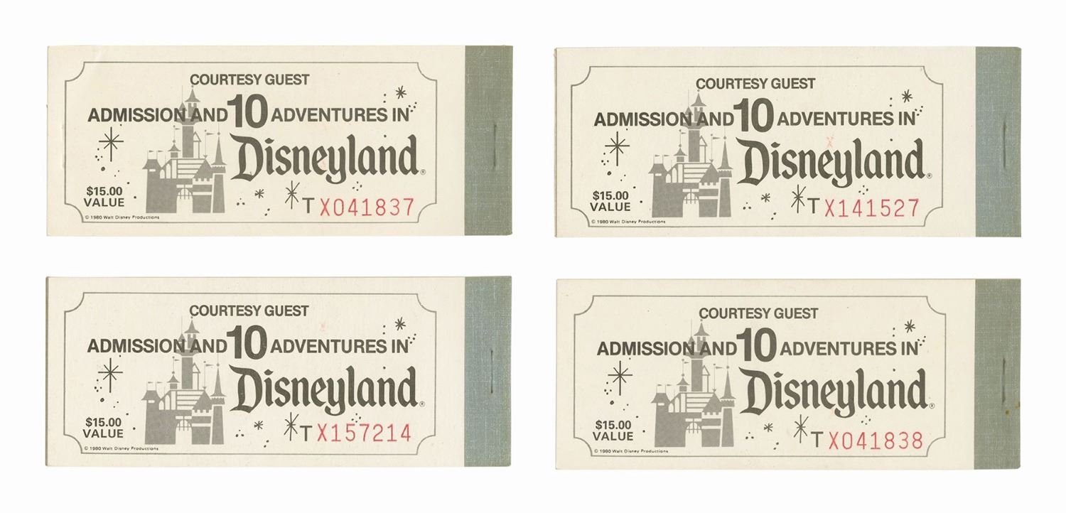 (Disneyland, 1980) A collection of (4) complete Disneyland complimentary main gate admission ticket books. The cover of each booklet is the main park admission ticket, and they contain 5 pages of perforated A-E attraction tickets with 2 per page. Since they remain intact, the books are still valid for Disneyland admission to this day. Measuring 2”x5” each, the booklets are in very good condition, exhibiting only minor handling.