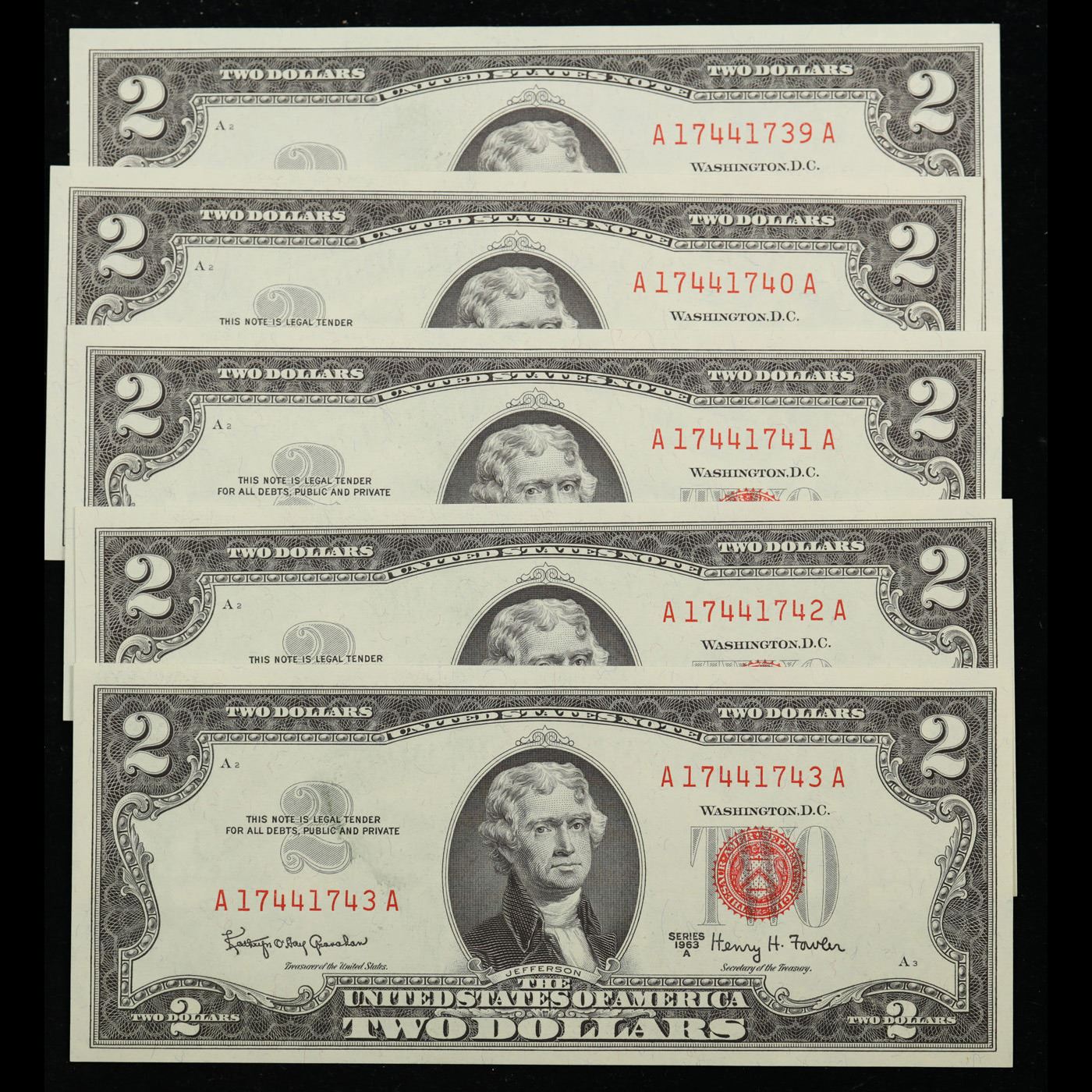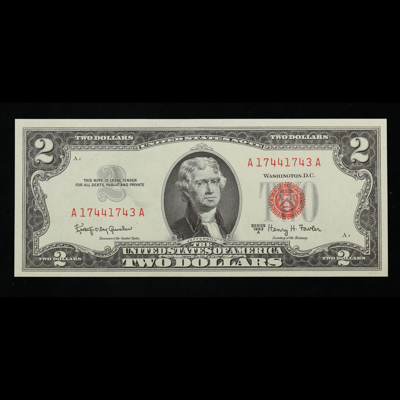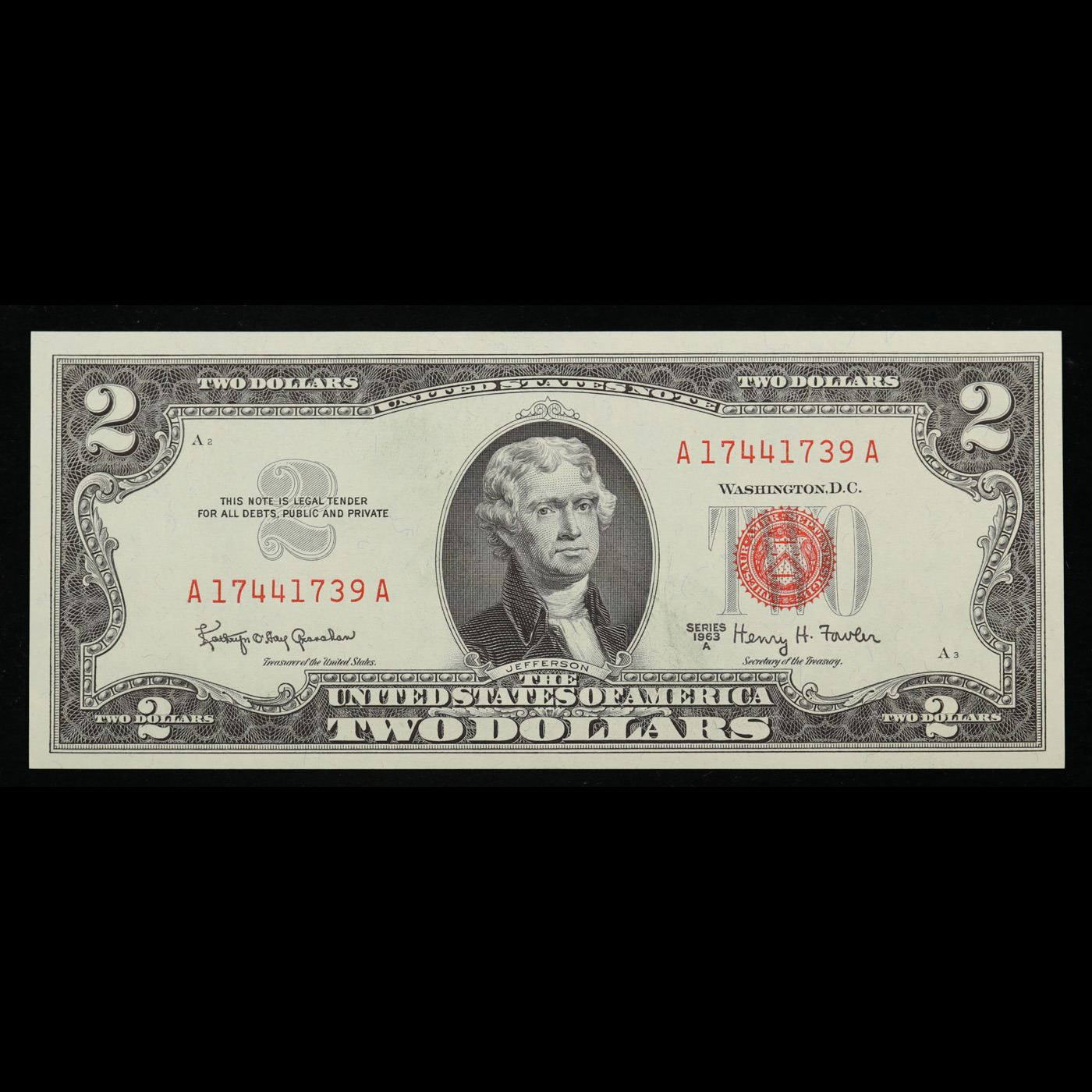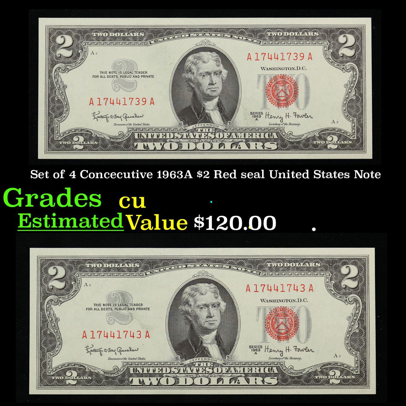 Set of 4 Concecutive 1963A $2 Red seal United States Note Grades CU. 1963 Legal Tender (United States Note). 1963 marks the last year that red seals were printed on two dollar bills. This is also the last year that Monticello was used on the back of two dollar bills. All two dollar bills from 1963 have a red seal on the right hand side of the bank note.